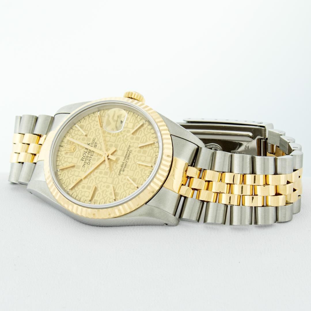 One Men's Rolex Two Tone 18K Yellow Gold And Stainless Steel Datejust Polished, Serviced & Electronically Tested, Yellow Gold & Stainless Steel Case: 36mm, 18K Yellow Gold Crown, Rolex Bezel: 18K Yellow Gold Fluted Bezel. Crystal: Sapphire With Magnified Date Window. Custom Hands: New Luminescent Hands. Rolex Movement: Automatic Winding Movement 3135. Rolex Dial: Champagne Jubilee Dial With Index Hour Markers and Track With Lumi Dots. Date Window: 3 O'Clock Position Date Display, Quickset, Model: Datejust. Condition: G-6 Extra Fine. Rolex Bracelet: Two Tone 18K Yellow Gold & Stainless Steel Jubilee Band. Bright Polish. 7.0 Inch Length, Adjustable. Standard Clasp, With Rolex Logo. This Watch Has Been Serviced Time Tested And Is In Excellent Condition It Is Free Of All Scratches And Dents.