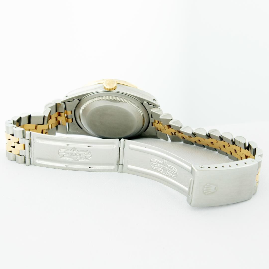 One Men's Rolex Quickset Pre Owned Two Tone 14K Yellow Gold And Stainless Steel Datejust Polished, Serviced & Electronically Tested, Rolex Yellow Gold & Stainless Steel Case: 36mm, Rolex 14K Yellow Gold Crown, Custom Bezel: New 18K Yellow Gold Pyramid Diamond Bezel, Diamond Count: 24 Diamonds, Total Weight .75 Carat, Clarity: SI-VS, Color: G to H. Custom Crystal: New Sapphire With Magnified Date Window. Custom Hands: New Luminescent Hands. Rolex Movement: Automatic Winding Movement 3035. Rolex Dial: Champagne Jubilee Dial With Index Hour Markers and Small Track With Lumi Dots. Date Window: 3 O'Clock Position Date Display, Quickset, Model: Datejust. Condition: G-6 Extra Fine. Rolex Bracelet: Two Tone 14K Yellow Gold & Stainless Steel Jubilee Band. Bright Polish. 7.0 Inch Length, Adjustable. Standard Clasp, With Rolex Logo. This Watch Has Been Serviced Time Tested And Is In Excellent Condition It Is Free Of All Scratches And Dents.