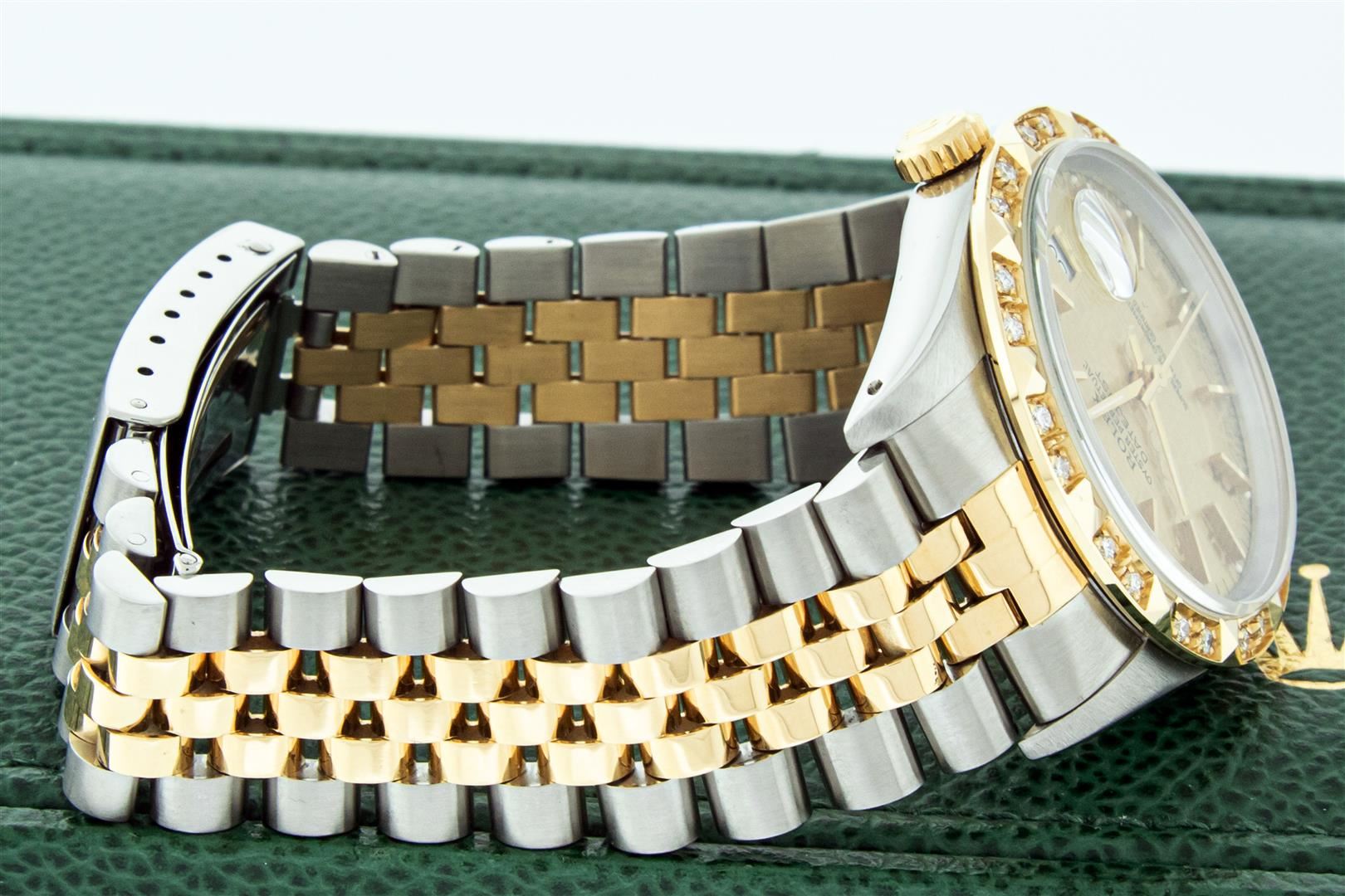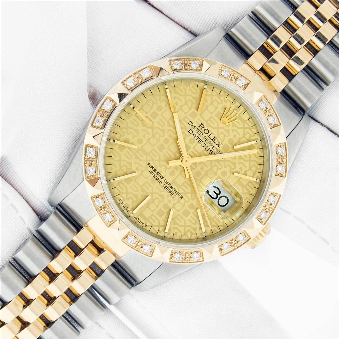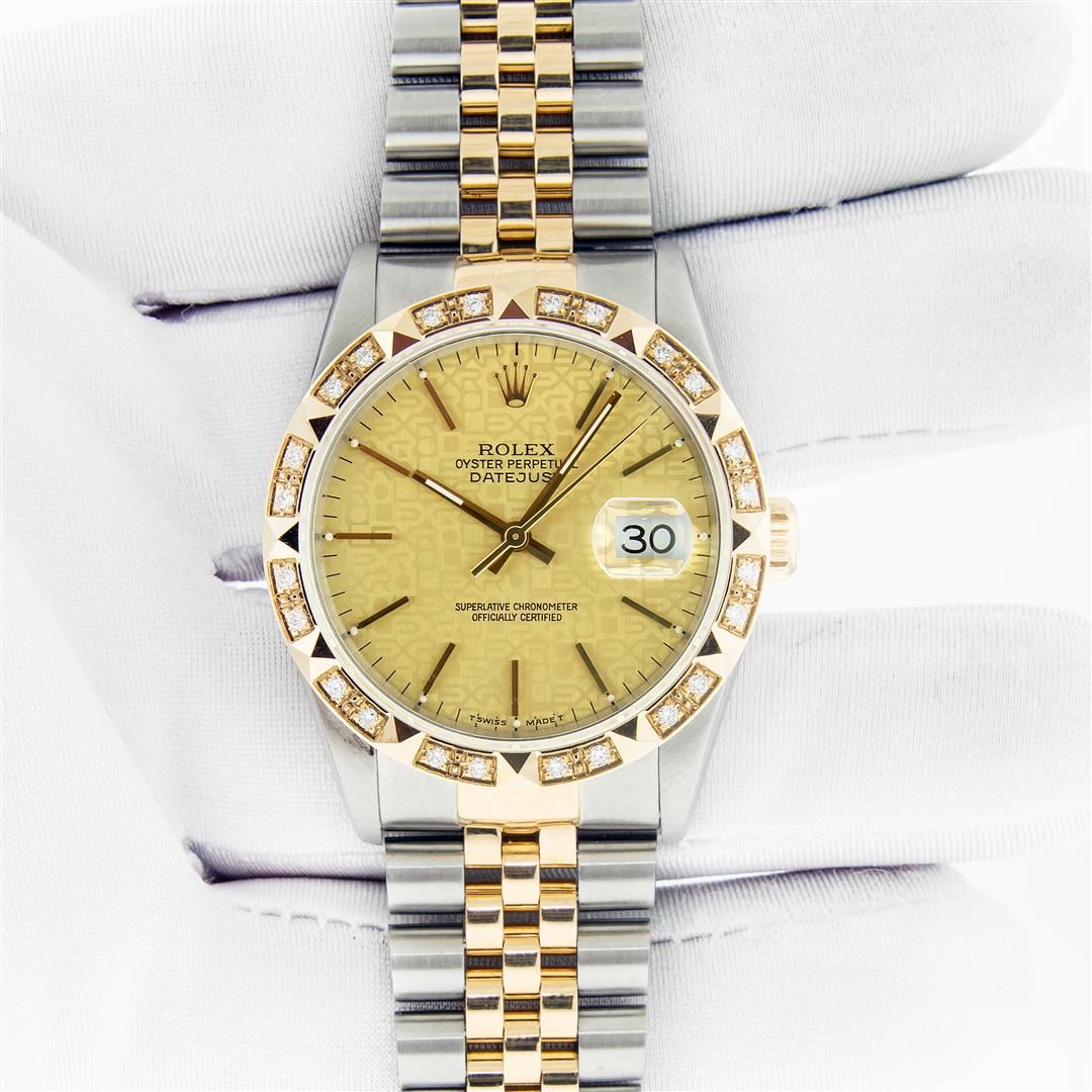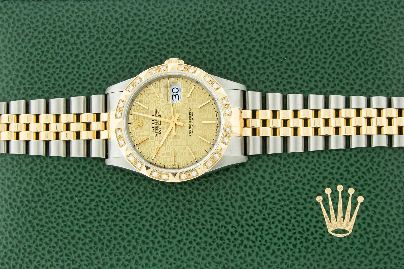 One Men's Pre Owned Yellow Gold Two Tone Rolex Datejust Polished, Serviced & Electronically Tested, Rolex Yellow Gold & Stainless Steel Case: 36mm, Rolex 14K Yellow Gold Crown, Custom Bezel: New 18K Yellow Gold Pyramid Diamond Bezel, Diamond Count: 24 Diamonds, Total Weight .75 Carat, Clarity: SI-VS, Color: G to H. Custom Crystal: New Sapphire With Magnified Date Window. Custom Hands: New Luminescent Hands. Rolex Movement: Automatic Winding Movement. Rolex Dial: Champagne Jubilee Dial With Index Hour Markers and Small Track With Lumi Dots. Date Window: 3 O'clock Position Date Display, Quickset, Model: Datejust. Condition: G-6 Extra Fine. Rolex Bracelet: Two Tone Yellow Gold & Stainless Steel Jubilee Band. Bright Polish. 7.0 Inch Length, Adjustable. Standard Clasp, With Rolex Logo. This Pre Owned Watch Has Been Serviced Time Tested And Is In Excellent Condition It Is Free Of All Scratches And Dents. This Watch Comes With A Rolex Box.