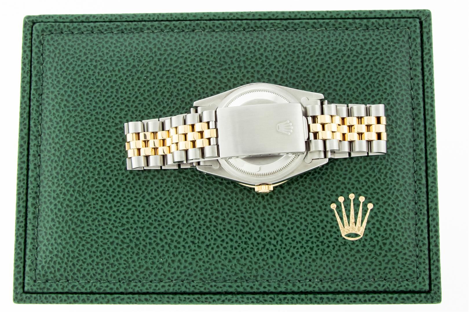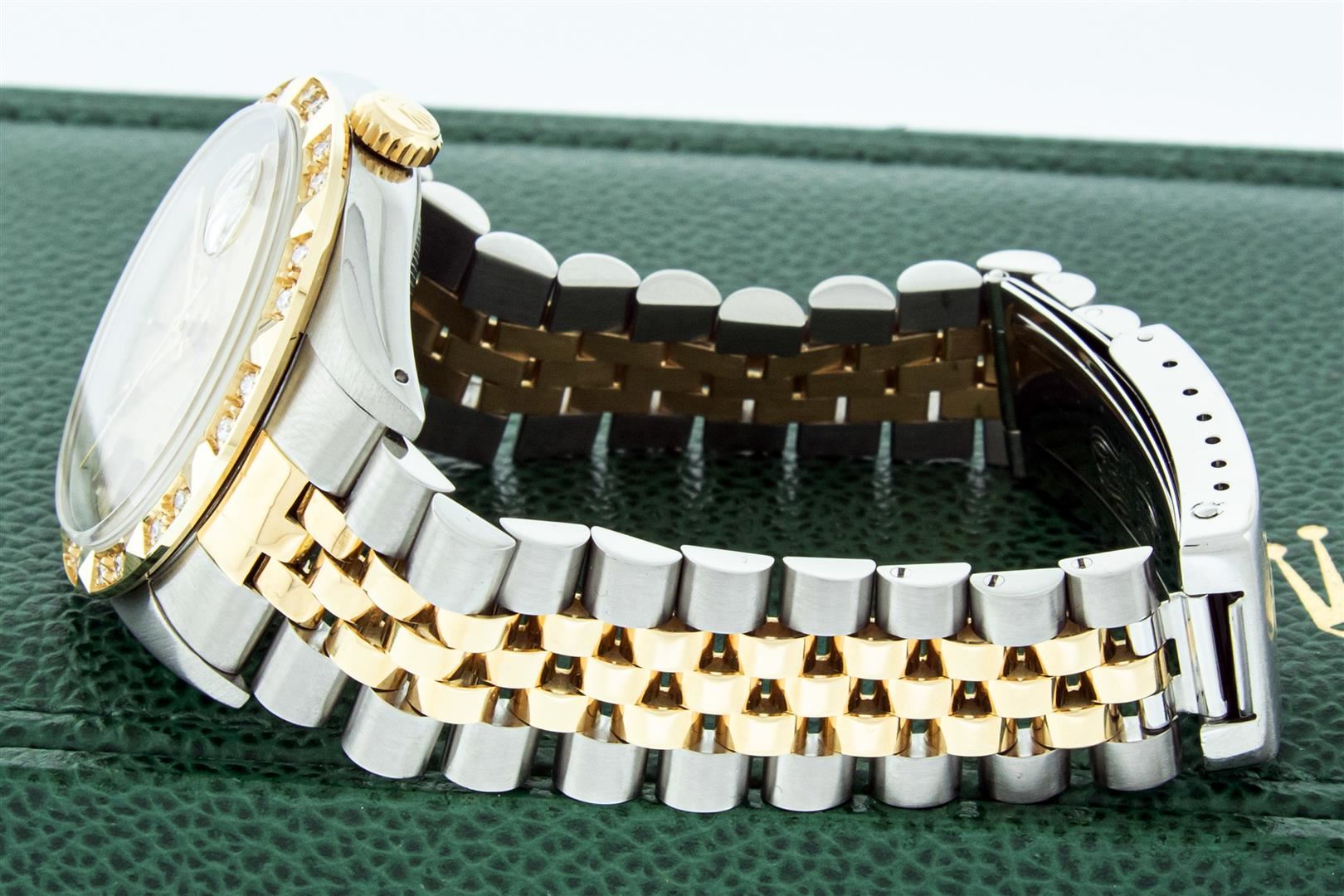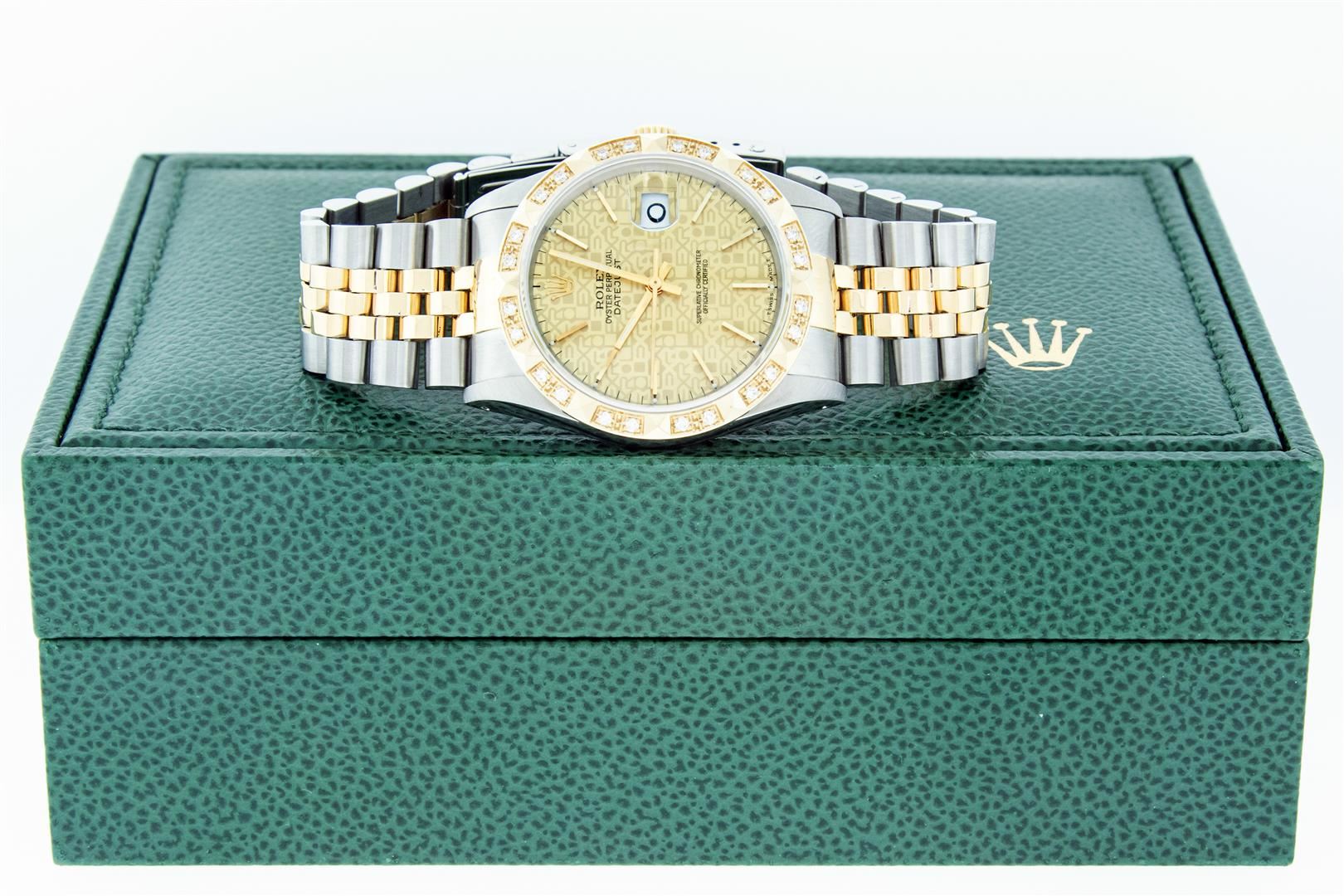 One Men's Pre Owned Yellow Gold Two Tone Rolex Datejust Polished, Serviced & Electronically Tested, Rolex Yellow Gold & Stainless Steel Case: 36mm, Rolex 14K Yellow Gold Crown, Custom Bezel: New 18K Yellow Gold Pyramid Diamond Bezel, Diamond Count: 24 Diamonds, Total Weight .75 Carat, Clarity: SI-VS, Color: G to H. Custom Crystal: New Sapphire With Magnified Date Window. Custom Hands: New Luminescent Hands. Rolex Movement: Automatic Winding Movement. Rolex Dial: Champagne Jubilee Dial With Index Hour Markers and Small Track With Lumi Dots. Date Window: 3 O'clock Position Date Display, Quickset, Model: Datejust. Condition: G-6 Extra Fine. Rolex Bracelet: Two Tone Yellow Gold & Stainless Steel Jubilee Band. Bright Polish. 7.0 Inch Length, Adjustable. Standard Clasp, With Rolex Logo. This Pre Owned Watch Has Been Serviced Time Tested And Is In Excellent Condition It Is Free Of All Scratches And Dents. This Watch Comes With A Rolex Box.