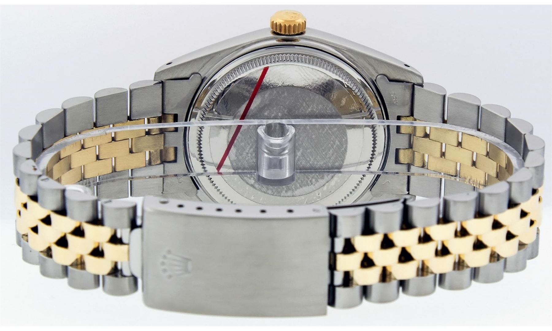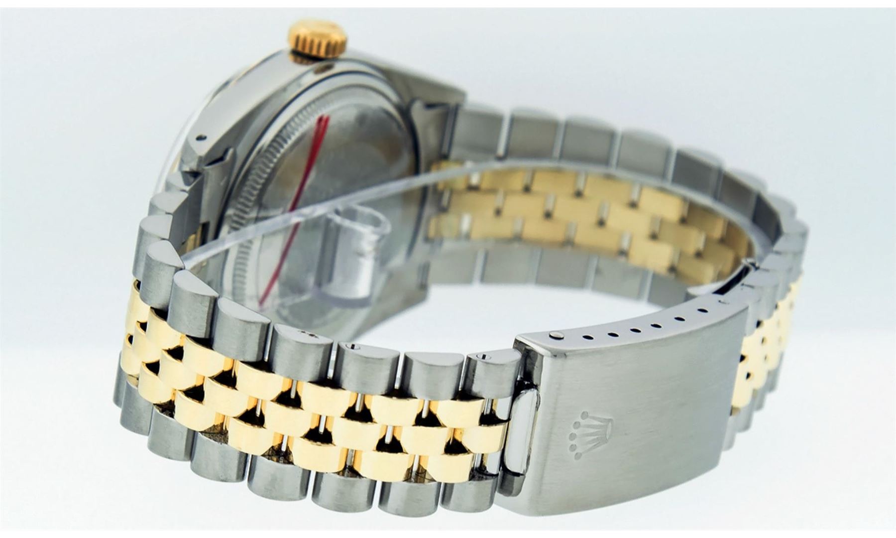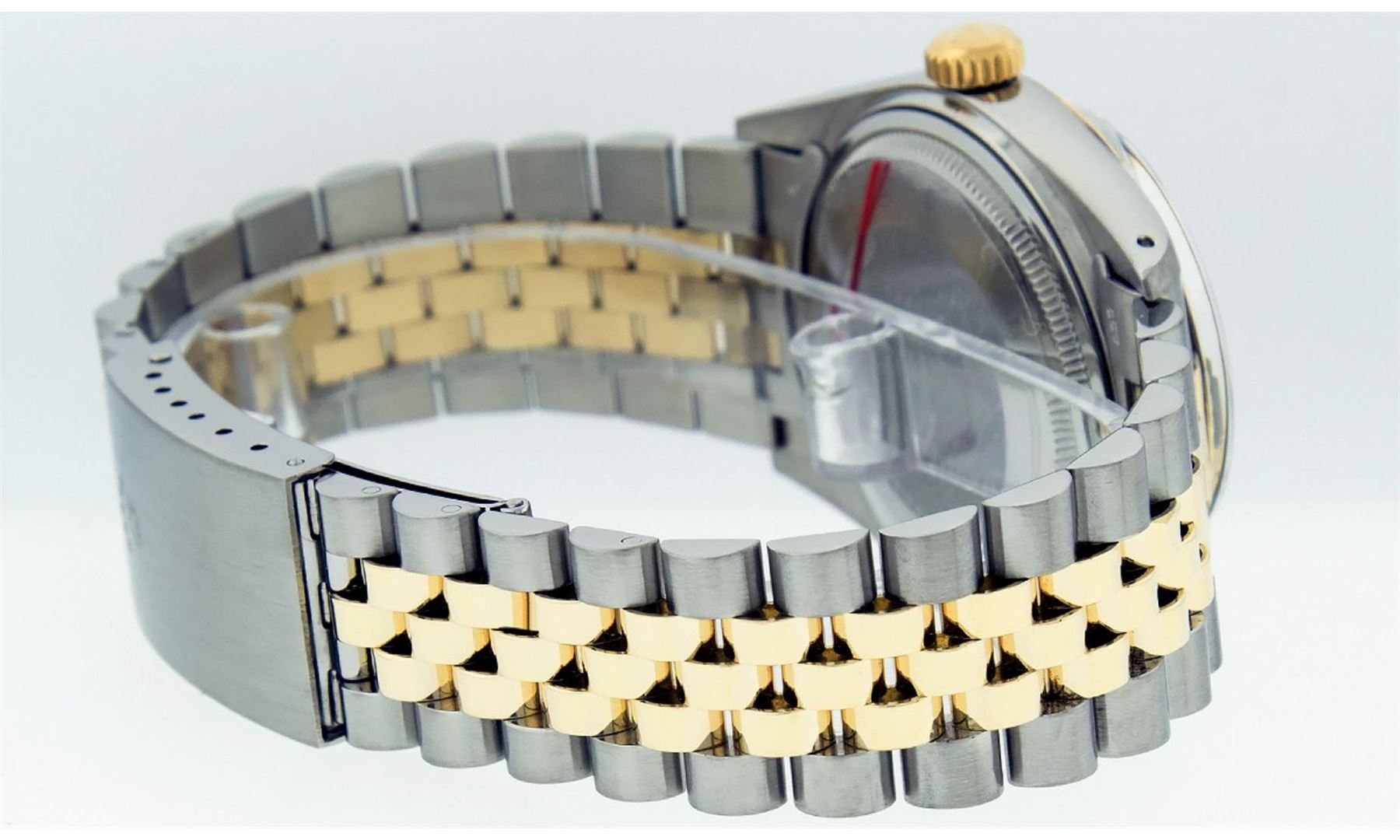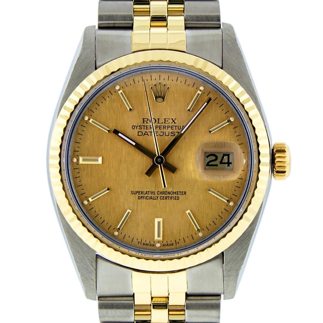 One Men's Rolex Pre Owned Quickset Two Tone 14K Yellow Gold And Stainless Steel Datejust Polished, Serviced & Electronically Tested, Yellow Gold & Stainless Steel Case: 36mm, Yellow Gold Crown, Rolex Bezel: 14K Yellow Gold Fluted Bezel. Custom Crystal: New Acrylic With Magnified Date Window. Hands: Luminescent Hands. Rolex Movement: Automatic Winding Movement 3035. Rolex Dial: Champagne Linen Dial With Index Hour Markers and Small Track With Lumi Dots. Date Window: 3 O'Clock Position Date Display, Quickset, Model: Datejust. Condition: G-6 Extra Fine. Rolex Bracelet: Two Tone 14K Yellow Gold & Stainless Steel Jubilee Band. Bright Polish. 7.0 Inch Length, Adjustable. Standard Clasp, With Rolex Logo. This Watch Has Been Serviced Time Tested And Is In Excellent Condition It Is Free Of All Scratches And Dents.