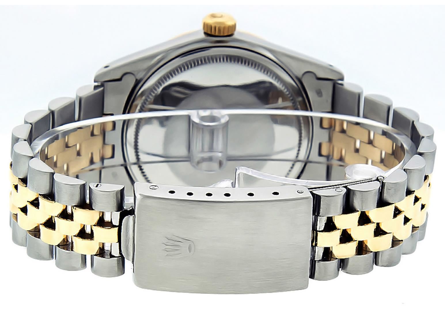One Men's Rolex Pre Owned 14K Two Tone Yellow Gold And Stainless Steel Datejust Polished, Serviced & Electronically Tested, Rolex Yellow Gold & Stainless Steel Case: 36mm, Rolex Yellow Gold Crown, Rolex Bezel: 14K Yellow Gold Fluted Bezel. Custom Crystal: New Acrylic With Magnified Date Window. Custom Hands: New Luminescent Hands. Rolex Movement: Automatic Winding Movement 3035. Rolex Dial: Champagne Tapestry Index Dial With Roman Square Track. Date Window: 3 O'Clock Position Date Display, Quickset, Model: Datejust. Condition: G-6 Extra Fine. Rolex Bracelet: Two Tone 14K Yellow Gold & Stainless Steel Jubilee Band. Bright Polish. 7.0 Inch Length, Adjustable. Standard Clasp, With Rolex Logo. This Watch Has Been Serviced Time Tested And Is In Excellent Condition It Is Free Of All Scratches And Dents.