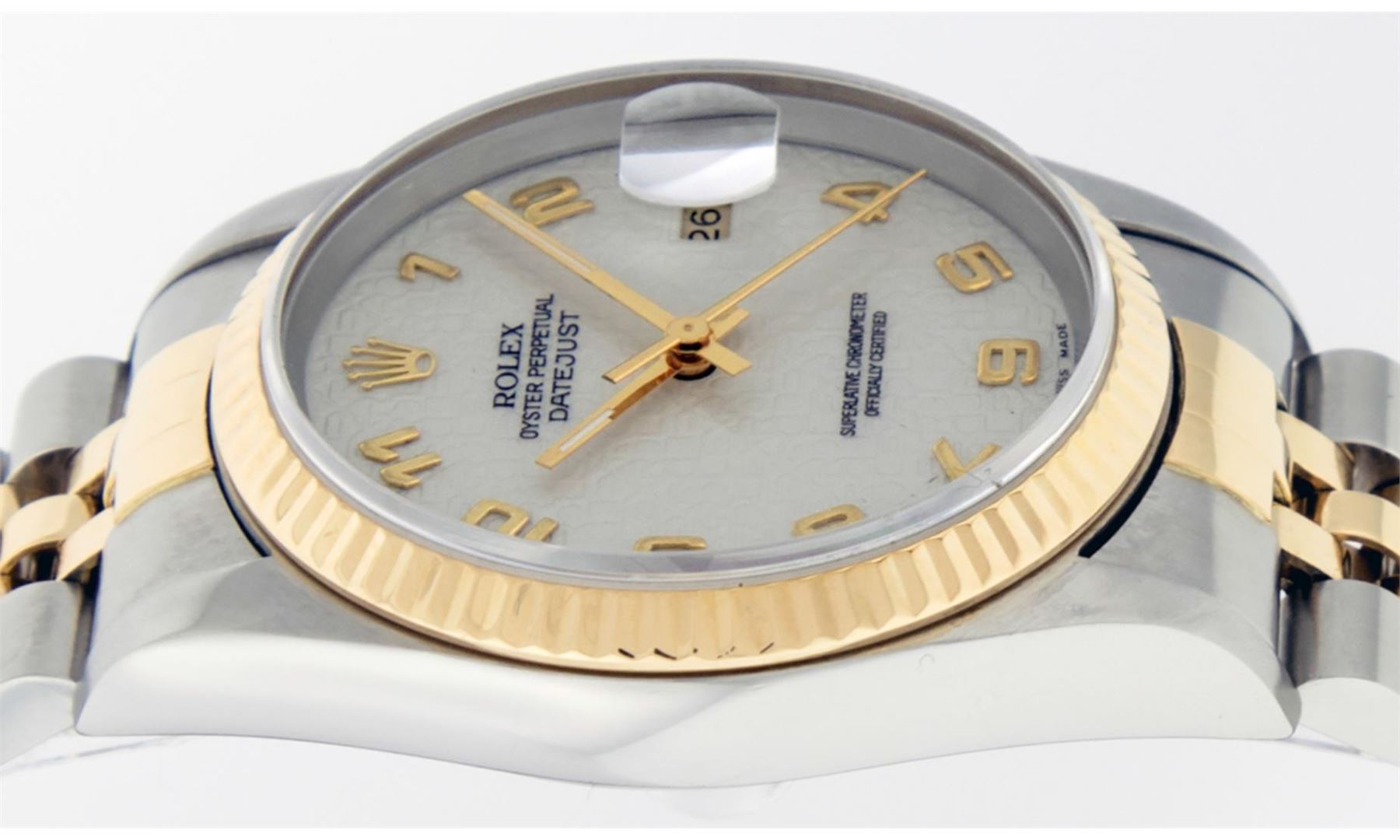 One Men's Rolex Two Tone 18K Yellow Gold And Stainless Steel Datejust Polished, Serviced & Electronically Tested, Yellow Gold & Stainless Steel Case: 36mm, 18K Yellow Gold Crown, Rolex Bezel: 18K Yellow Gold Fluted Bezel. Crystal: Sapphire With Magnified Date Window. Custom Hands: New Luminescent Hands. Rolex Movement: Automatic Winding Movement 3135. Rolex Dial: Cream Jubilee Dial With Arabic Hour Markers. Date Window: 3 O'Clock Position Date Display, Quickset, Model: Datejust. Condition: G-6 Extra Fine. Rolex Bracelet: Two Tone 18K Yellow Gold & Stainless Steel Jubilee Band. Bright Polish. 7.0 Inch Length, Adjustable. Standard Clasp, With Rolex Logo. This Watch Has Been Serviced Time Tested And Is In Excellent Condition It Is Free Of All Scratches And Dents.