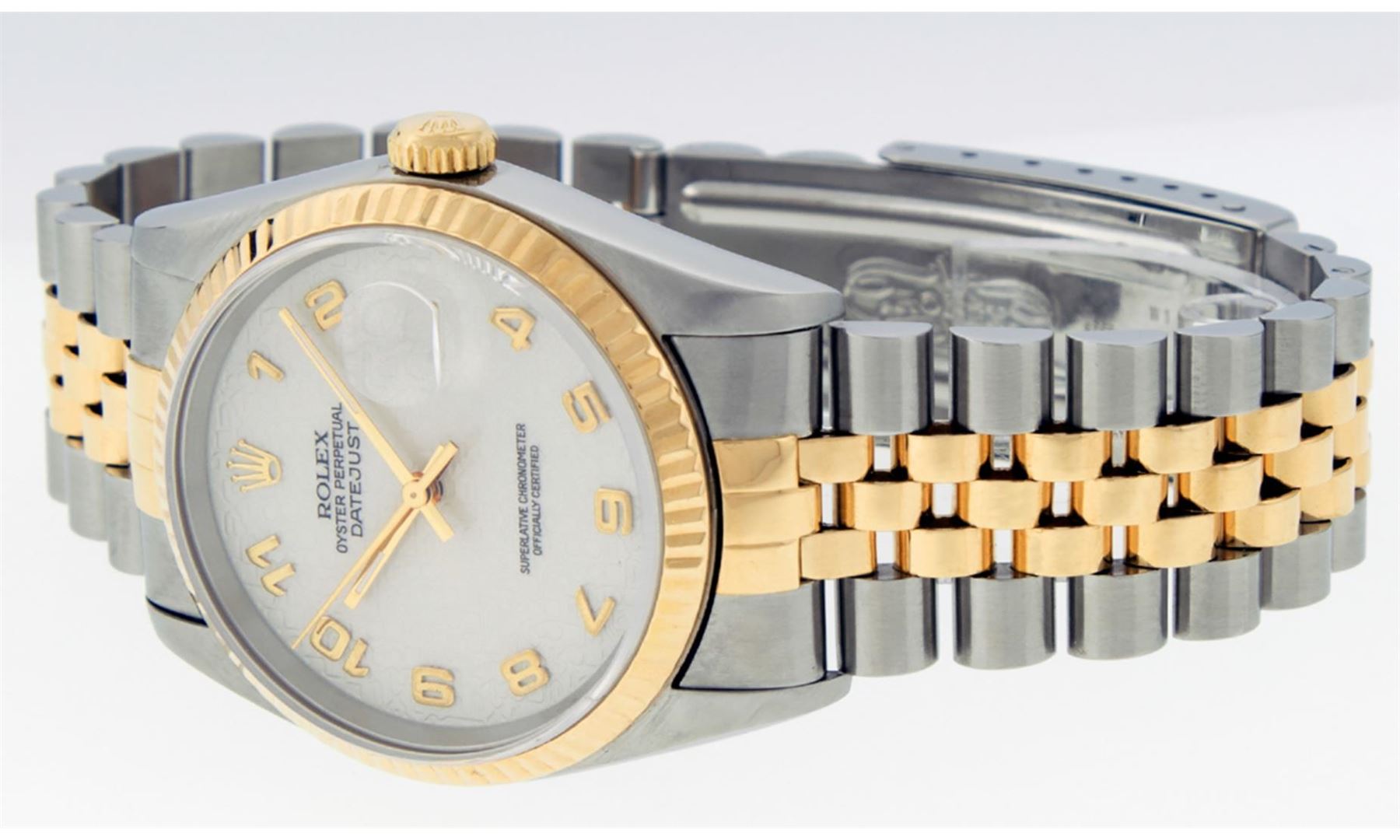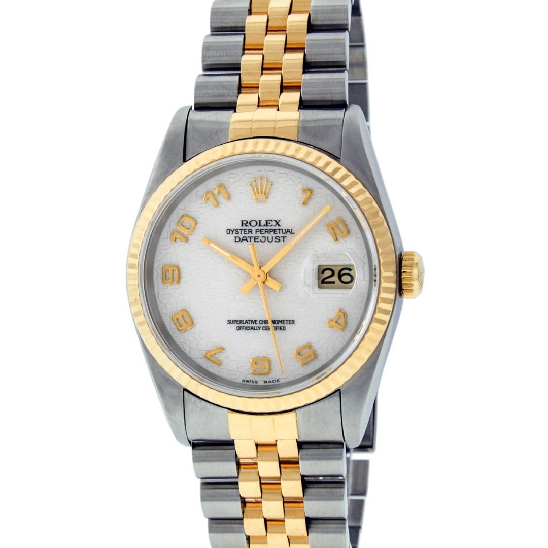 One Men's Rolex Two Tone 18K Yellow Gold And Stainless Steel Datejust Polished, Serviced & Electronically Tested, Yellow Gold & Stainless Steel Case: 36mm, 18K Yellow Gold Crown, Rolex Bezel: 18K Yellow Gold Fluted Bezel. Crystal: Sapphire With Magnified Date Window. Custom Hands: New Luminescent Hands. Rolex Movement: Automatic Winding Movement 3135. Rolex Dial: Cream Jubilee Dial With Arabic Hour Markers. Date Window: 3 O'Clock Position Date Display, Quickset, Model: Datejust. Condition: G-6 Extra Fine. Rolex Bracelet: Two Tone 18K Yellow Gold & Stainless Steel Jubilee Band. Bright Polish. 7.0 Inch Length, Adjustable. Standard Clasp, With Rolex Logo. This Watch Has Been Serviced Time Tested And Is In Excellent Condition It Is Free Of All Scratches And Dents.