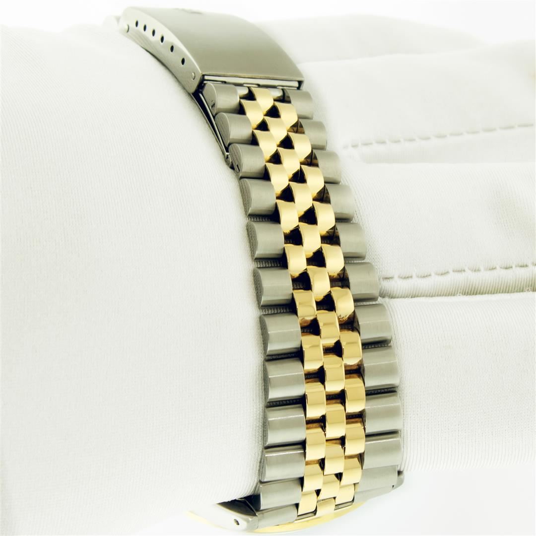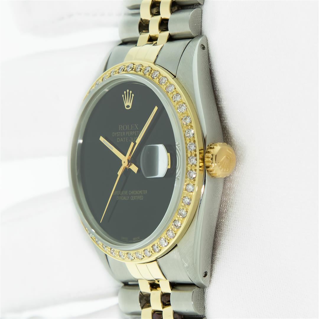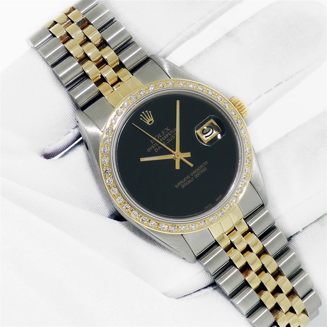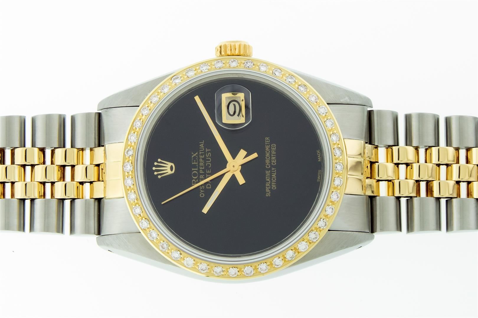 One Men's Yellow Gold Two Tone Rolex Datejust Polished, Serviced & Electronically Tested, Rolex Yellow Gold & Stainless Steel Case: 36mm, Rolex Yellow Gold Crown, Custom Bezel: New 18K Yellow Gold Beadset Diamond Bezel, Diamond Count: 44 Diamonds, Clarity: SI-VS, Color: G to H. Custom Crystal: New Sapphire with Date Window. Custom Hands: New Luminescent Hands. Rolex Movement: Automatic Winding Movement. Custom Dial: Black Onyx. Date Window: 3 O'Clock Position Date Display, Quickset, Model: Datejust. Condition: G-6 Extra Fine. Rolex Bracelet: Two Tone Yellow Gold & Stainless Steel Jubilee. Bright Polish. 7.0 Inch Length, Adjustable. Standard Clasp, with Rolex Logo. This Pre Owned Watch Has Been Serviced Time Tested And Is In Excellent Condition It Is Free Of All Scratches And Dents.
