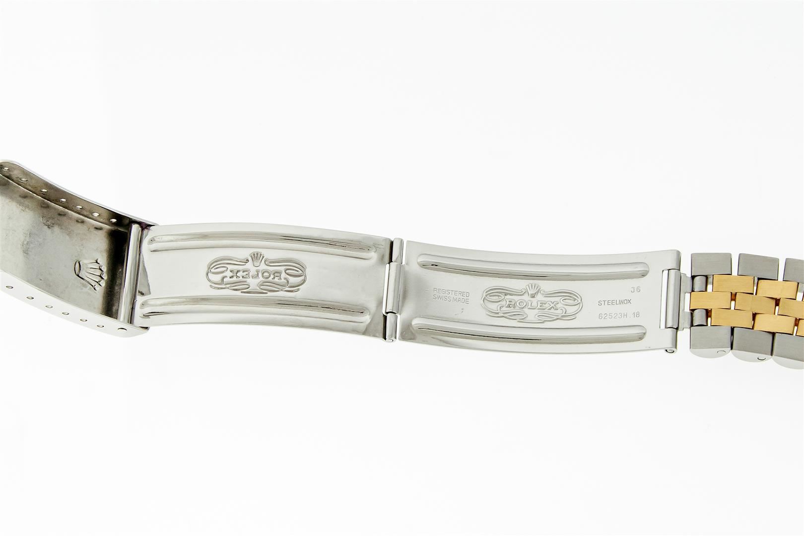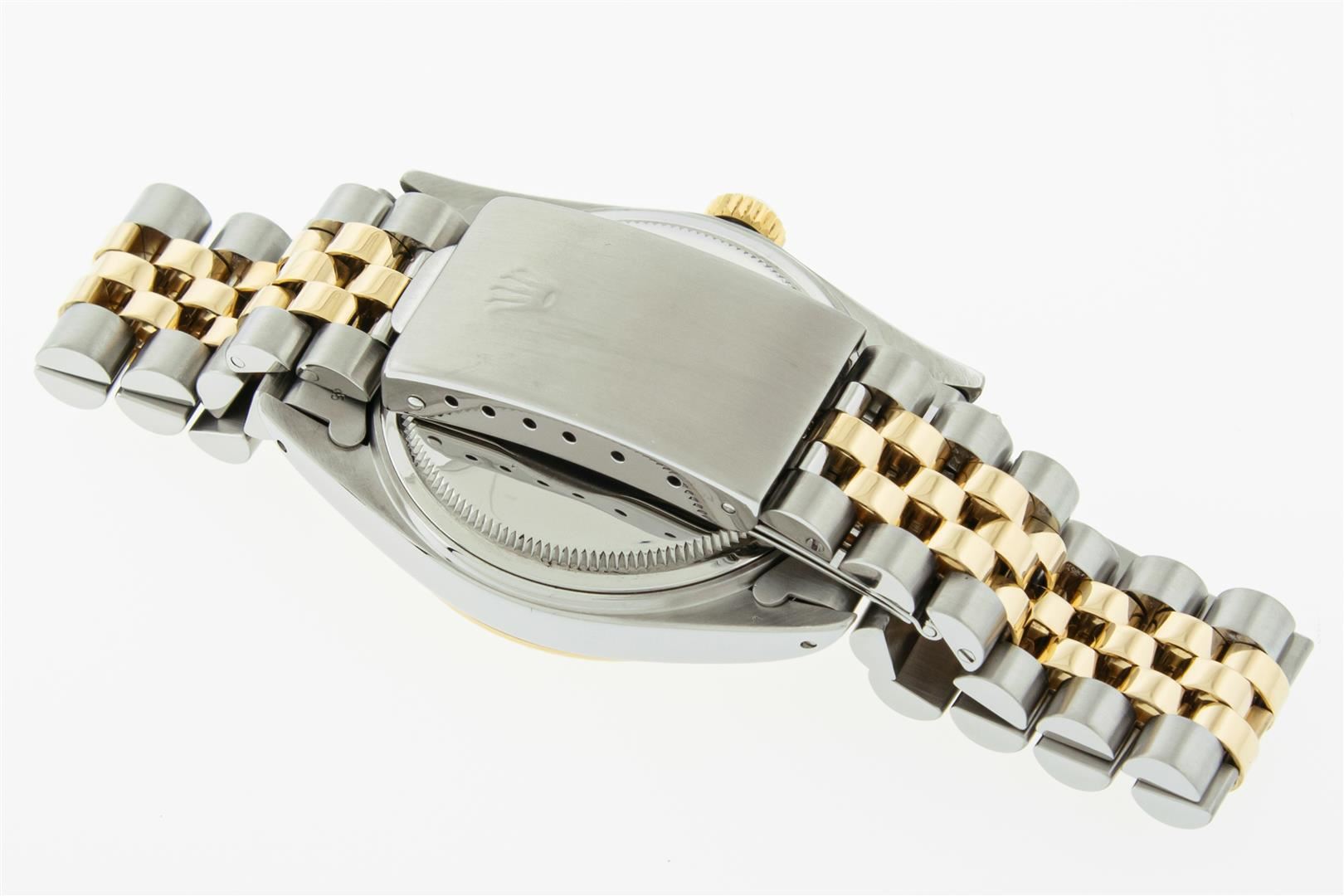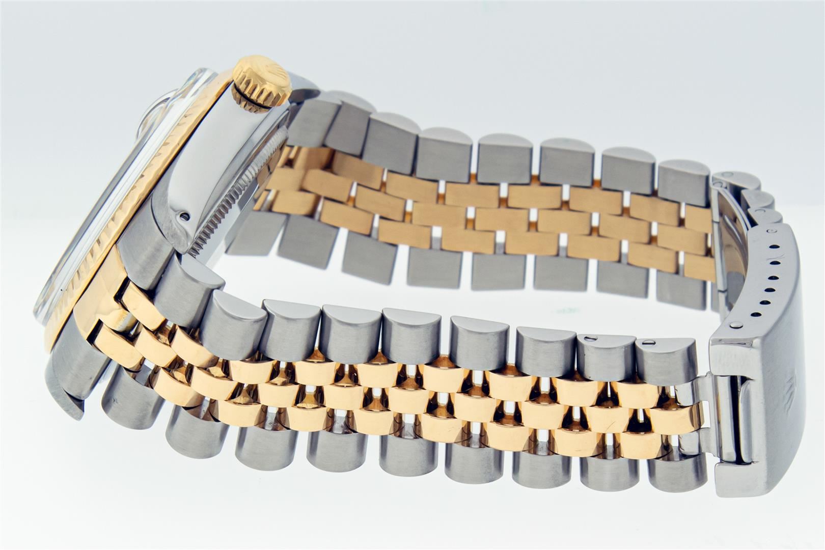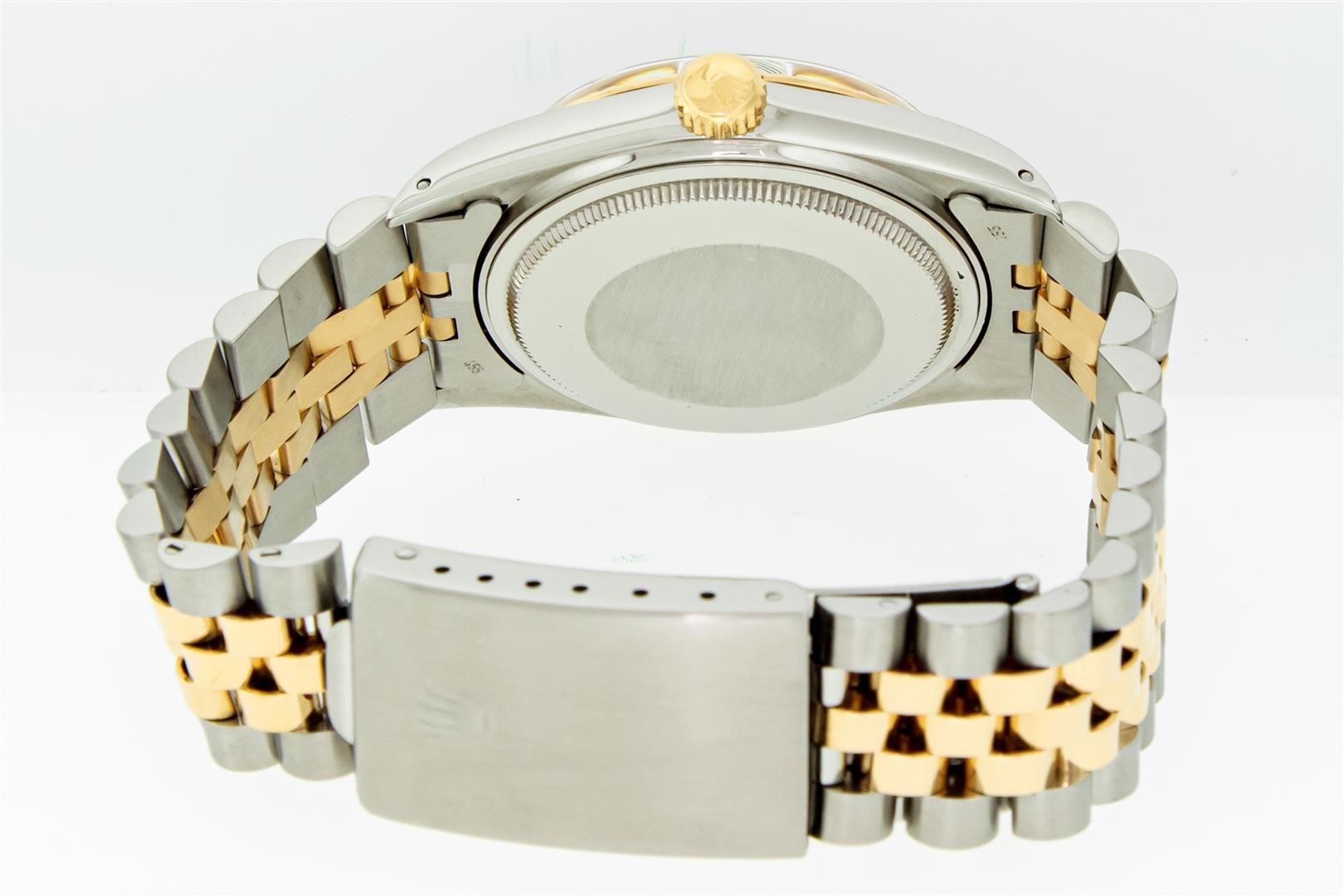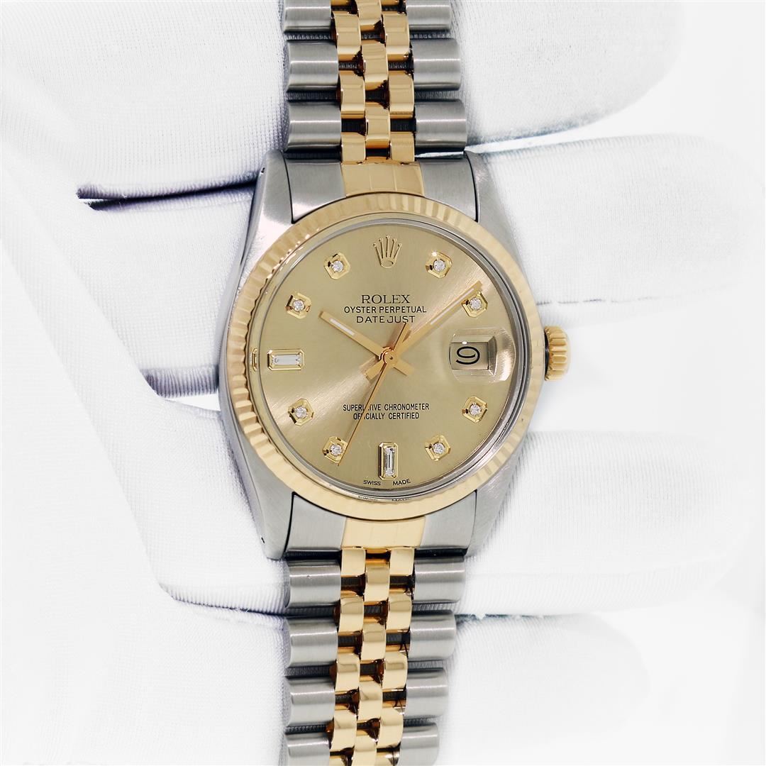 One Men's Pre Owned Yellow Gold Two Tone Rolex Datejust Polished, Serviced & Electronically Tested, Rolex Yellow Gold & Stainless Steel Case: 36mm, Rolex Yellow Gold Crown, Rolex Bezel: Yellow Gold Fluted Bezel. Custom Crystal: New Acrylic Cyclops Lens. Custom Hands: New Luminescent Hands. Rolex Movement: Automatic Winding Movement. Custom Dial: Refinish To Champagne With Added Diamonds, Diamond Count: 8 Diamonds + 2 Baguette Diamonds in Dial, G To H In Color, SI-VS Clarity. Date Window: 3 O'Clock Position Date Display, Quickset, Model: Datejust, Condition: G-6 Extra Fine. Rolex Bracelet: Two Tone Yellow Gold & Stainless Steel Jubilee Band. Bright Polish. 7.0 Inch Length, Adjustable. Standard Clasp, With Rolex Logo. This Watch Has Been Serviced And Polished It Is Free Of All Scratches And Dents.