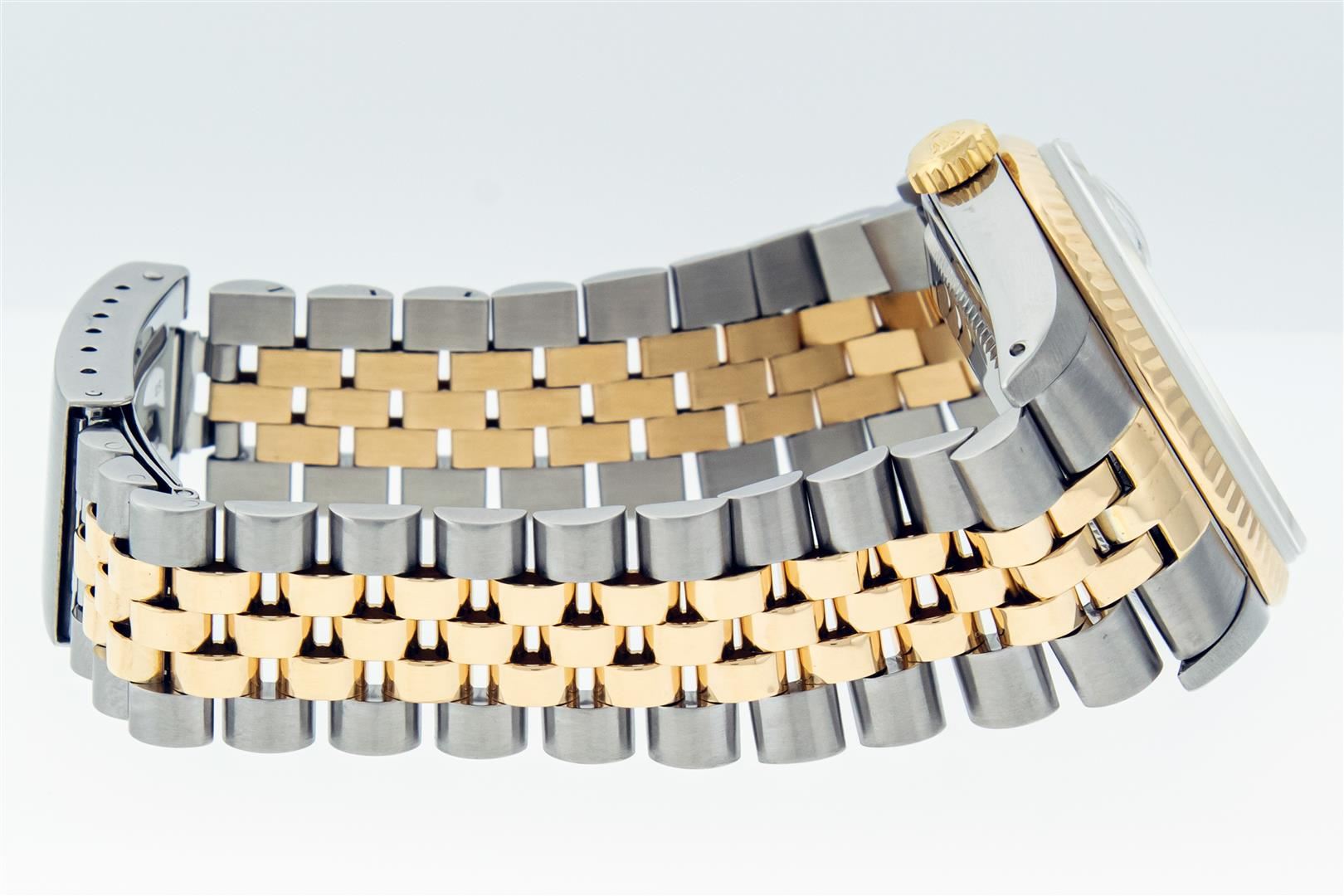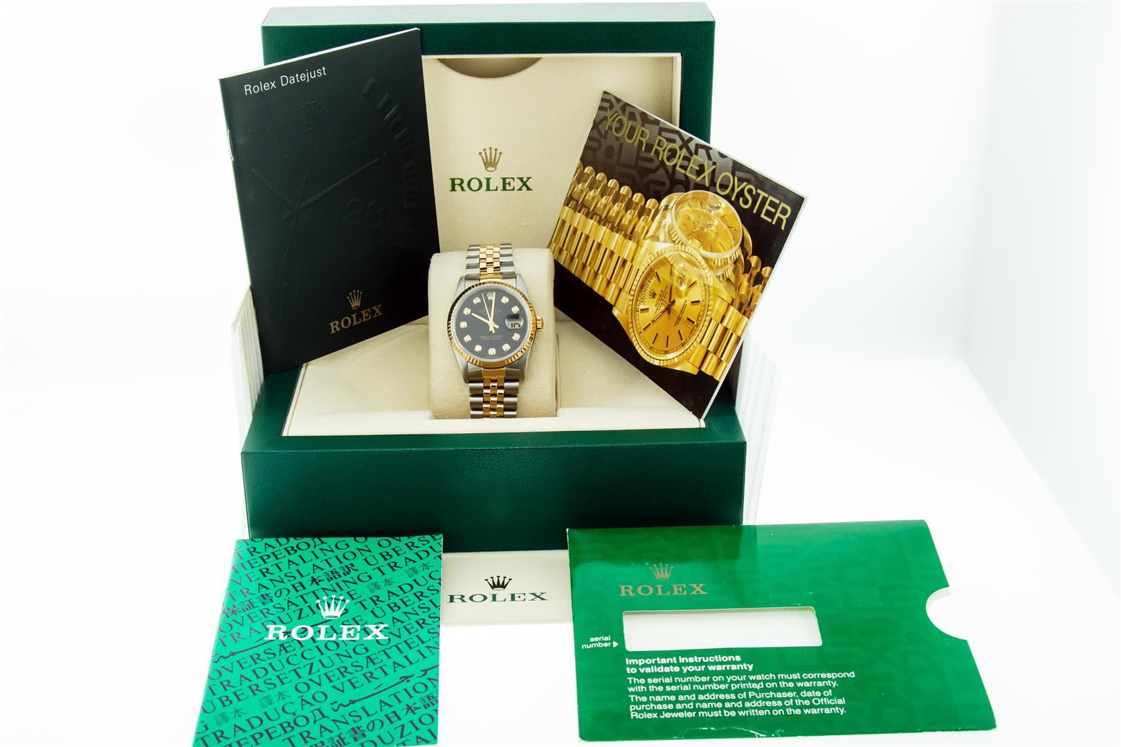 One Men's Yellow Gold Two Tone Rolex Datejust Polished, Serviced & Electronically Tested, Yellow Gold & Stainless Steel Case: 36mm, Yellow Gold Crown, Rolex Bezel: 18K Yellow Gold Fluted Bezel. Custom Crystal: New Acrylic With Magnified Date Window. Custom Hands: New Gold Hands. Rolex Movement: Automatic Winding Movement. Custom Dial: Refinished To Black With Custom Added Diamonds, Diamond Count: 10 Diamonds in Dial G To H In Color, SI-VS Clarity. Date Window: 3 O'clock Position Date Display, Quickset, Model: Condition: G-6 Extra Fine. Rolex Bracelet: Two Tone Yellow Gold & Stainless Steel Jubilee Band. Bright Polish. 7.0 Inch Length, Adjustable. Standard Clasp, With Rolex Logo. This Pre Owned Watch Has Been Serviced And Polished It Is Free Of All Scratches And Dents. This Watch Comes With A Rolex Box And Booklets.