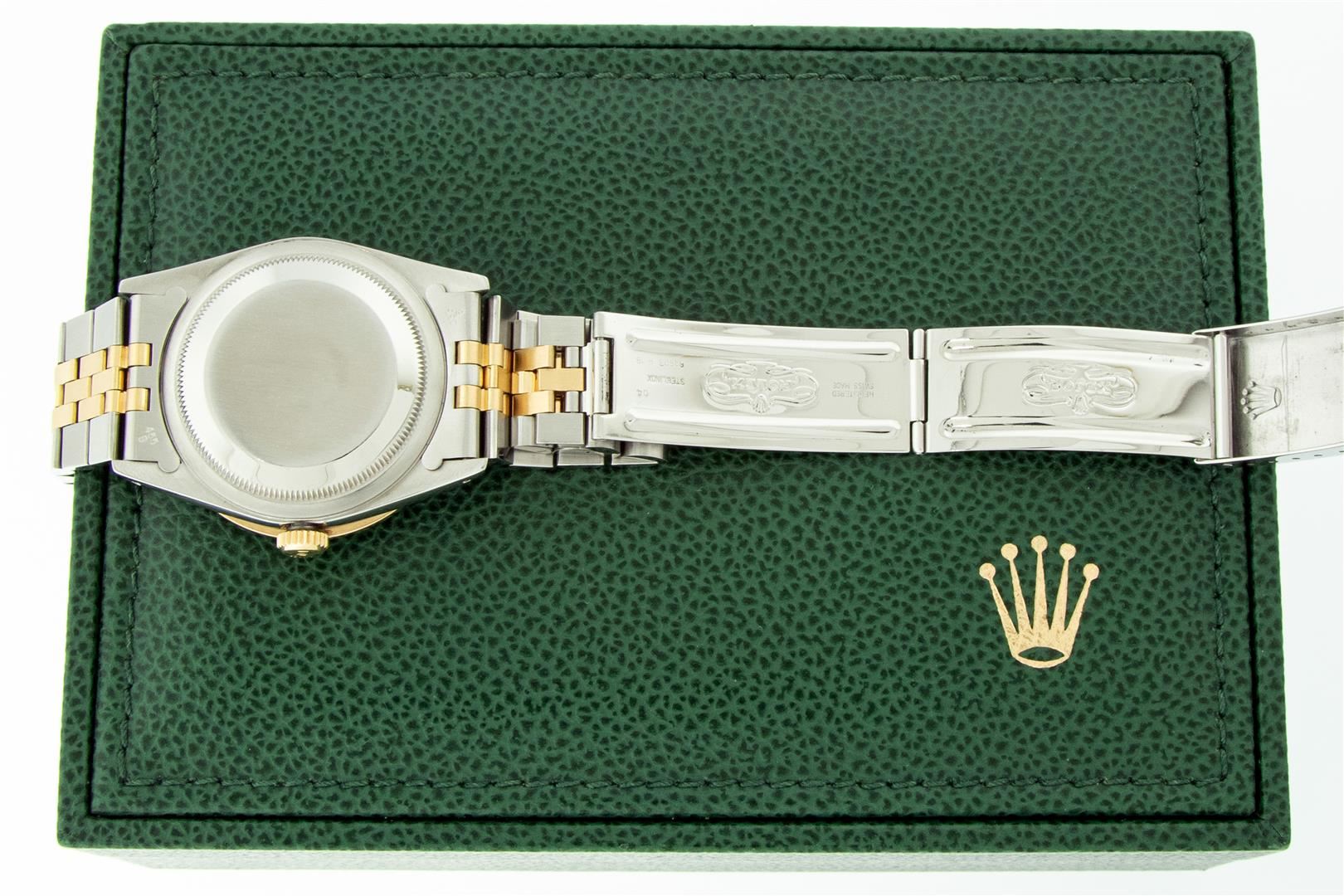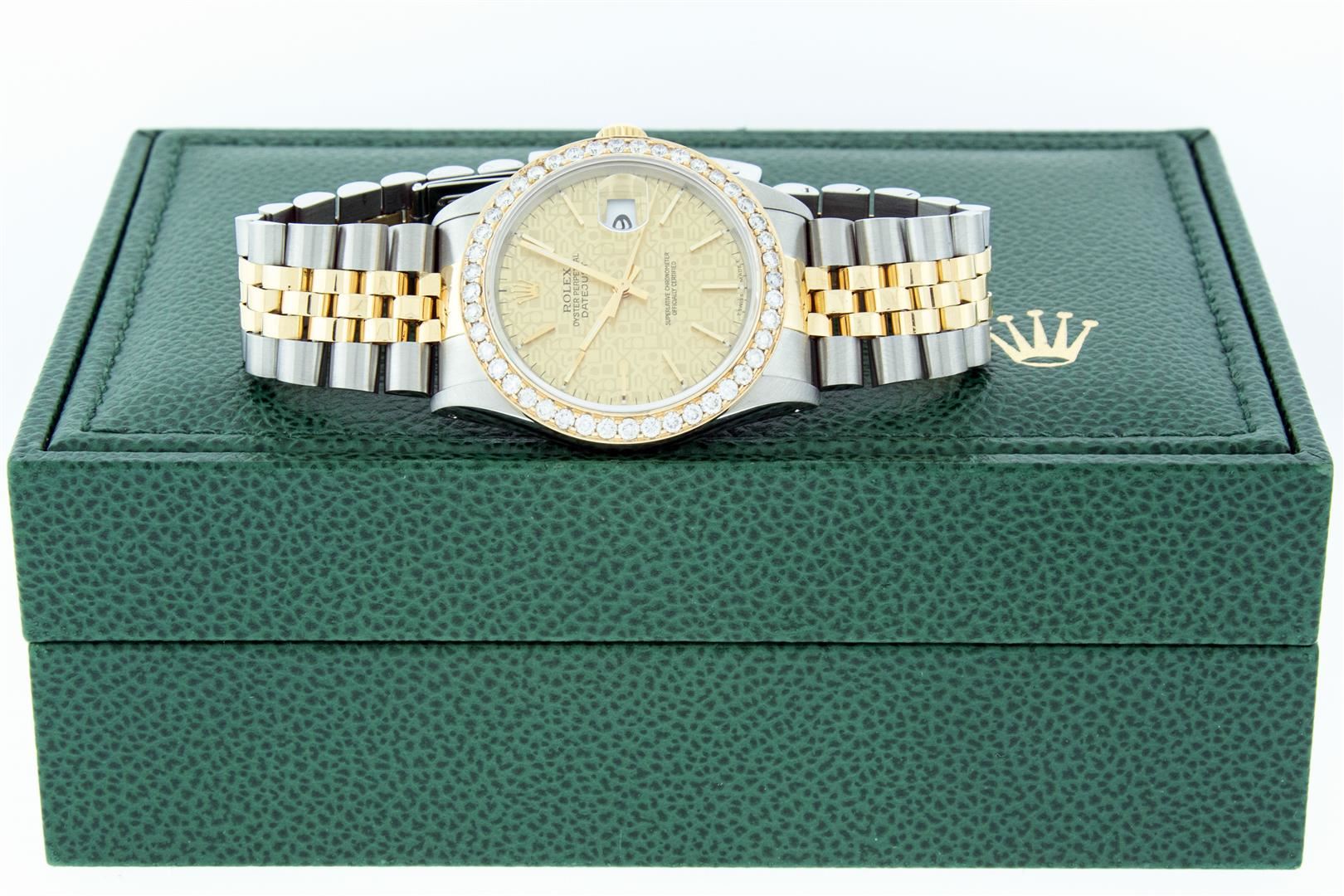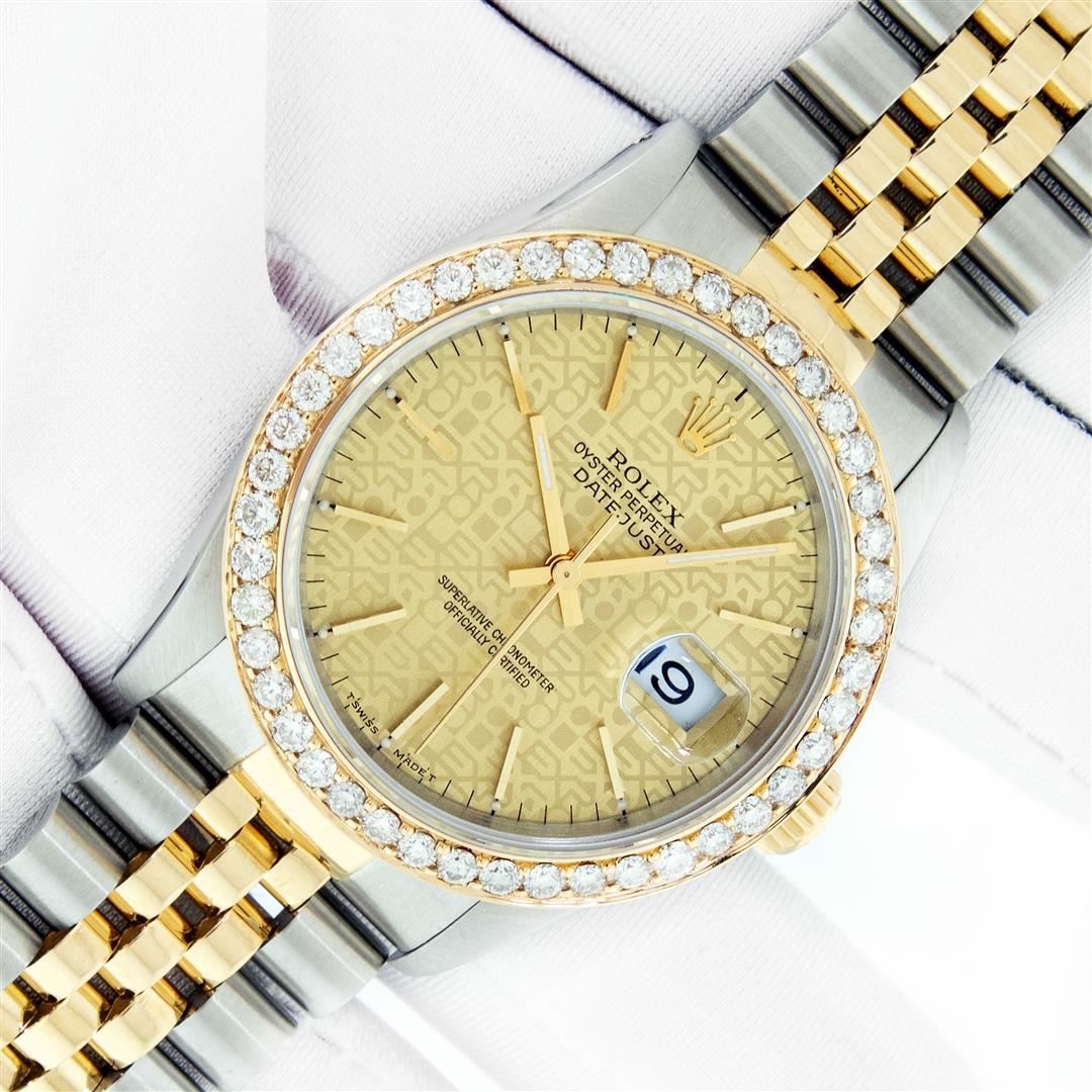 One Men's Pre Owned Yellow Gold Two Tone Rolex Datejust Polished, Serviced & Electronically Tested, Rolex Yellow Gold & Stainless Steel Case: 36mm,Rolex Yellow Gold Crown, Custom Bezel: New 18K Yellow Gold Beadset Diamond Bezel, Diamond Count: 40 Diamonds On Bezel, Total Bezel Weight 2.5 Carat, Clarity: SI-VS, Color: G to H. Custom Crystal: New Scratch Resistant Synthetic Sapphire Cyclops Lens. Custom Hands: New Luminescent Hands. Rolex Movement: Automatic Winding Movement. Rolex Dial: Champagne Jubilee Dial With Index Hour Markers and Small Track With Lumi Dots. Date Window: 3 O'Clock Position Date Display, Quickset, Model: Datejust. Condition: G-6 Extra Fine. Rolex Bracelet: Two Tone Yellow Gold & Stainless Steel Jubilee Band. Bright Polish. 7.0 Inch Length, Adjustable. Standard Clasp, With Rolex Logo. This Watch Has Been Serviced Time Tested And Is In Excellent Condition It Is Free Of All Scratches And Dents. This Watch Comes With A Rolex Box.