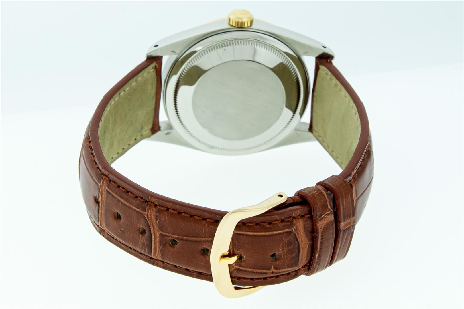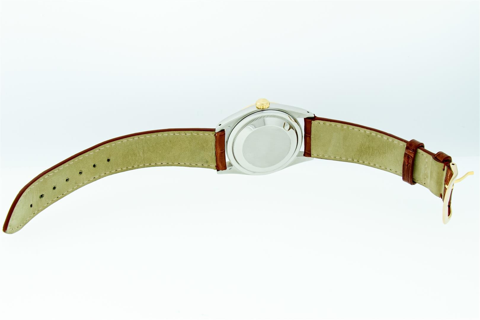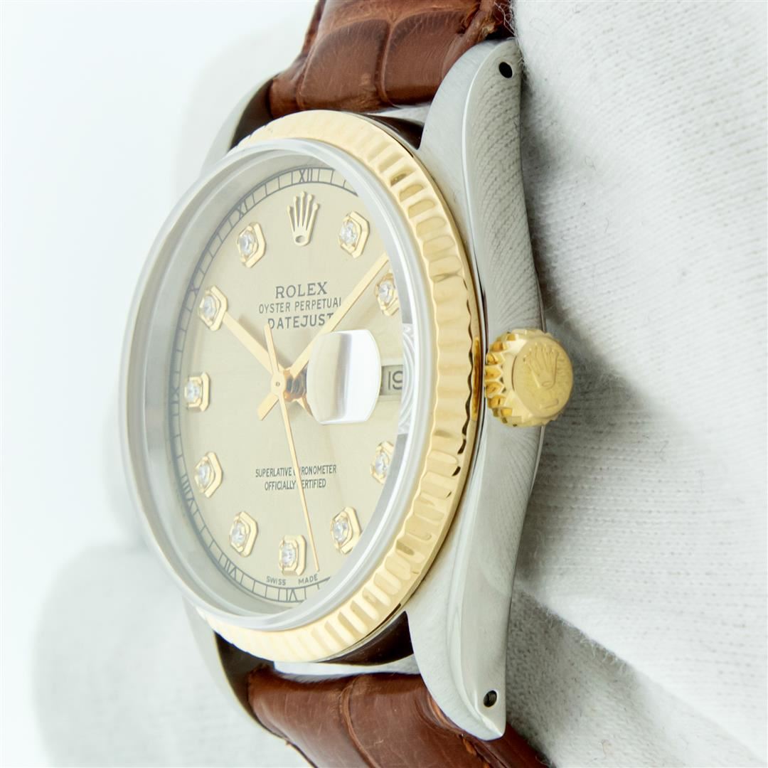 One Men's Yellow Gold Two Tone Rolex Datejust Polished, Serviced & Electronically Tested, Rolex Yellow Gold & Stainless Steel Case: 36mm, Rolex Yellow Gold Crown, Rolex Bezel: Yellow Gold Fluted Bezel. Custom Crystal: New Plastic with Date Window. Custom Hands: New Hands. Rolex Movement: Automatic Winding Movement. Custom Dial: Refinished To Champagne with Added Diamond Hour Markers, Diamond Count: 10 Diamonds in Dial G To H In Color, SI-VS Clarity. Date Window: 3 O'Clock Position Date Display, Quickset, Model: Datejust. Condition: G-6 Extra Fine. Custom Band: New Brown Leather Band 7.0 Inch Length with New Custom Pin Buckle Clasp. This Pre Owned Watch Has Been Serviced And Polished It Is Free Of All Scratches And Dents.