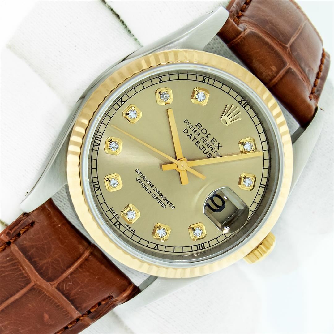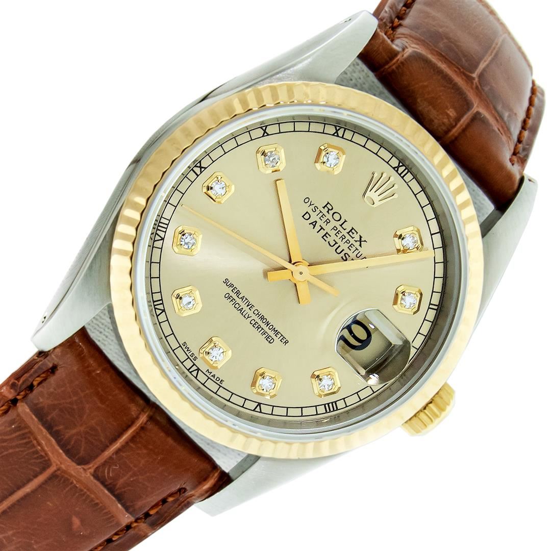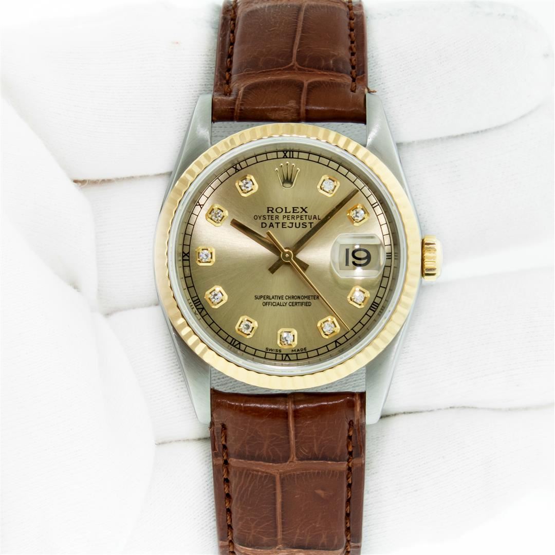 One Men's Yellow Gold Two Tone Rolex Datejust Polished, Serviced & Electronically Tested, Rolex Yellow Gold & Stainless Steel Case: 36mm, Rolex Yellow Gold Crown, Rolex Bezel: Yellow Gold Fluted Bezel. Custom Crystal: New Plastic with Date Window. Custom Hands: New Hands. Rolex Movement: Automatic Winding Movement. Custom Dial: Refinished To Champagne with Added Diamond Hour Markers, Diamond Count: 10 Diamonds in Dial G To H In Color, SI-VS Clarity. Date Window: 3 O'Clock Position Date Display, Quickset, Model: Datejust. Condition: G-6 Extra Fine. Custom Band: New Brown Leather Band 7.0 Inch Length with New Custom Pin Buckle Clasp. This Pre Owned Watch Has Been Serviced And Polished It Is Free Of All Scratches And Dents.
