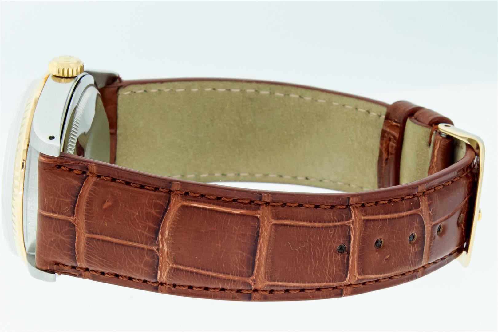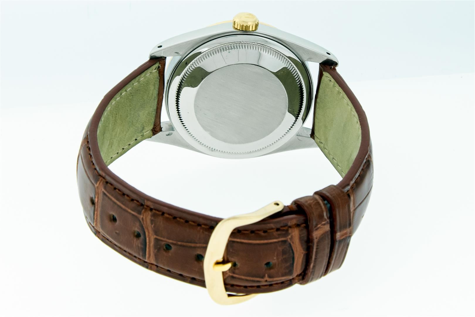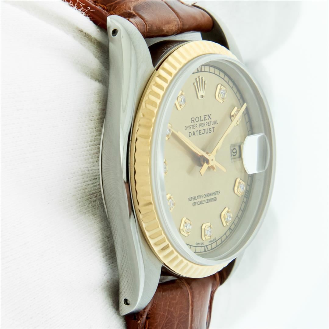 One Men's Yellow Gold Two Tone Rolex Datejust Polished, Serviced & Electronically Tested, Rolex Yellow Gold & Stainless Steel Case: 36mm, Rolex Yellow Gold Crown, Rolex Bezel: Yellow Gold Fluted Bezel. Custom Crystal: New Plastic with Date Window. Custom Hands: New Hands. Rolex Movement: Automatic Winding Movement. Custom Dial: Refinished To Champagne with Added Diamond Hour Markers, Diamond Count: 10 Diamonds in Dial G To H In Color, SI-VS Clarity. Date Window: 3 O'Clock Position Date Display, Quickset, Model: Datejust. Condition: G-6 Extra Fine. Custom Band: New Brown Leather Band 7.0 Inch Length with New Custom Pin Buckle Clasp. This Pre Owned Watch Has Been Serviced And Polished It Is Free Of All Scratches And Dents.