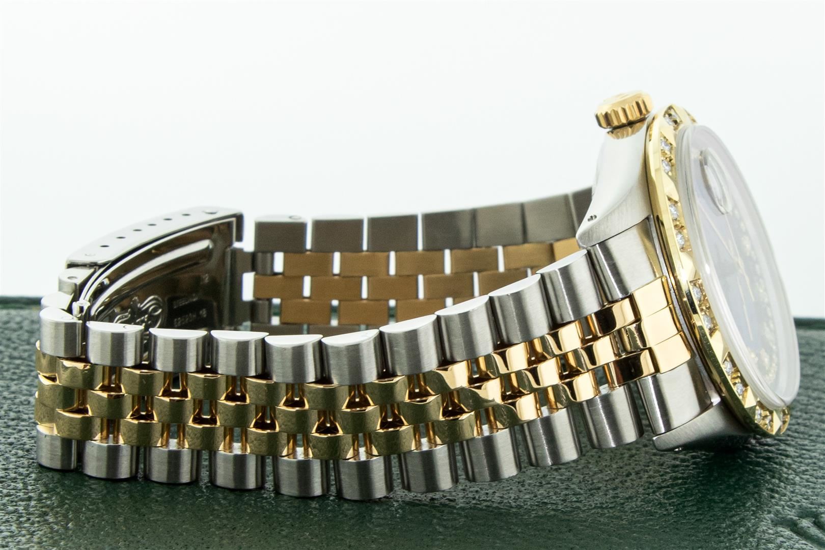 One Men's Yellow Gold Rolex Datejust Polished Bright with Satin Finish, Serviced & Electronically Tested, Rolex Stainless Steel Case: 36mm, Rolex Yellow Gold Crown, Custom Bezel: New 18K Yellow Gold Pyramid Diamond Bezel, Diamond Count: 24 Diamonds, Clarity: SI-VS, Color: G to H. Custom Crystal: New Sapphire with Magnified Date Window. Custom Hands: New Luminescent Hands. Rolex Movement: Automatic Winding Movement. Custom Dial: Refinished To Black String with Added Diamonds, Diamond Count: 58 Diamonds In Dial, Color: G to H, Clarity: VS. Date Window: 3 O'clock Position Date Display, Quickset, Model: Datejust. Condition: G-6 Extra Fine. Rolex Bracelet: Yellow Gold And Stainless Steel Jubilee Band. Bright Polish & Satin Finish. 7.0 Inch Length, Adjustable. Standard Clasp, with Rolex Logo. This Preowned Watch Has Been Serviced And Polished It Is Free Of All Scratches And Dents. This Watch Comes with A Rolex Box.