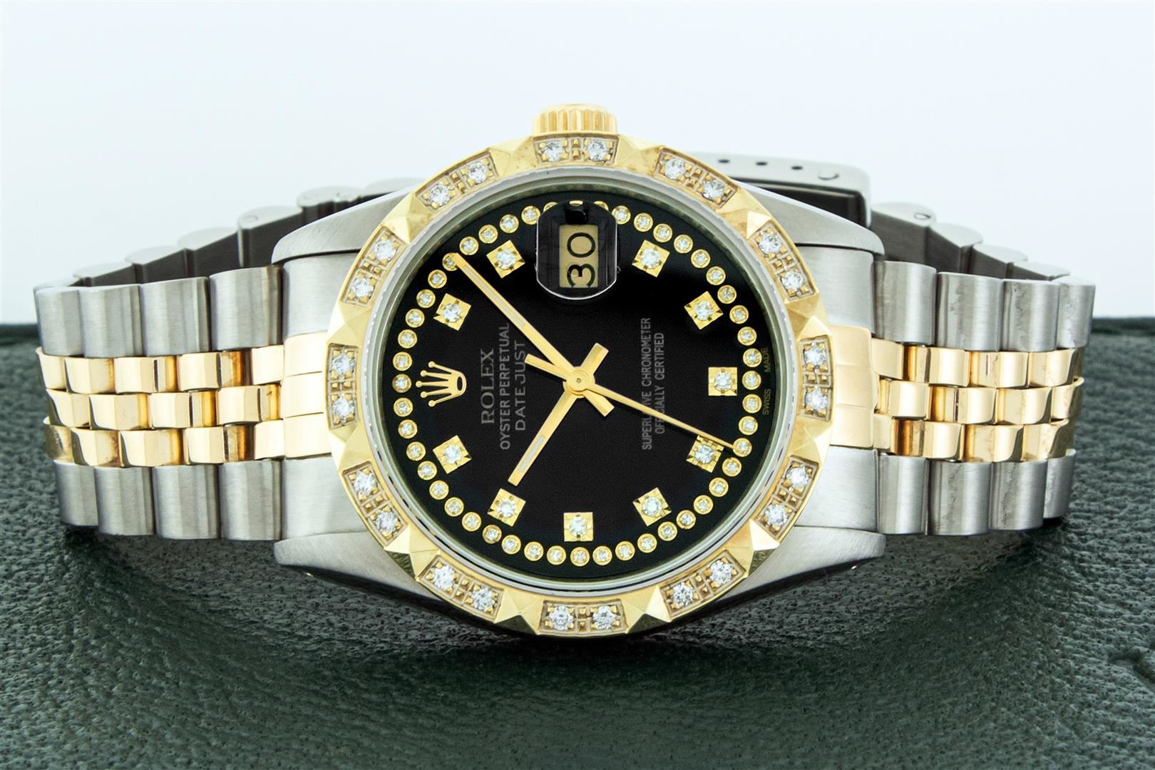 One Men's Yellow Gold Rolex Datejust Polished Bright with Satin Finish, Serviced & Electronically Tested, Rolex Stainless Steel Case: 36mm, Rolex Yellow Gold Crown, Custom Bezel: New 18K Yellow Gold Pyramid Diamond Bezel, Diamond Count: 24 Diamonds, Clarity: SI-VS, Color: G to H. Custom Crystal: New Sapphire with Magnified Date Window. Custom Hands: New Luminescent Hands. Rolex Movement: Automatic Winding Movement. Custom Dial: Refinished To Black String with Added Diamonds, Diamond Count: 58 Diamonds In Dial, Color: G to H, Clarity: VS. Date Window: 3 O'clock Position Date Display, Quickset, Model: Datejust. Condition: G-6 Extra Fine. Rolex Bracelet: Yellow Gold And Stainless Steel Jubilee Band. Bright Polish & Satin Finish. 7.0 Inch Length, Adjustable. Standard Clasp, with Rolex Logo. This Preowned Watch Has Been Serviced And Polished It Is Free Of All Scratches And Dents. This Watch Comes with A Rolex Box.