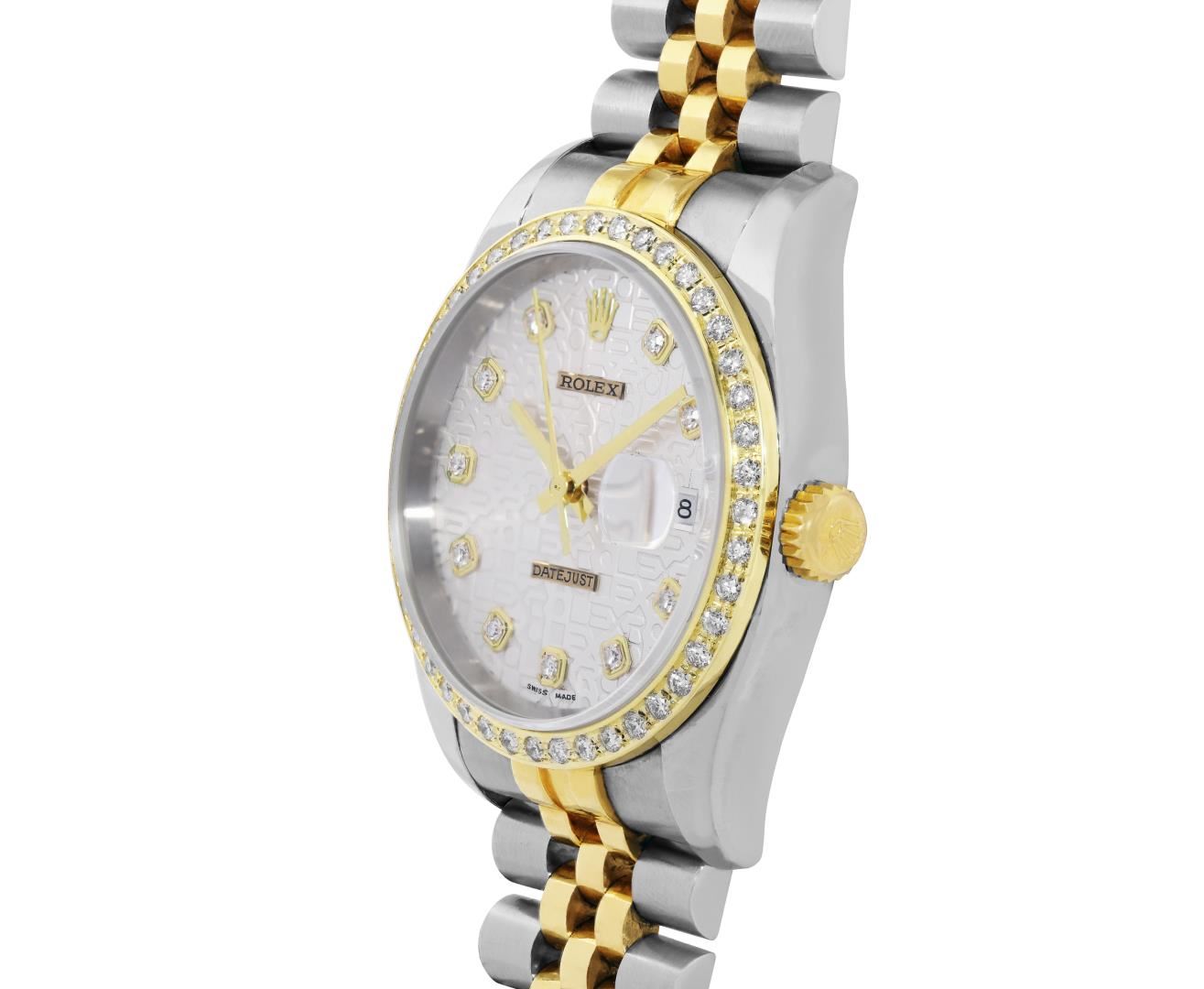 One Mens Pre Owned 18K Yellow Gold & Stainless Steel Rolex Datejust 36MM Polished, Serviced & Electronically Tested, Rolex Yellow Gold & Stainless Steel Case: 36mm, Rolex Yellow Gold Crown, Custom Bezel: New 18K Yellow Gold Beadset Diamond Bezel, Diamond Count: 44 Diamonds, Clarity: SI-VS, Color: G to H. Crystal: Sapphire With Magnified Date Window. Hands: Solid Hands. Rolex Movement: Automatic Winding Movement 3135. Rolex Dial: Factory Silver Jubilee Diamond Dial, Diamond Count: 10 Diamonds On Dial, Clarity: VVS. Date Window: 3 O'Clock Position Date Display, Quickset, Model: 116233 Datejust. Condition: G-6 Extra Fine. Rolex Bracelet: Two Tone 18K Yellow Gold & Stainless Steel Jubilee Band. Bright Polish. 7.0 Inch Length, Adjustable. Hidden Clasp, With Rolex Logo. This Watch Has Been Serviced And Polished It Is Free Of All Scratches And Dents.