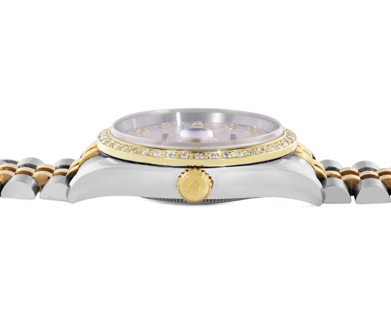 One Mens Pre Owned 18K Yellow Gold & Stainless Steel Rolex Datejust 36MM Polished, Serviced & Electronically Tested, Rolex Yellow Gold & Stainless Steel Case: 36mm, Rolex Yellow Gold Crown, Custom Bezel: New 18K Yellow Gold Beadset Diamond Bezel, Diamond Count: 44 Diamonds, Clarity: SI-VS, Color: G to H. Crystal: Sapphire With Magnified Date Window. Hands: Solid Hands. Rolex Movement: Automatic Winding Movement 3135. Rolex Dial: Factory Silver Jubilee Diamond Dial, Diamond Count: 10 Diamonds On Dial, Clarity: VVS. Date Window: 3 O'Clock Position Date Display, Quickset, Model: 116233 Datejust. Condition: G-6 Extra Fine. Rolex Bracelet: Two Tone 18K Yellow Gold & Stainless Steel Jubilee Band. Bright Polish. 7.0 Inch Length, Adjustable. Hidden Clasp, With Rolex Logo. This Watch Has Been Serviced And Polished It Is Free Of All Scratches And Dents.