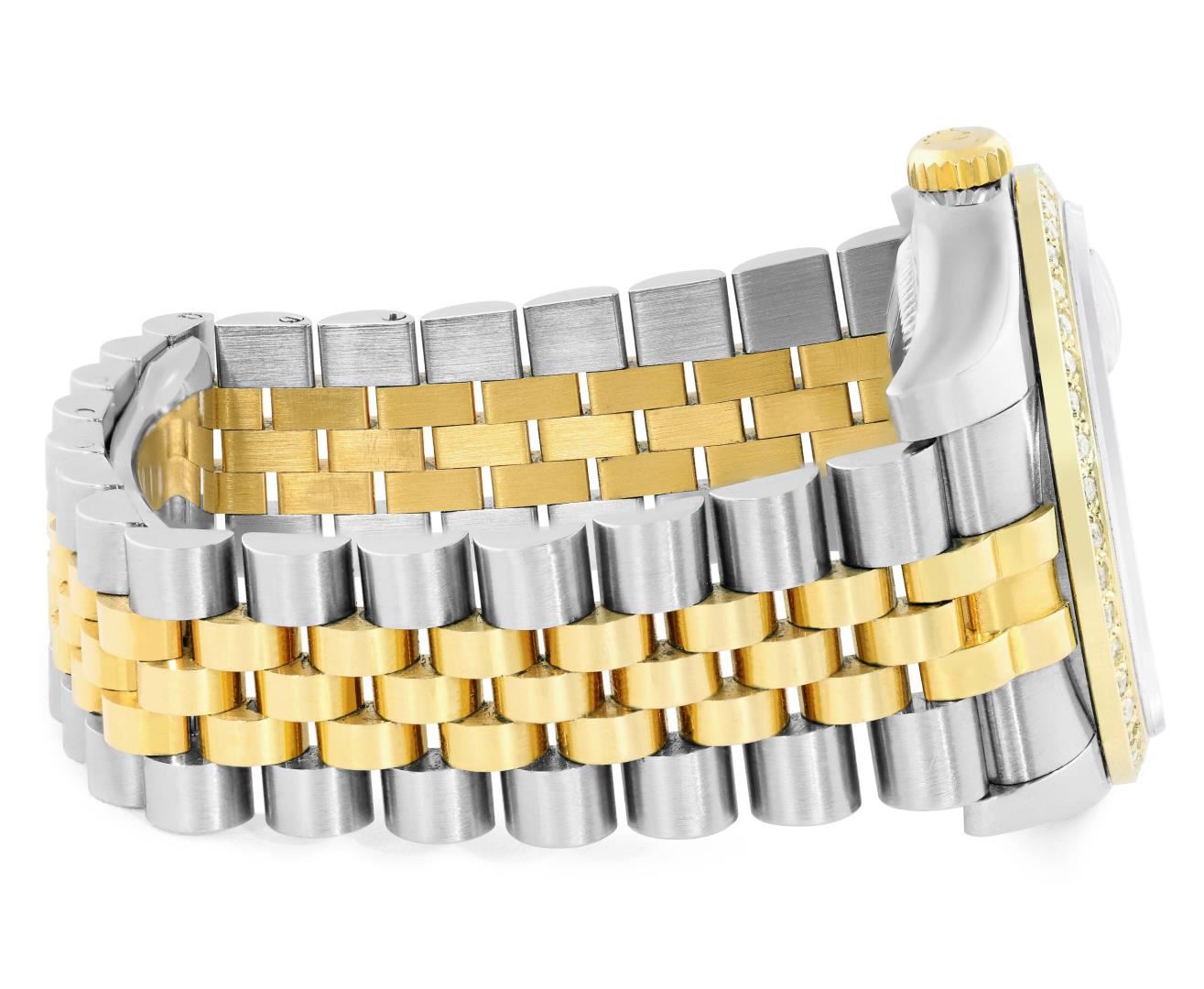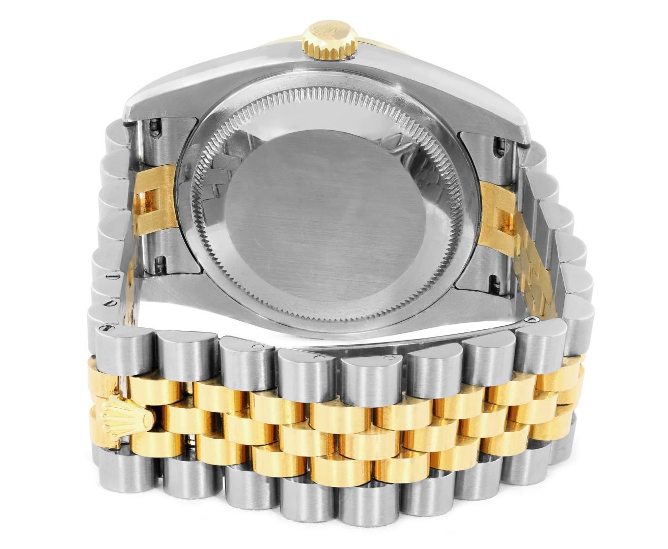 One Mens Pre Owned 18K Yellow Gold & Stainless Steel Rolex Datejust 36MM Polished, Serviced & Electronically Tested, Rolex Yellow Gold & Stainless Steel Case: 36mm, Rolex Yellow Gold Crown, Custom Bezel: New 18K Yellow Gold Beadset Diamond Bezel, Diamond Count: 44 Diamonds, Clarity: SI-VS, Color: G to H. Crystal: Sapphire With Magnified Date Window. Hands: Solid Hands. Rolex Movement: Automatic Winding Movement 3135. Rolex Dial: Factory Silver Jubilee Diamond Dial, Diamond Count: 10 Diamonds On Dial, Clarity: VVS. Date Window: 3 O'Clock Position Date Display, Quickset, Model: 116233 Datejust. Condition: G-6 Extra Fine. Rolex Bracelet: Two Tone 18K Yellow Gold & Stainless Steel Jubilee Band. Bright Polish. 7.0 Inch Length, Adjustable. Hidden Clasp, With Rolex Logo. This Watch Has Been Serviced And Polished It Is Free Of All Scratches And Dents.