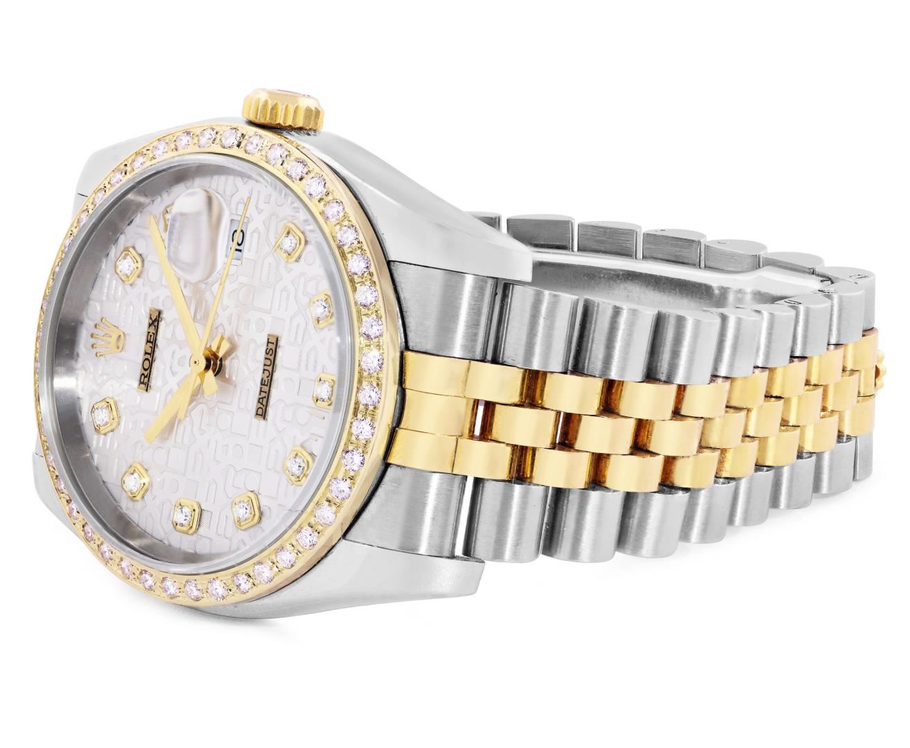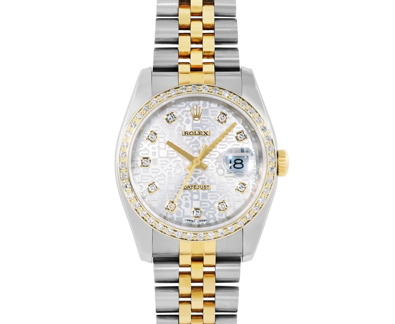 One Mens Pre Owned 18K Yellow Gold & Stainless Steel Rolex Datejust 36MM Polished, Serviced & Electronically Tested, Rolex Yellow Gold & Stainless Steel Case: 36mm, Rolex Yellow Gold Crown, Custom Bezel: New 18K Yellow Gold Beadset Diamond Bezel, Diamond Count: 44 Diamonds, Clarity: SI-VS, Color: G to H. Crystal: Sapphire With Magnified Date Window. Hands: Solid Hands. Rolex Movement: Automatic Winding Movement 3135. Rolex Dial: Factory Silver Jubilee Diamond Dial, Diamond Count: 10 Diamonds On Dial, Clarity: VVS. Date Window: 3 O'Clock Position Date Display, Quickset, Model: 116233 Datejust. Condition: G-6 Extra Fine. Rolex Bracelet: Two Tone 18K Yellow Gold & Stainless Steel Jubilee Band. Bright Polish. 7.0 Inch Length, Adjustable. Hidden Clasp, With Rolex Logo. This Watch Has Been Serviced And Polished It Is Free Of All Scratches And Dents.