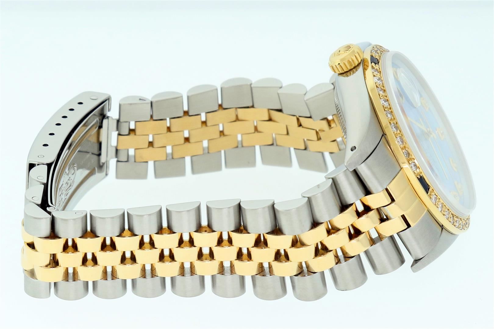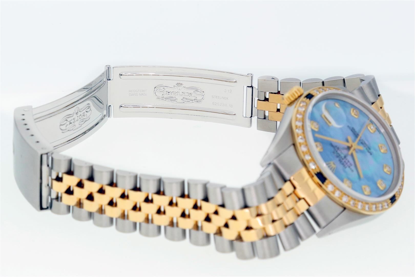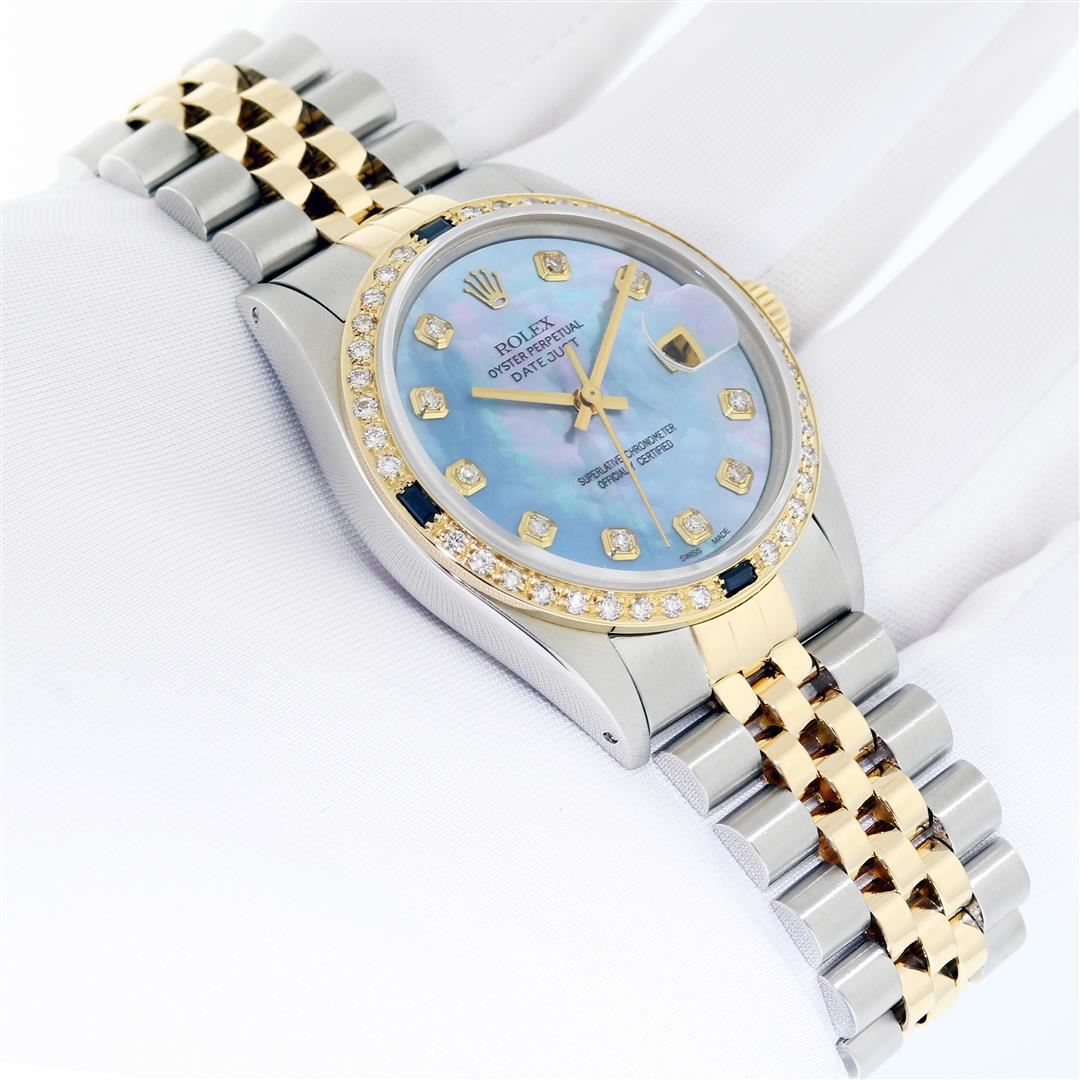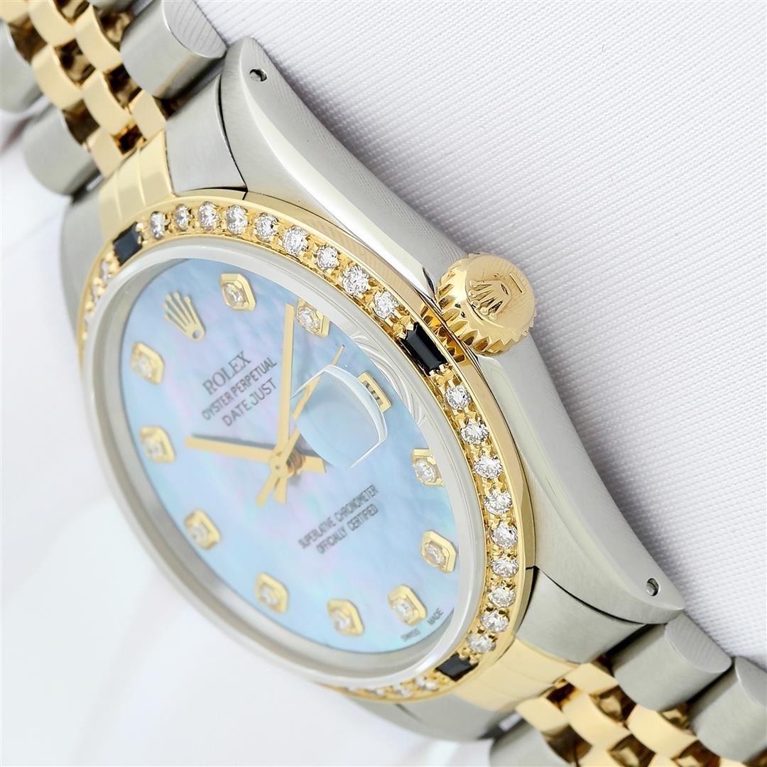 One Men's Yellow Gold Two Tone Rolex Datejust Polished, Serviced & Electronically Tested, Yellow Gold & Stainless Steel Case: 36mm, Rolex Yellow Gold Crown, Custom Bezel: New 18K Yellow Gold Sapphire Beadset Diamond Bezel, Diamond Count: 36 Diamonds + 4 Sapphires, Clarity: SI-VS, Color: G to H. Custom Crystal: New Sapphire with Magnified Date Window. Custom Hands: New Luminescent Hands. Rolex Movement: Automatic Winding Movement. Custom Dial: Blue MOP with Added Diamond Hour Markers. Diamond Count: 10 Diamonds In Dial, Clarity: SI-VS, Color: Color G to H Date Window: 3 O'Clock Position Date Display, Quickset, Model: Datejust. Condition: G-6 Extra Fine. Rolex Bracelet: Two Tone Yellow Gold & Stainless Steel Jubilee Band. Bright Polish. 7.0 Inch Length, Adjustable. Standard Clasp, with Rolex Logo. This Pre Owned Watch Has Been Serviced Time Tested And Is In Excellent Condition It Is Free Of All Scratches And Dents.