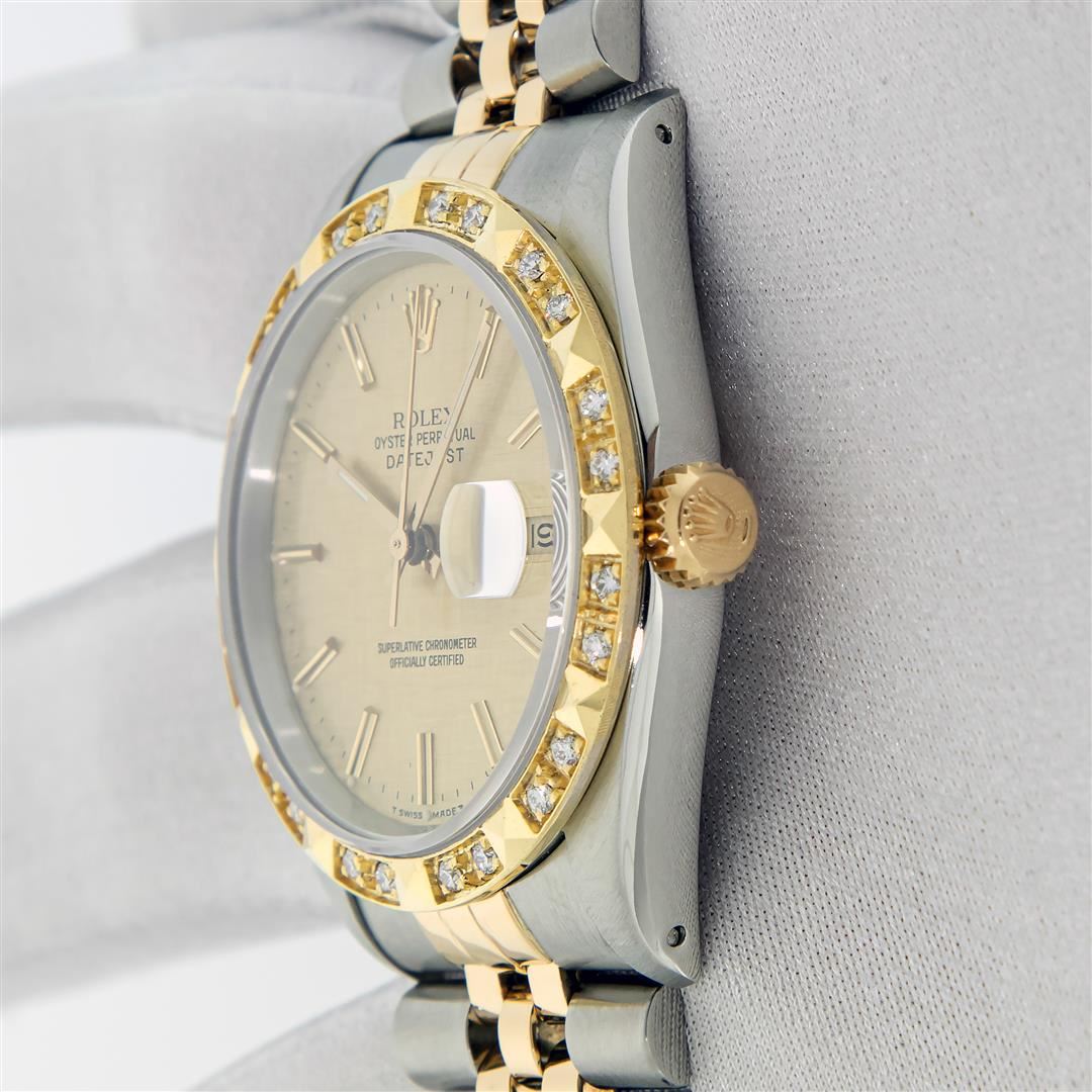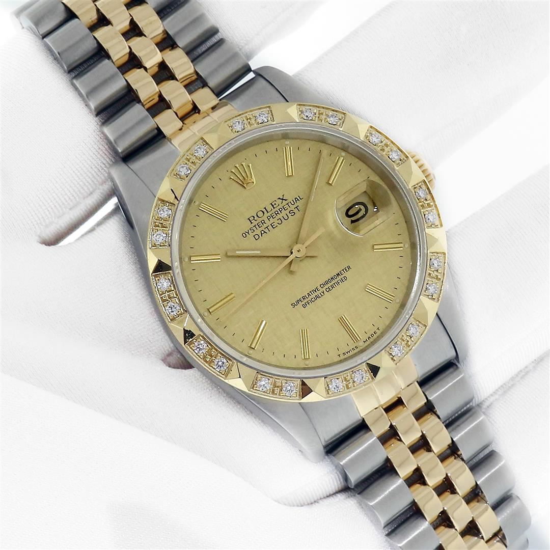 One Men's Pre Owned Yellow Gold Two Tone Rolex Datejust Polished, Serviced & Electronically Tested, Rolex Yellow Gold & Stainless Steel Case: 36mm, Rolex 14K Yellow Gold Crown, Custom Bezel: New 18K Yellow Gold Pyramid Diamond Bezel, Diamond Count On Bezel: 24 Diamonds, Total Weight .75 Carat, Clarity: SI-VS, Color: G to H. Custom Crystal: New Scratch Resistant Synthetic Sapphire Cyclops Lens. Custom Hands: New Luminescent Hands. Rolex Movement: Automatic Winding Movement. Rolex Dial: Champagne Jubilee Dial With Index Hour Markers and Small Track With Lumi Dots. Date Window: 3 O'Clock Position Date Display, Quickset, Model: Datejust. Condition: G-6 Extra Fine. Rolex Bracelet: Two Tone Yellow Gold & Stainless Steel Jubilee Band. Bright Polish. 7.0 Inch Length, Adjustable. Standard Clasp, With Rolex Logo. This Watch Has Been Serviced Time Tested And Is In Excellent Condition It Is Free Of All Scratches And Dents. This Watch Comes With Rolex Box And Booklets.