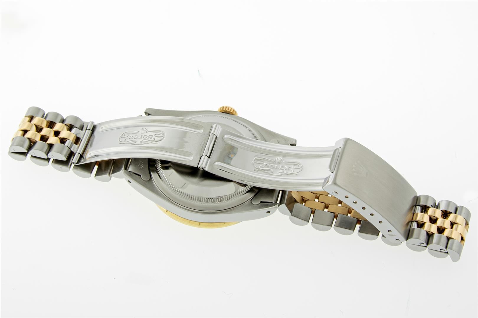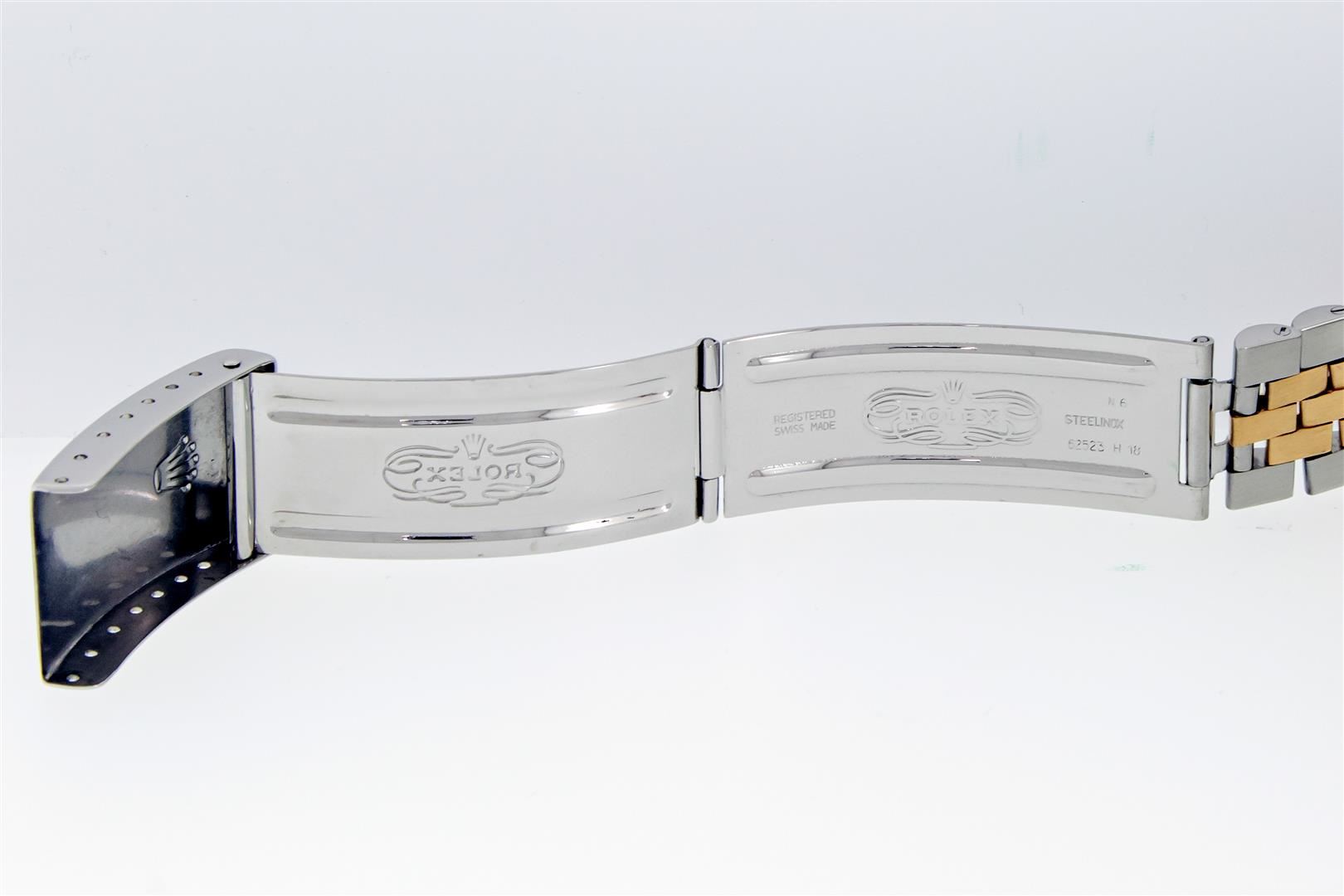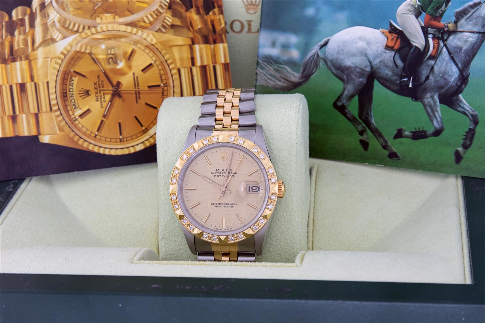 One Men's Pre Owned Yellow Gold Two Tone Rolex Datejust Polished, Serviced & Electronically Tested, Rolex Yellow Gold & Stainless Steel Case: 36mm, Rolex 14K Yellow Gold Crown, Custom Bezel: New 18K Yellow Gold Pyramid Diamond Bezel, Diamond Count On Bezel: 24 Diamonds, Total Weight .75 Carat, Clarity: SI-VS, Color: G to H. Custom Crystal: New Scratch Resistant Synthetic Sapphire Cyclops Lens. Custom Hands: New Luminescent Hands. Rolex Movement: Automatic Winding Movement. Rolex Dial: Champagne Jubilee Dial With Index Hour Markers and Small Track With Lumi Dots. Date Window: 3 O'Clock Position Date Display, Quickset, Model: Datejust. Condition: G-6 Extra Fine. Rolex Bracelet: Two Tone Yellow Gold & Stainless Steel Jubilee Band. Bright Polish. 7.0 Inch Length, Adjustable. Standard Clasp, With Rolex Logo. This Watch Has Been Serviced Time Tested And Is In Excellent Condition It Is Free Of All Scratches And Dents. This Watch Comes With Rolex Box And Booklets.