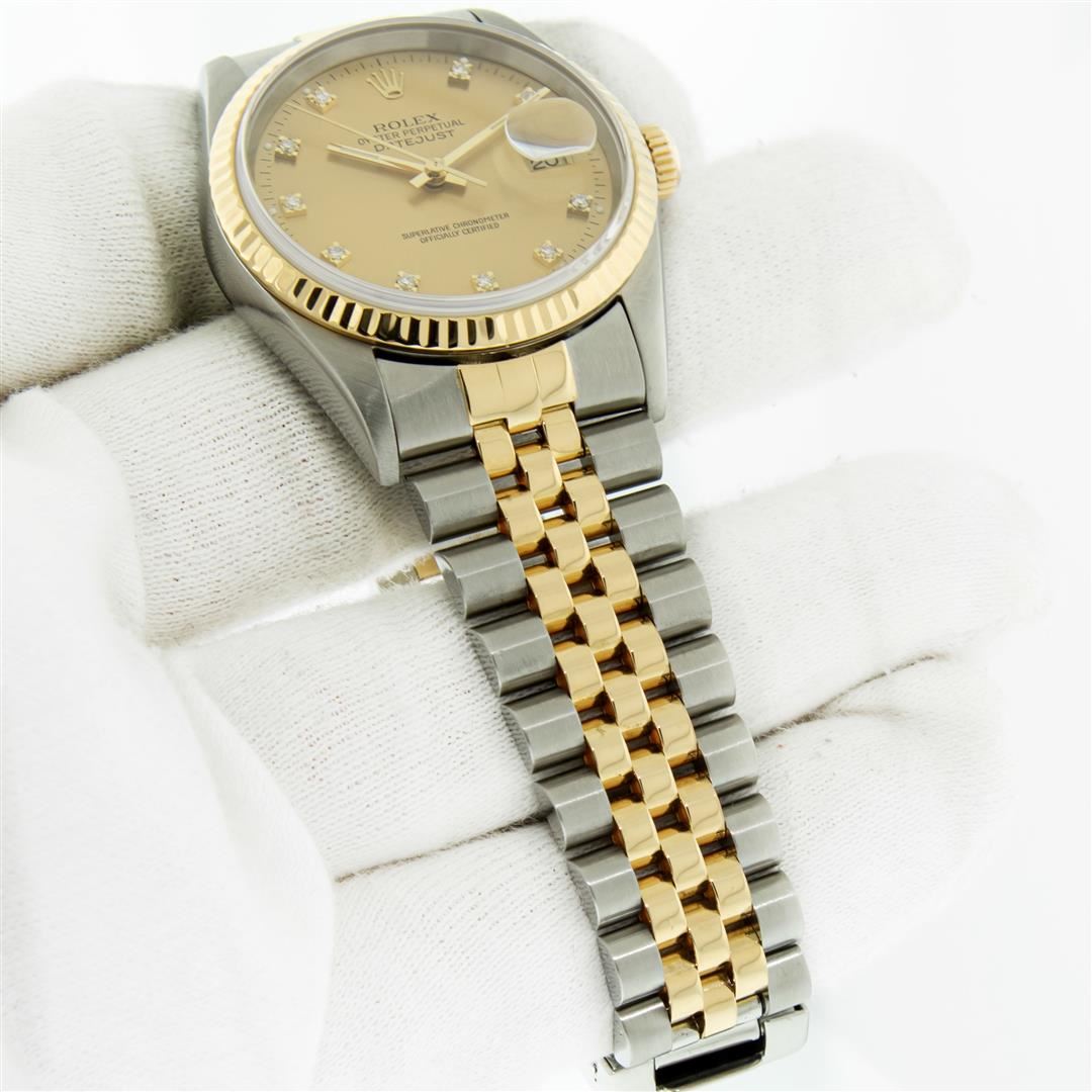 One Men's Yellow Gold Two Tone Rolex Datejust Polished, Serviced & Electronically Tested, Rolex Yellow Gold & Stainless Steel Case: 36mm, Rolex Yellow Gold Crown, Rolex Bezel: 18K Yellow Gold Fluted Bezel. Custom Crystal: New Sapphire With Magnified Date Window. Custom Hands: New Yellow Luminescent Hands. Rolex Movement: Automatic Winding Movement. Rolex Dial: Champagne With VS Factory Diamond Hour Markers, Diamond Count: 10 Diamonds in Dial, VS Clarity. Date Window: 3 O'clock Position Date Display, Quickset, Model: Condition: G-6 Extra Fine. Rolex Bracelet: Two Tone Yellow Gold & Stainless Steel Jubilee Band. Bright Polish. 7.0 Inch Length, Adjustable. Standard Clasp, With Rolex Logo. This Pre Owned Watch Has Been Serviced And Polished It Is Free Of All Scratches And Dents.