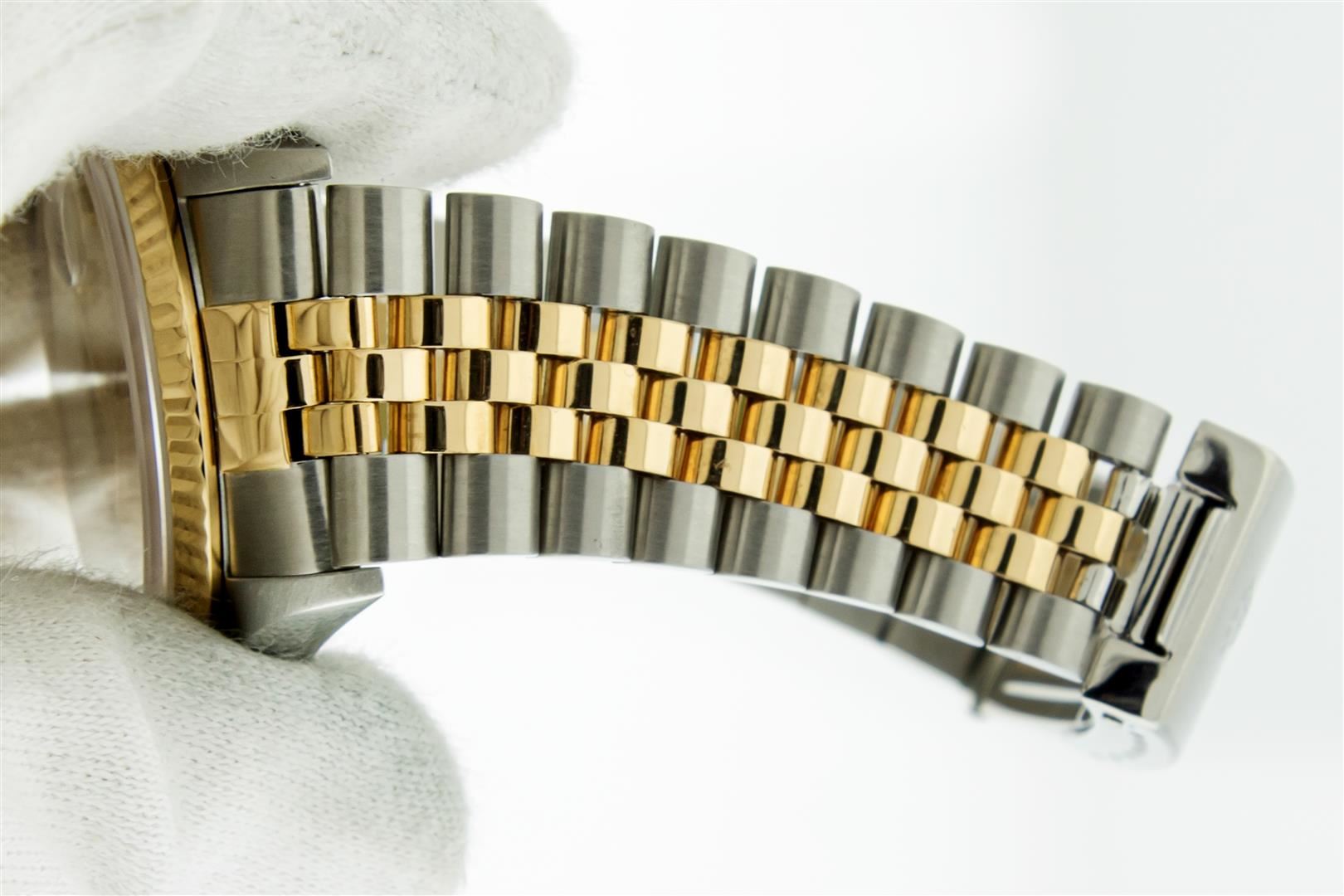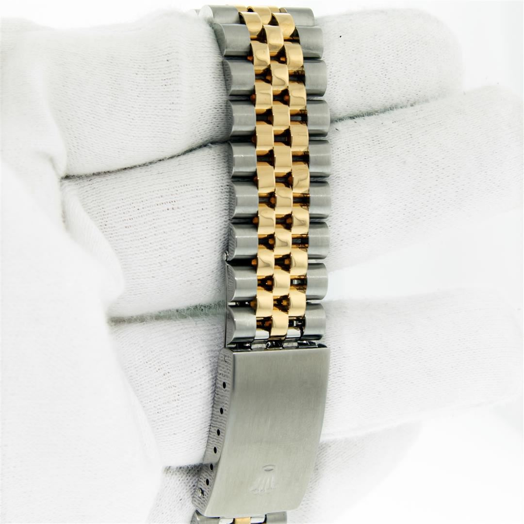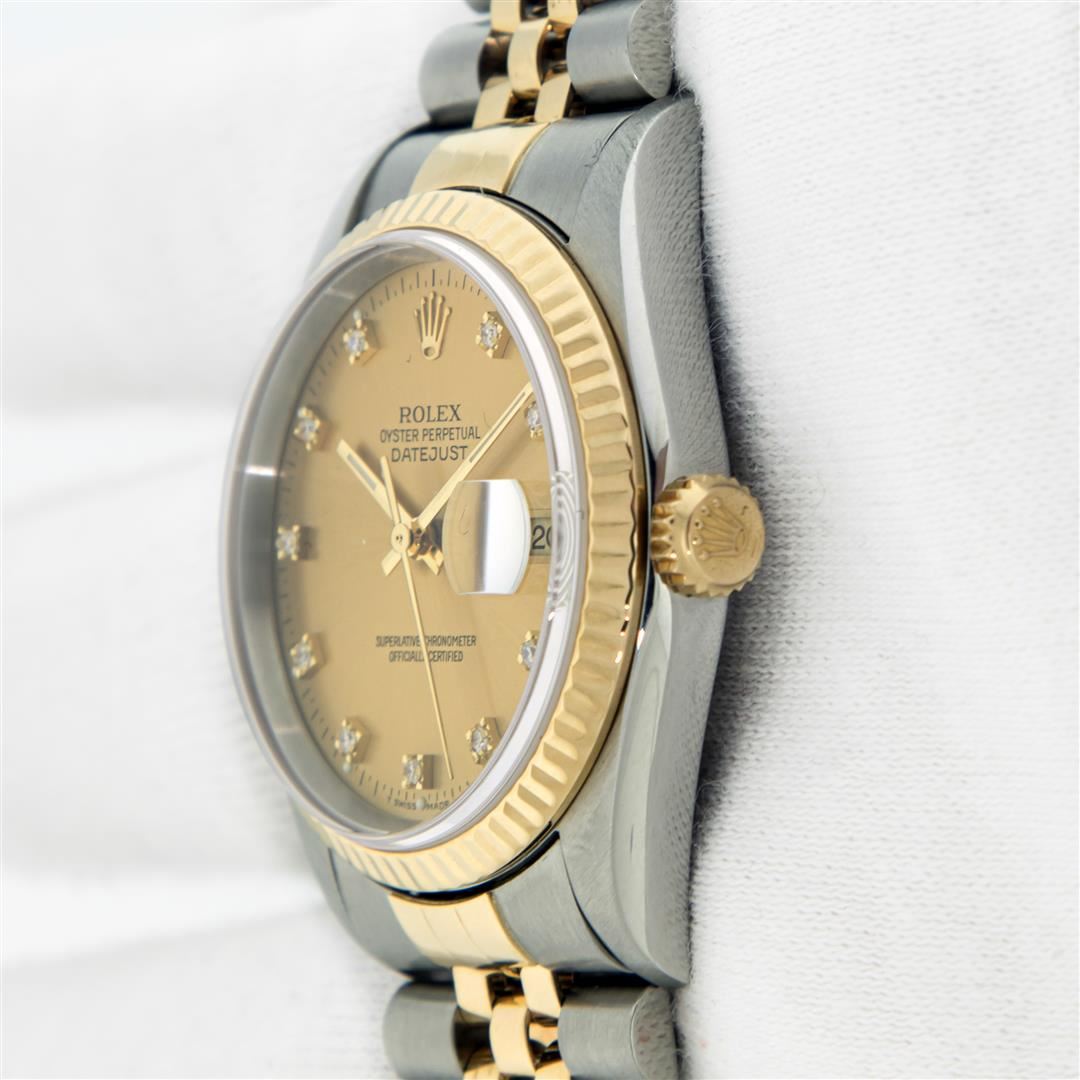 One Men's Yellow Gold Two Tone Rolex Datejust Polished, Serviced & Electronically Tested, Rolex Yellow Gold & Stainless Steel Case: 36mm, Rolex Yellow Gold Crown, Rolex Bezel: 18K Yellow Gold Fluted Bezel. Custom Crystal: New Sapphire With Magnified Date Window. Custom Hands: New Yellow Luminescent Hands. Rolex Movement: Automatic Winding Movement. Rolex Dial: Champagne With VS Factory Diamond Hour Markers, Diamond Count: 10 Diamonds in Dial, VS Clarity. Date Window: 3 O'clock Position Date Display, Quickset, Model: Condition: G-6 Extra Fine. Rolex Bracelet: Two Tone Yellow Gold & Stainless Steel Jubilee Band. Bright Polish. 7.0 Inch Length, Adjustable. Standard Clasp, With Rolex Logo. This Pre Owned Watch Has Been Serviced And Polished It Is Free Of All Scratches And Dents.