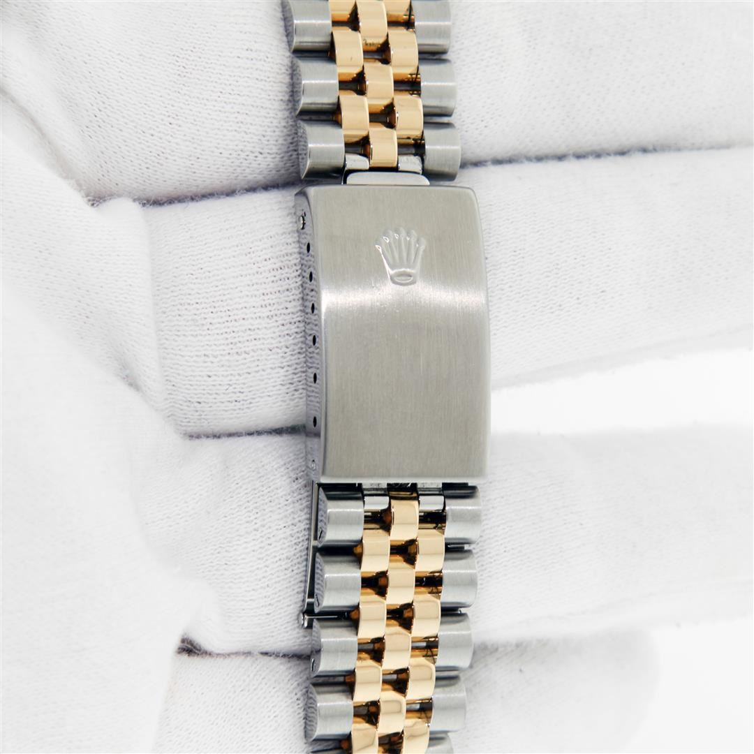 One Men's Yellow Gold Two Tone Rolex Datejust Polished, Serviced & Electronically Tested, Rolex Yellow Gold & Stainless Steel Case: 36mm, Rolex Yellow Gold Crown, Rolex Bezel: 18K Yellow Gold Fluted Bezel. Custom Crystal: New Sapphire With Magnified Date Window. Custom Hands: New Yellow Luminescent Hands. Rolex Movement: Automatic Winding Movement. Rolex Dial: Champagne With VS Factory Diamond Hour Markers, Diamond Count: 10 Diamonds in Dial, VS Clarity. Date Window: 3 O'clock Position Date Display, Quickset, Model: Condition: G-6 Extra Fine. Rolex Bracelet: Two Tone Yellow Gold & Stainless Steel Jubilee Band. Bright Polish. 7.0 Inch Length, Adjustable. Standard Clasp, With Rolex Logo. This Pre Owned Watch Has Been Serviced And Polished It Is Free Of All Scratches And Dents.