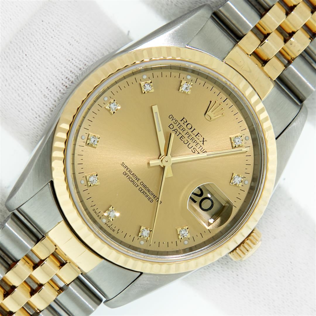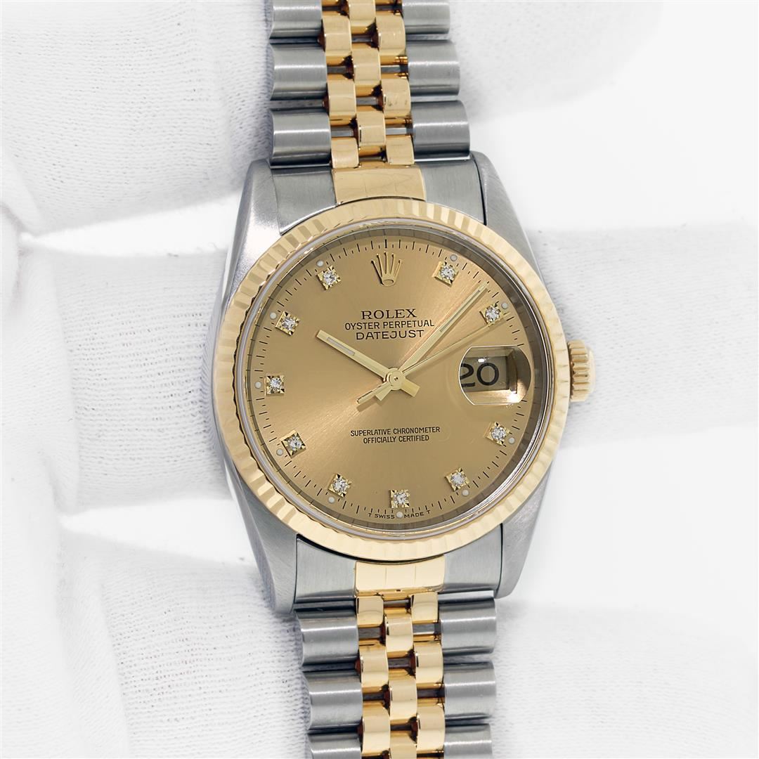 One Men's Yellow Gold Two Tone Rolex Datejust Polished, Serviced & Electronically Tested, Rolex Yellow Gold & Stainless Steel Case: 36mm, Rolex Yellow Gold Crown, Rolex Bezel: 18K Yellow Gold Fluted Bezel. Custom Crystal: New Sapphire With Magnified Date Window. Custom Hands: New Yellow Luminescent Hands. Rolex Movement: Automatic Winding Movement. Rolex Dial: Champagne With VS Factory Diamond Hour Markers, Diamond Count: 10 Diamonds in Dial, VS Clarity. Date Window: 3 O'clock Position Date Display, Quickset, Model: Condition: G-6 Extra Fine. Rolex Bracelet: Two Tone Yellow Gold & Stainless Steel Jubilee Band. Bright Polish. 7.0 Inch Length, Adjustable. Standard Clasp, With Rolex Logo. This Pre Owned Watch Has Been Serviced And Polished It Is Free Of All Scratches And Dents.