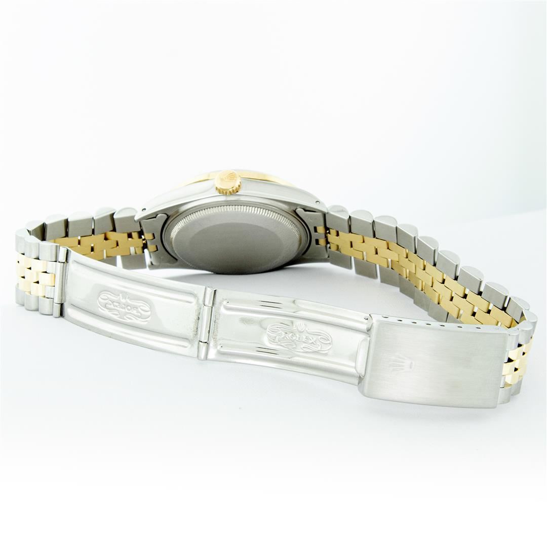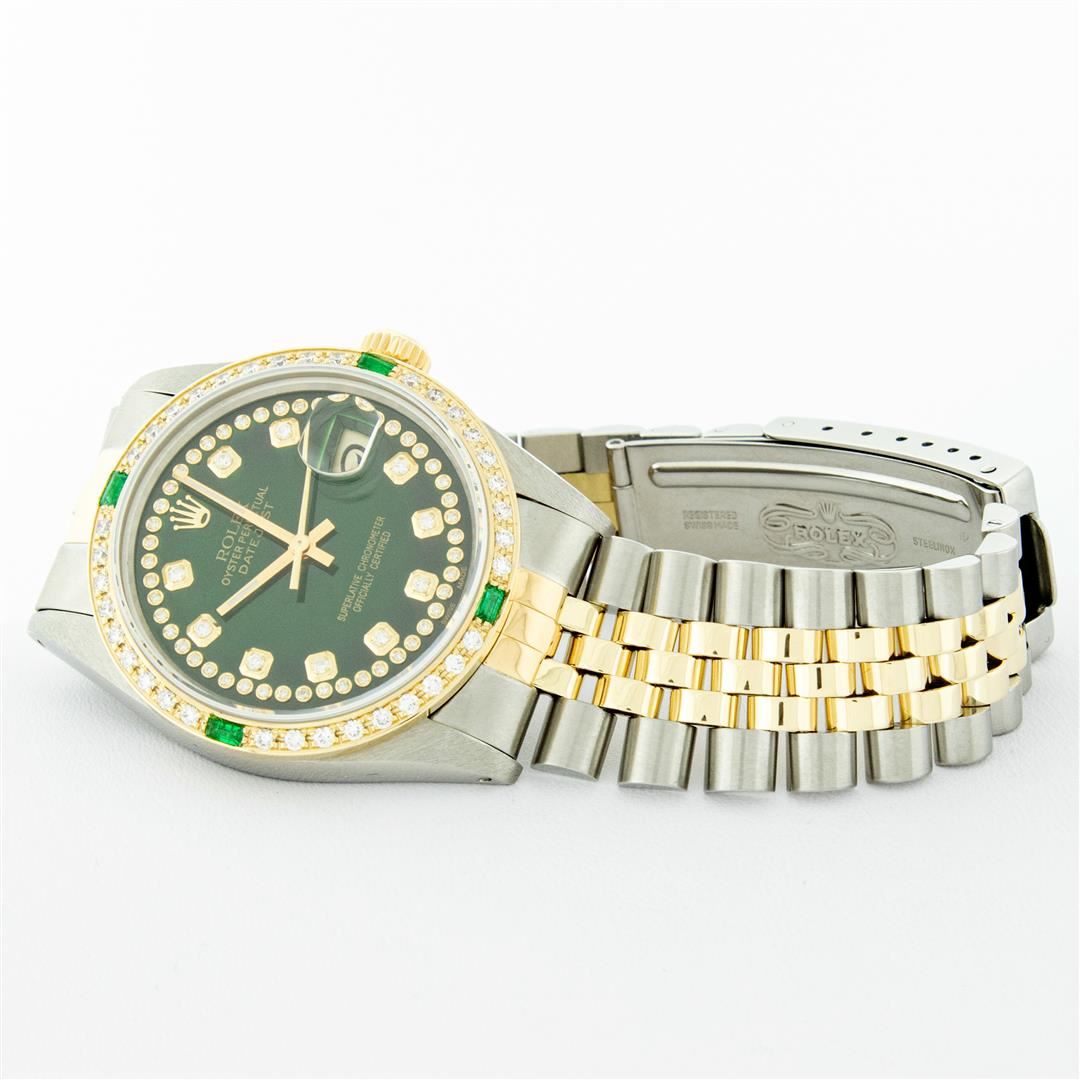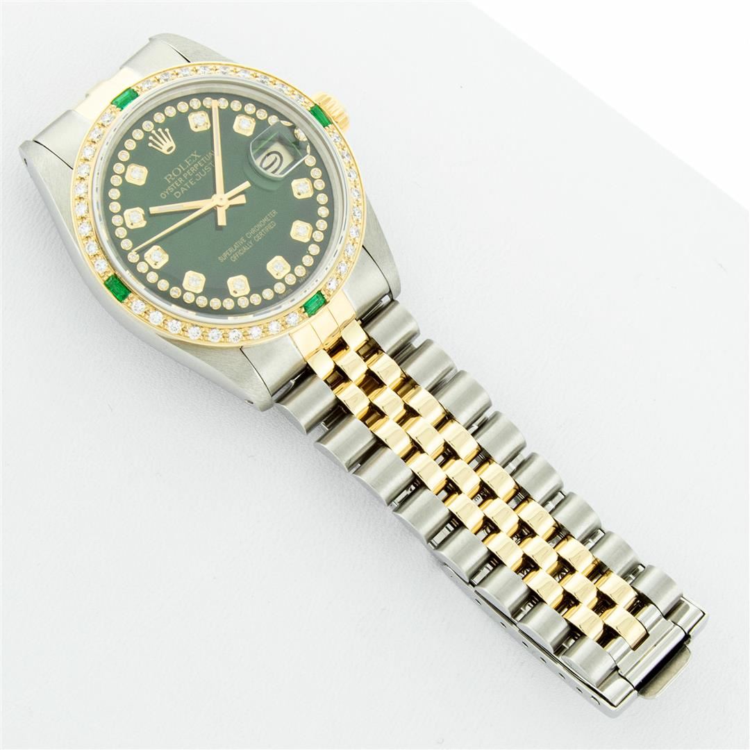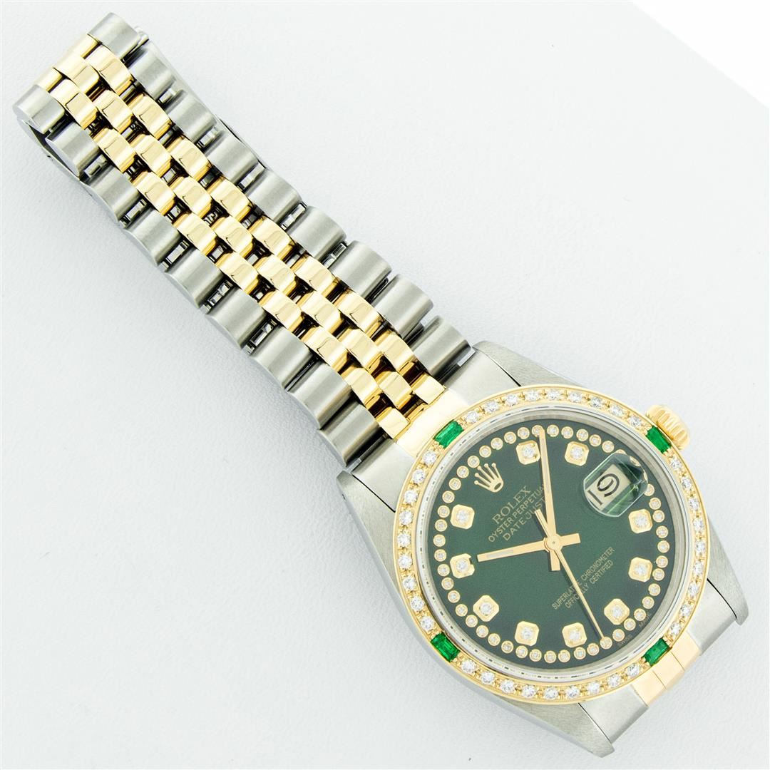 One Men's Yellow Gold Two Tone Rolex Datejust Polished, Serviced & Electronically Tested, Yellow Gold & Stainless Steel Case: 36mm, Yellow Gold Crown, Custom Bezel: New 18K Yellow Gold Emerald Beadset Diamond Bezel, Diamond Count: 36 Diamonds + 4 Emeralds, Total Weight 1.00 Carat, Clarity: SI-VS, Color: G to H. Custom Crystal: New Scratch Resistant Synthetic Sapphire Cyclops Lens. Custom Hands: New Luminescent Hands. Movement: Automatic Winding Movement. Custom Dial: Green String Diamond Dial, Diamond Count: 58 Diamonds in Dial, G To H In Color, SI-VS Clarity. Date Window: 3 O'Clock Position Date Display, Quickset, Model: Datejust. Condition: G-6 Extra Fine. Bracelet: Two Tone Yellow Gold & Stainless Steel Jubilee Band. Bright Polish. 7.0 Inch Length, Adjustable. Standard Clasp, With Rolex Logo. This Watch Has Been Serviced Time Tested And Is In Excellent Condition It Is Free Of All Scratches And Dents.