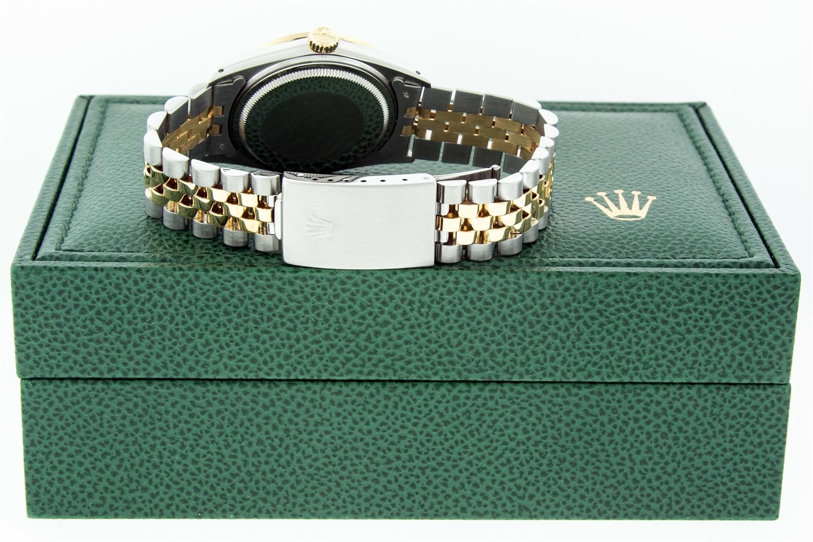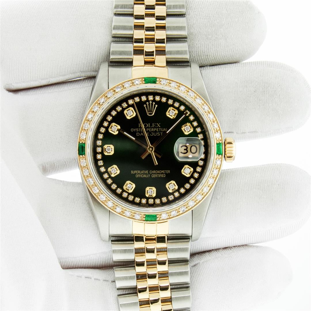 One Men's Yellow Gold Two Tone Rolex Datejust Polished, Serviced & Electronically Tested, Rolex Yellow Gold & Stainless Steel Case: 36mm, Rolex Yellow Gold Crown, Custom Bezel: New 18K Yellow Gold Emerald Beadset Diamond Bezel, Diamond Count: 36 Diamonds + 4 Emeralds, Total Weight 1.00 Carat, Clarity: SI-VS, Color: G to H. Custom Crystal: New Sapphire With Magnified Date Window. Custom Hands: New Luminescent Hands. Rolex Movement: Automatic Winding Movement. Custom Dial: Refinished To Green With Added Diamonds, Diamond Count: 58 Diamonds in Dial, G To H In Color, SI-VS Clarity. Date Window: 3 O'clock Position Date Display, Quickset, Model: Datejust. Condition: G-6 Extra Fine. Rolex Bracelet: Two Tone Yellow Gold & Stainless Steel Jubilee Band. Bright Polish. 7.0 Inch Length, Adjustable. Standard Clasp, With Rolex Logo. This Watch Has Been Serviced Time Tested And Is In Excellent Condition It Is Free Of All Scratches And Dents. This Pre Owned Watch Comes With A Rolex Box.