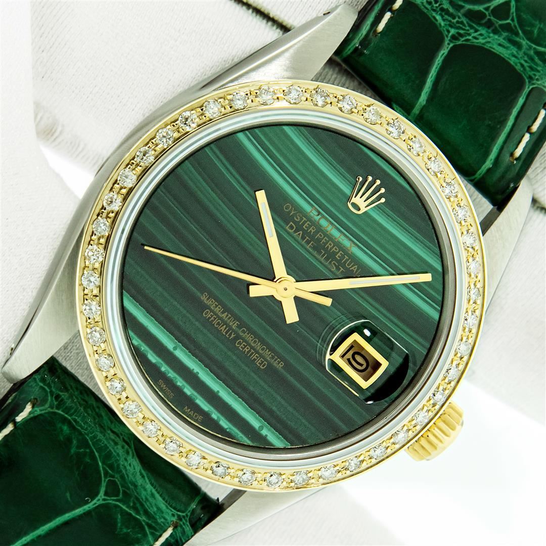 One Mens Yellow Gold Two Tone Rolex Datejust Polished, Serviced & Electronically Tested, Yellow Gold & Stainless Steel Case: 36mm, Yellow Gold Crown, Custom Bezel: New 18K Yellow Gold Beadset Diamond Bezel, Diamond Count: 44 Diamonds In Bezel, Total Bezel Weight 1.00 Carat, Clarity: SI-VS, Color: G to H. Custom Crystal: New Sapphire With Date Window. Custom Hands: New Luminescent Hands. Rolex Movement: Automatic Winding Movement. Custom Dial: Green Malachite Dial. Date Window: 3 O'Clock Position Date Display, Quickset, Model: Datejust. Condition: G-6 Extra Fine. Custom Band: New Green Leather Band With White Stitching. 7.0 Inch Length. New Custom Buckle Clasp. This Watch Has Been Serviced Time Tested And Is In Excellent Condition It Is Free Of All Scratches And Dents. This Watch Comes With A Rolex Box & Booklets.