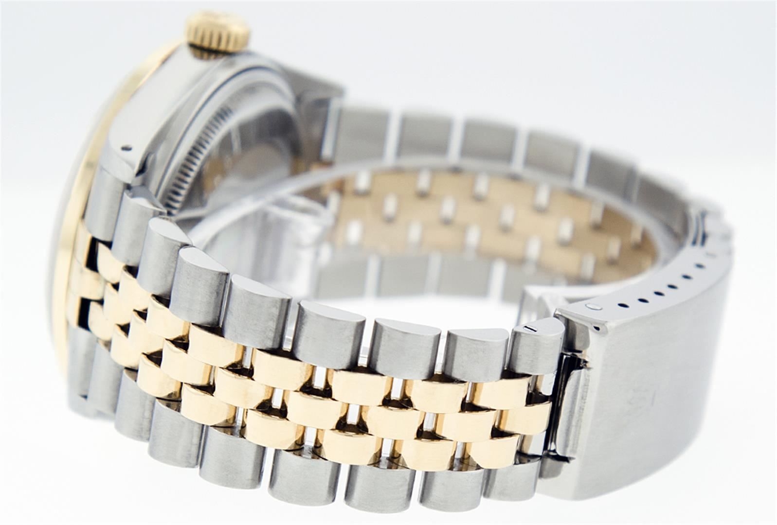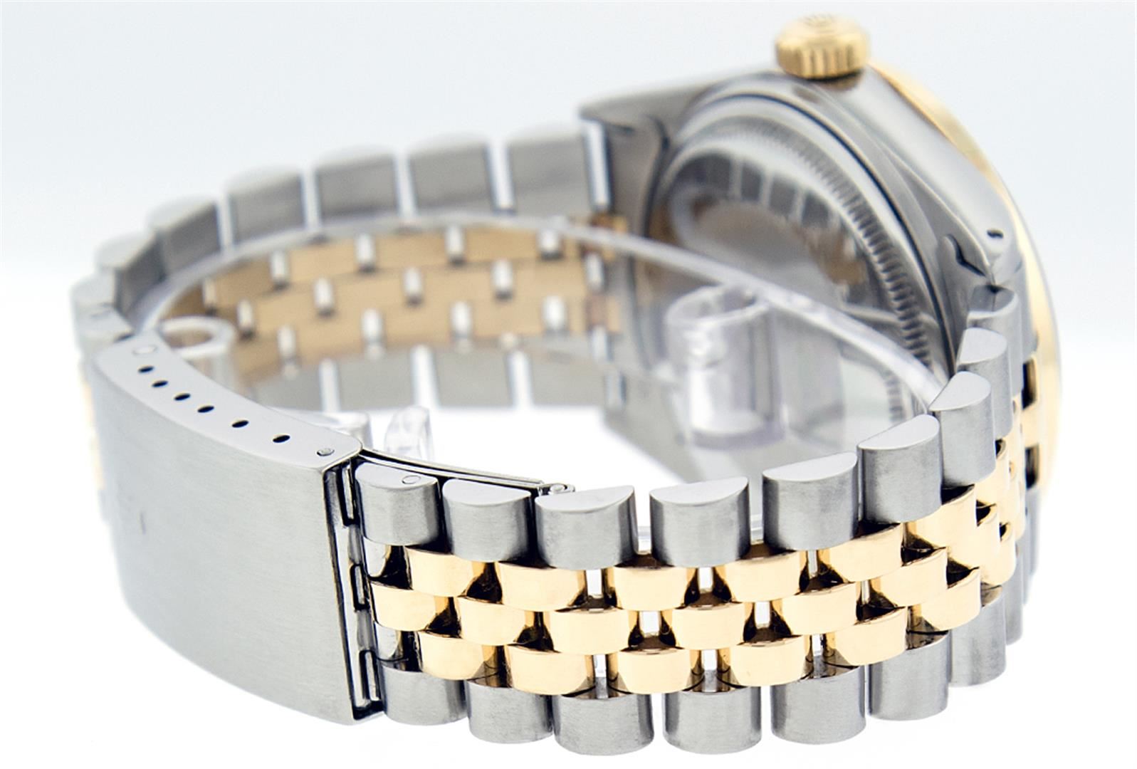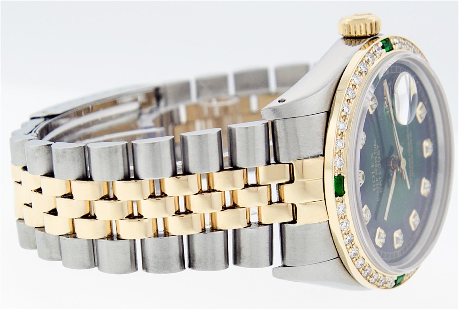 One Men's Two Tone Rolex Datejust Polished, Serviced & Electronically Tested, 14K Yellow Gold & Stainless Steel Case:36mm, 14K Yellow Gold Crown, Custom Bezel: 18K Yellow Gold Emerald Beadset Diamond Bezel, Diamond Count: 36 Diamonds + 4 Emeralds Total Weight 1.00 Carat, Clarity: Si-VS, Color: G to H. Custom Crystal: Synthetic Sapphire Cyclops Lens. Movement: Automatic Winding Movement Caliber 3035. Custom Dial: Green Vignette With Diamond Hour Markers. Diamond Count: 10 Diamonds Clarity: SI-VS, Color: Color G to H Date Window: 3 O'clock Position Date Display, Quickset, Model: 16013 Condition: G-6 Extra Fine. Bracelet: Two Tone 14K Yellow Gold & Stainless Steel Jubilee. Bright Polish. 6.5 Inch Length, Adjustable. Standard Clasp, With Rolex Logo.