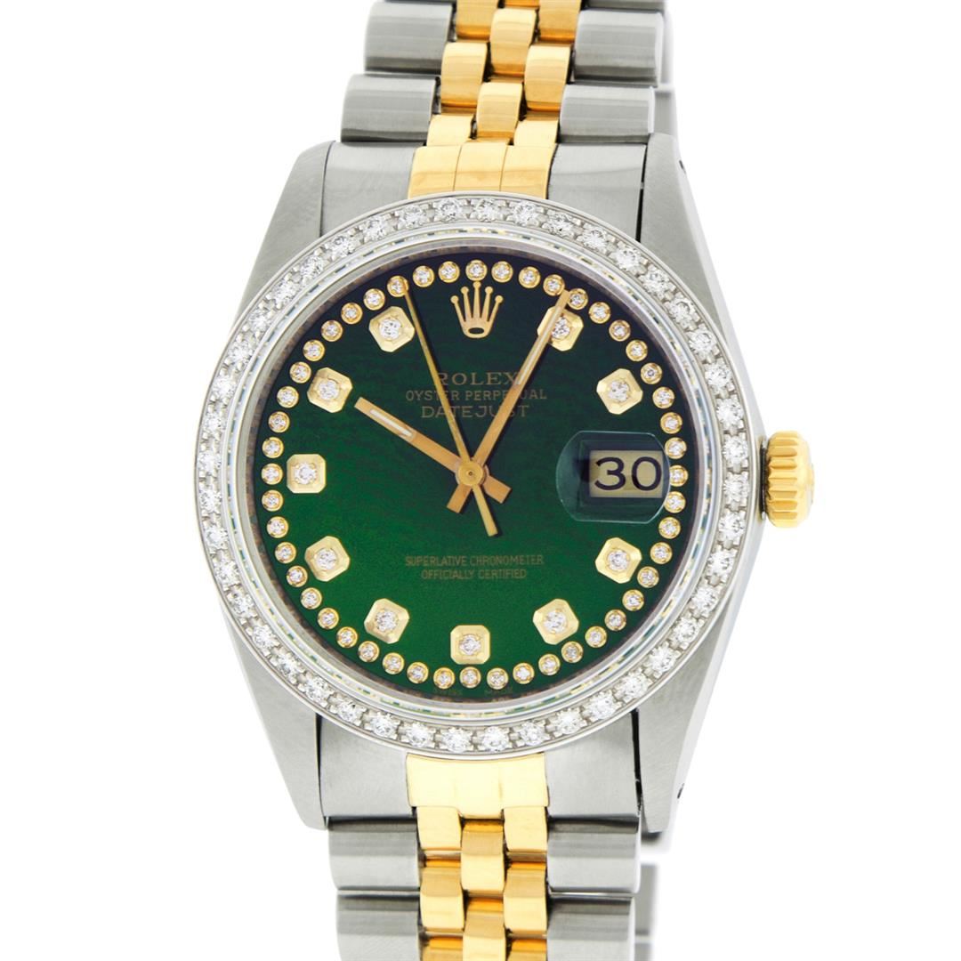One Men's 14K Yellow Gold Two Tone Rolex Datejust Polished, Serviced & Electronically Tested, 14K Yellow Gold & Stainless Steel Case: 36mm, 14K Yellow Gold Crown, Custom Bezel: New 18K White Gold Beadset Diamond Bezel, Diamond Count: 44 Diamonds, Total Weight 1.00 Carat, Clarity: SI-VS, Color: G to H. Custom Crystal: New Synthetic Sapphire Cyclops Lens. Movement: Automatic Winding Movement Caliber 3035. Custom Dial: Green String Diamond Dial, Diamond Count: 58 Diamonds, Color: G To H In Color, Clarity: SI-VS, Date Window: 3 O'clock Position Date Display, Quickset, Model: 16013 Datejust, Condition: G-6 Extra Fine. Bracelet: Two Tone 14K Yellow Gold & Stainless Steel Jubilee. Bright Polish. 7.0 Inch Length, Adjustable. Standard Clasp, With Rolex Logo. This Watch Has Been Serviced Time Tested And Is In Excellent Condition It Is Free Of All Scratches And Dents.