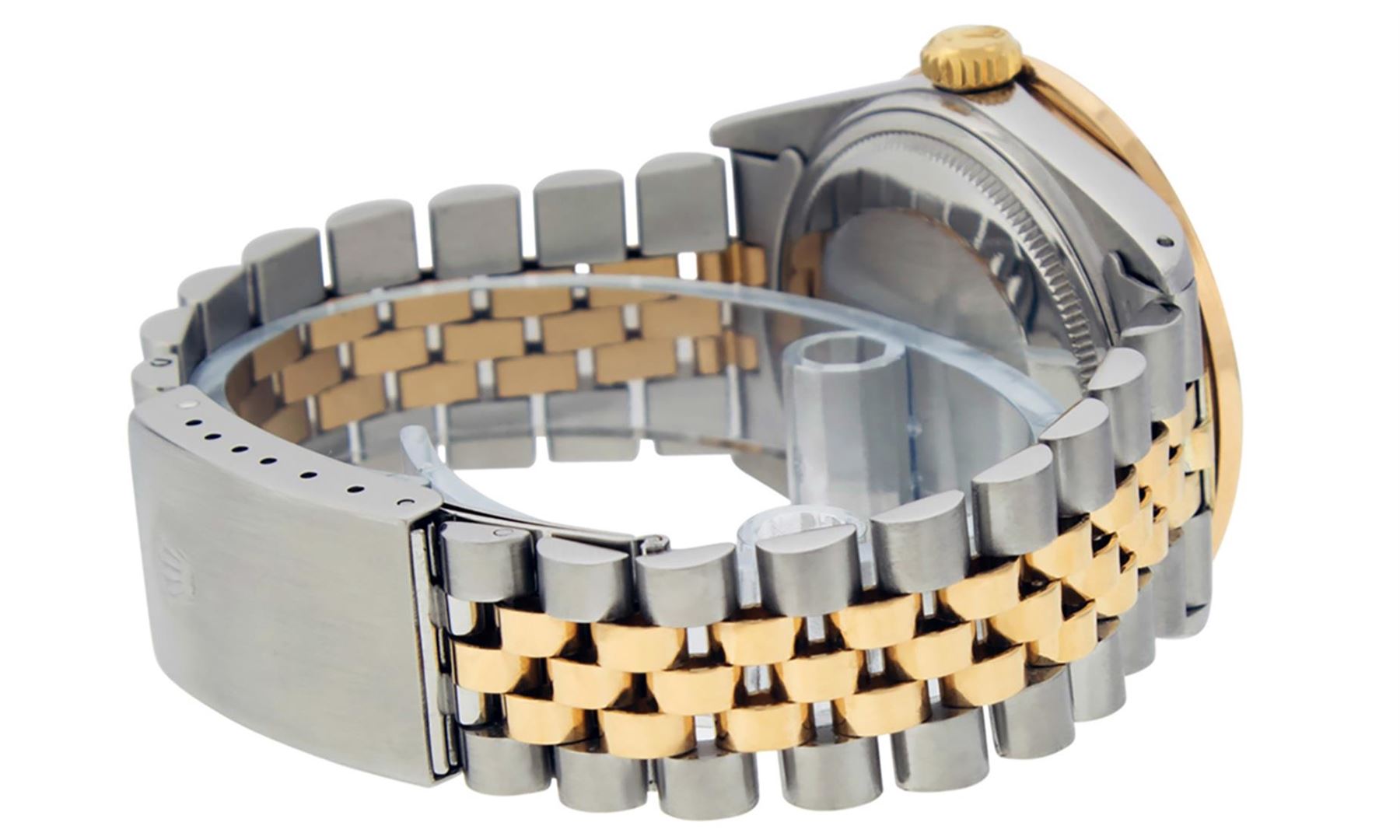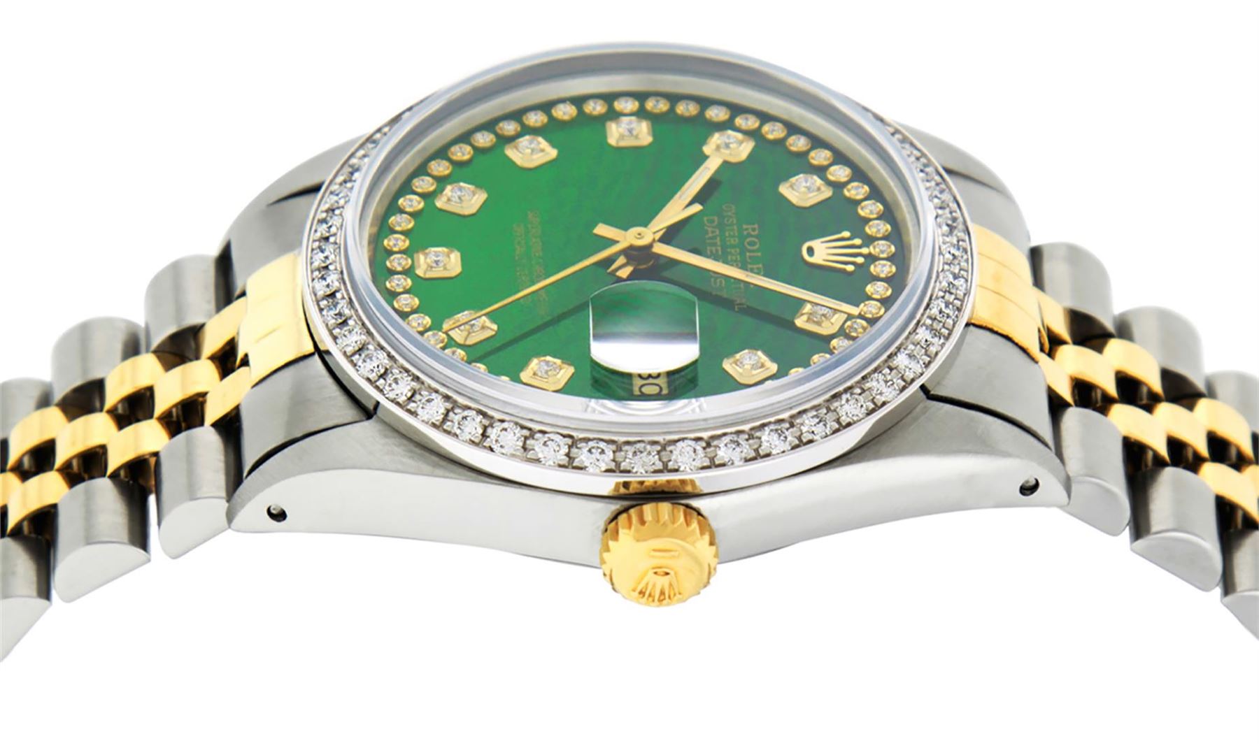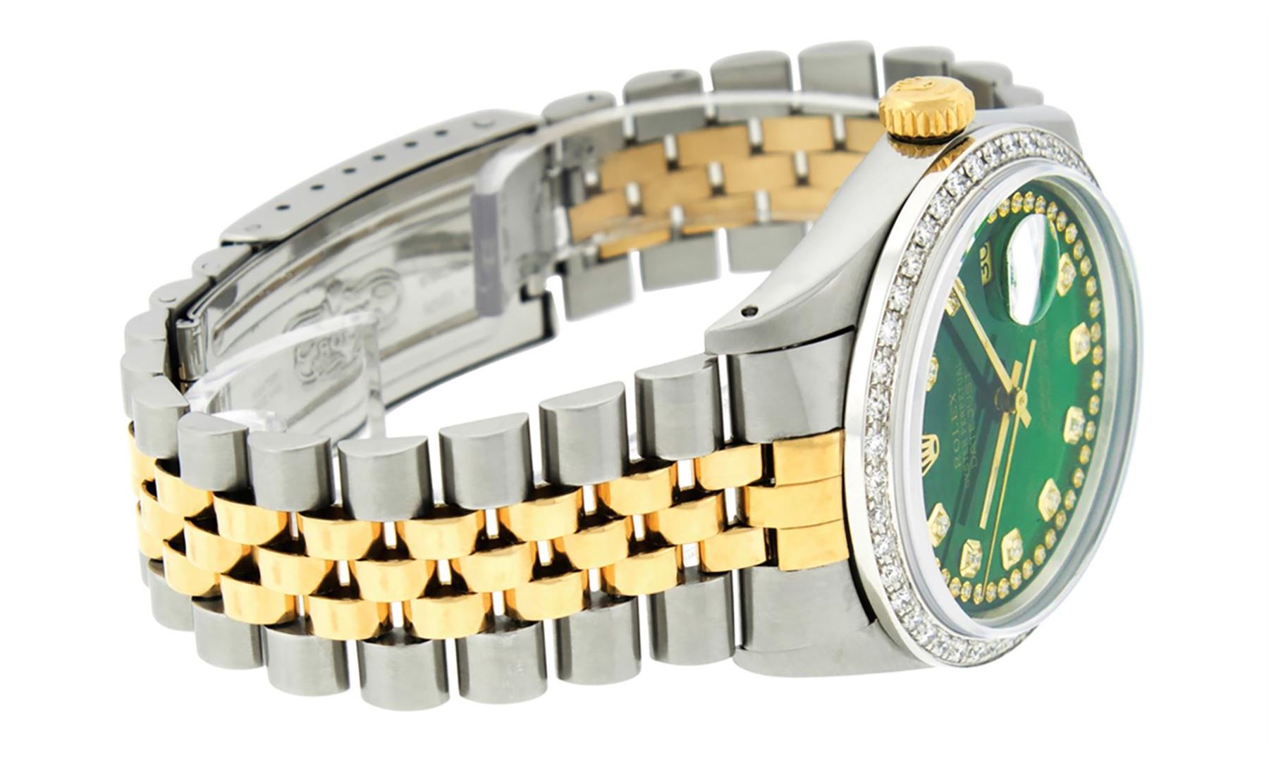 One Men's 14K Yellow Gold Two Tone Rolex Datejust Polished, Serviced & Electronically Tested, 14K Yellow Gold & Stainless Steel Case: 36mm, 14K Yellow Gold Crown, Custom Bezel: New 18K White Gold Beadset Diamond Bezel, Diamond Count: 44 Diamonds, Total Weight 1.00 Carat, Clarity: SI-VS, Color: G to H. Custom Crystal: New Synthetic Sapphire Cyclops Lens. Movement: Automatic Winding Movement Caliber 3035. Custom Dial: Green String Diamond Dial, Diamond Count: 58 Diamonds, Color: G To H In Color, Clarity: SI-VS, Date Window: 3 O'clock Position Date Display, Quickset, Model: 16013 Datejust, Condition: G-6 Extra Fine. Bracelet: Two Tone 14K Yellow Gold & Stainless Steel Jubilee. Bright Polish. 7.0 Inch Length, Adjustable. Standard Clasp, With Rolex Logo. This Watch Has Been Serviced Time Tested And Is In Excellent Condition It Is Free Of All Scratches And Dents.