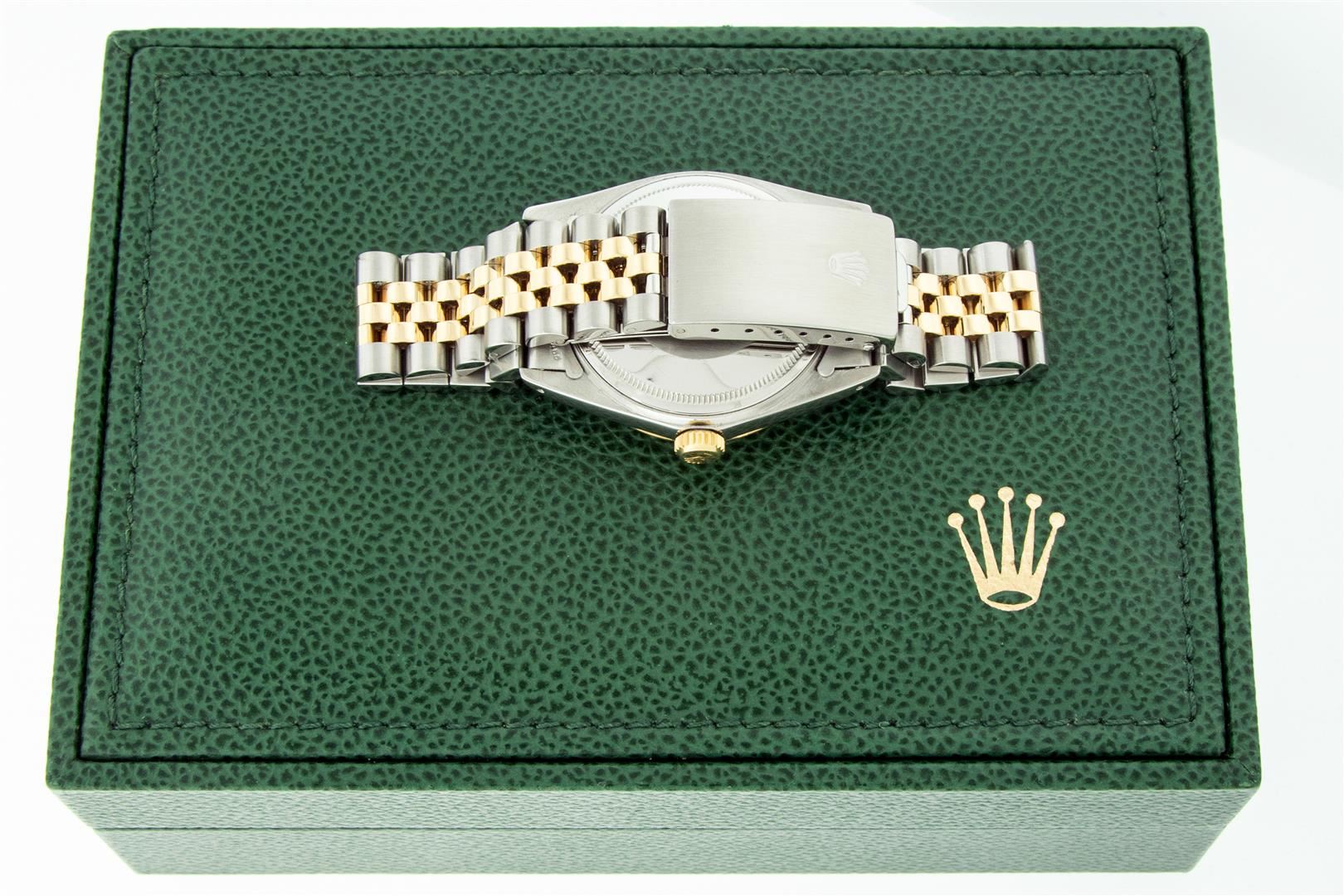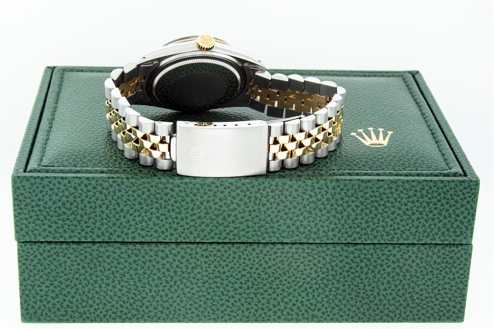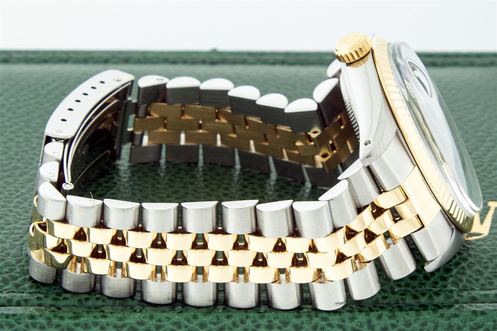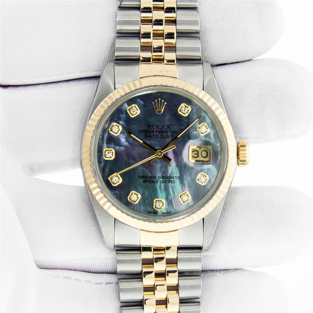One Men's Pre Owned Yellow Gold Two Tone Rolex Datejust Polished, Serviced & Electronically Tested, Rolex Yellow Gold & Stainless Steel Case: 36mm, Rolex Yellow Gold Crown, Rolex Bezel: Yellow Gold Fluted Bezel. Custom Crystal: New Acrylic Cyclops Lens. Custom Hands: New Luminescent Hands. Rolex Movement: Automatic Winding Movement. Custom Dial: Refinished To Tahitian Mother Of Pearl With Added Diamonds, Stone Count: 10 Diamonds On Dial, G To H In Color, SI-VS Clarity. Date Window: 3 O'Clock Position Date Display, Quickset, Model: Datejust. Condition: G-6 Extra Fine. Rolex Bracelet: Two Tone Yellow Gold & Stainless Steel Jubilee Band. Bright Polish. 7.0 Inch Length, Adjustable. Standard Clasp, With Rolex Logo. This Watch Has Been Serviced And Polished It Is Free Of All Scratches And Dents. This Watch Comes With A Rolex Box.