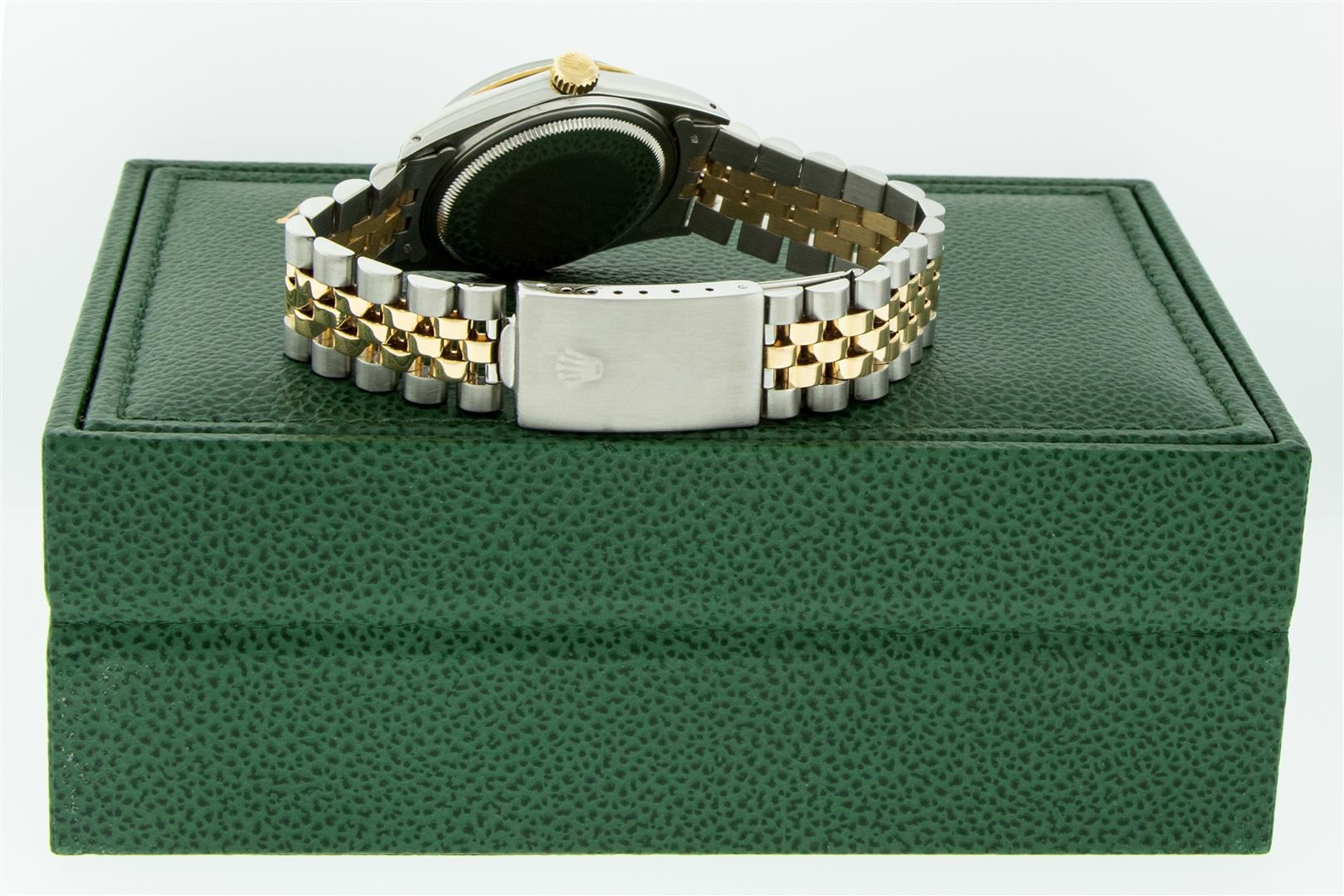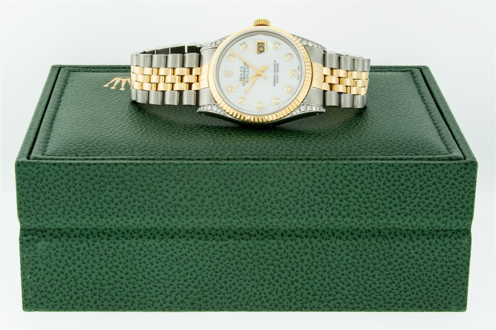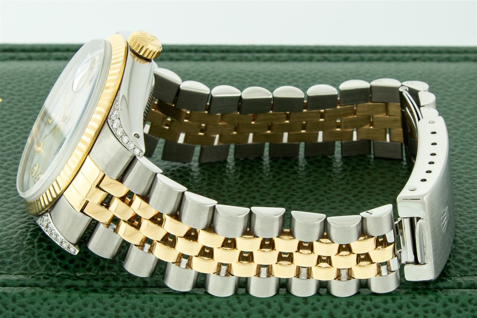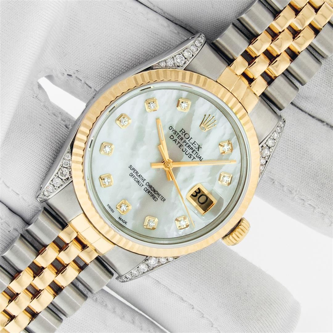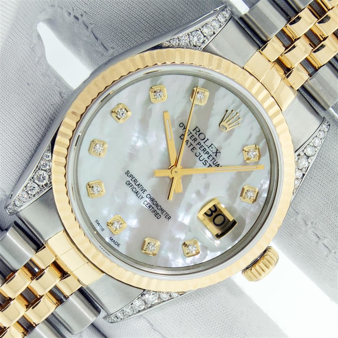 One Men's Pre Owned Yellow Gold Rolex Datejust Polished Bright with Satin Finish, Serviced & Electronically Tested, Stainless Steel Case: 36mm, Custom Diamond Lugs: Custom Added 28 Genuine Diamonds On Lugs, Color: G to H, Clarity: SI-VS. Yellow Gold Crown, Rolex Bezel: Yellow Gold Fluted Bezel. Custom Crystal: New Scratch Resistant Acrylic Cyclops Lens. Custom Hands: New Luminescent Hands. Rolex Movement: Automatic Winding Movement. Custom Dial: Dial Refinished To Mother Of Pearl With Custom Added Diamonds, Stone Count: 10 Diamonds On Dial, Color: G to H, Clarity: VS2. Date Window: 3 O'clock Position Date Display, Quickset, Model: Datejust. Condition: G-6 Extra Fine. Rolex Bracelet: Yellow Gold And Stainless Steel Jubilee Band. Bright Polish & Satin Finish. 7.0 Inch Length, Adjustable. Standard Clasp, With Rolex Logo. This Watch Has Been Serviced And Polished It Is Free Of All Scratches And Dents. This Watch Comes With A Rolex Box.