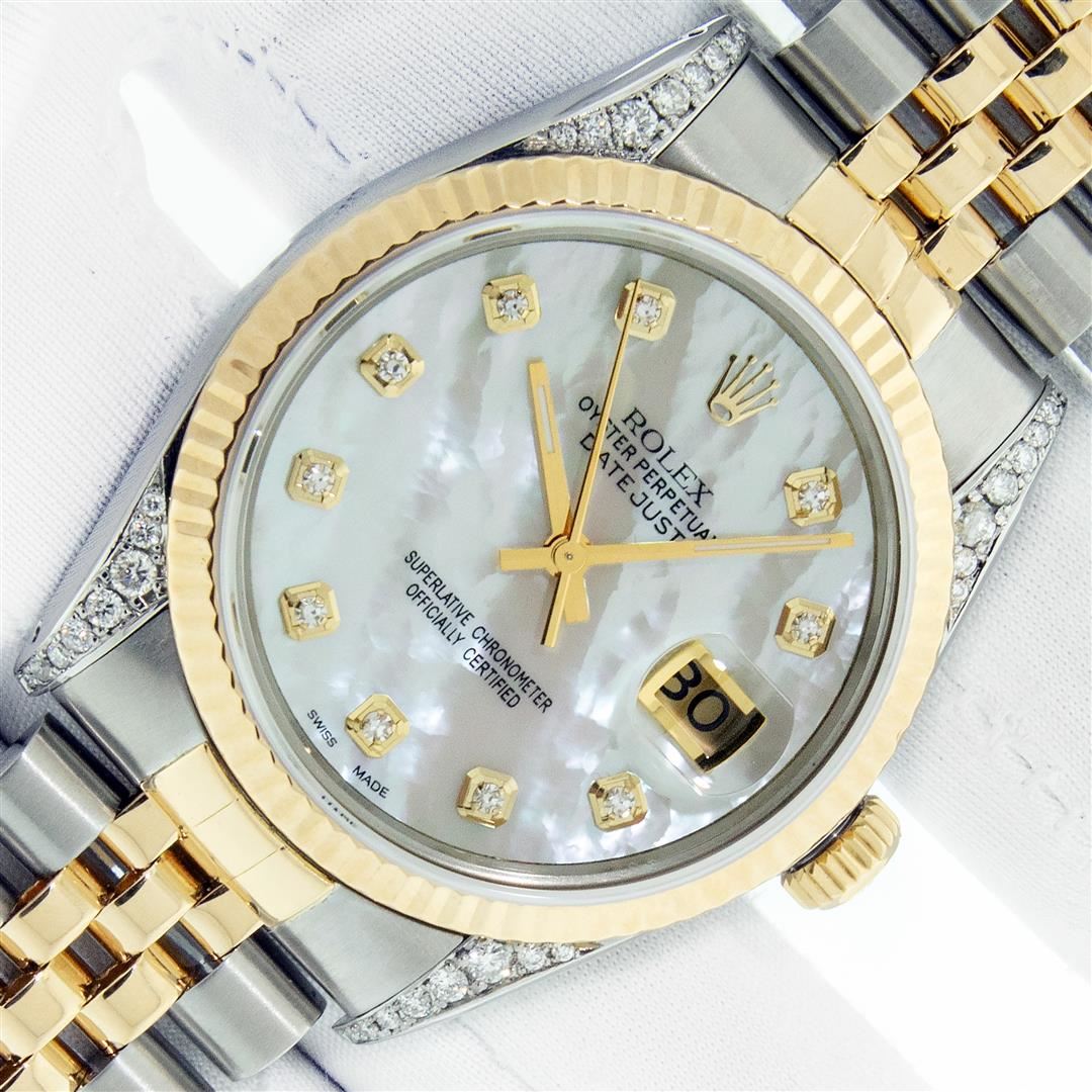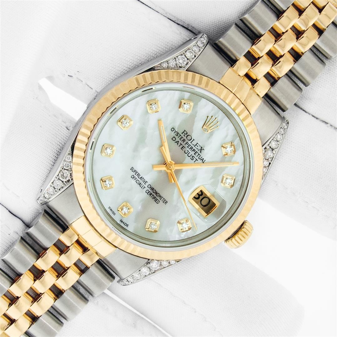 One Mens Pre Owned Two Tone Rolex Datejust Polished Bright with Satin Finish, Serviced & Electronically Tested, Stainless Steel Case: 36mm, Custom Diamond Lugs: Custom Added 28 Genuine Diamonds On Lugs, Color: G to H, Clarity: SI-VS. Yellow Gold Crown, Rolex Bezel: Yellow Gold Fluted Bezel. Custom Crystal: New Sapphire With Date Window. Custom Hands: New Luminecent Hands. Rolex Movement: Automatic Winding Movement. Custom Dial: Mother Of Pearl With Custom Added Genuine Diamonds, Stone Count: 10 Diamonds On Dial, Color: G to H, Clarity: VS2. Date Window: 3 O'Clock Position Date Display, Quickset, Model: Datejust. Condition: G-6 Extra Fine. Rolex Bracelet: Yellow Gold And Stainless Steel Jubilee Band. Bright Polish & Satin Finish. 7.0 Inch Length, Adjustable. Standard Clasp, With Rolex Logo. This Watch Has Been Serviced And Polished It Is Free Of All Scratches And Dents. This Watch Comes With A Rolex Box.