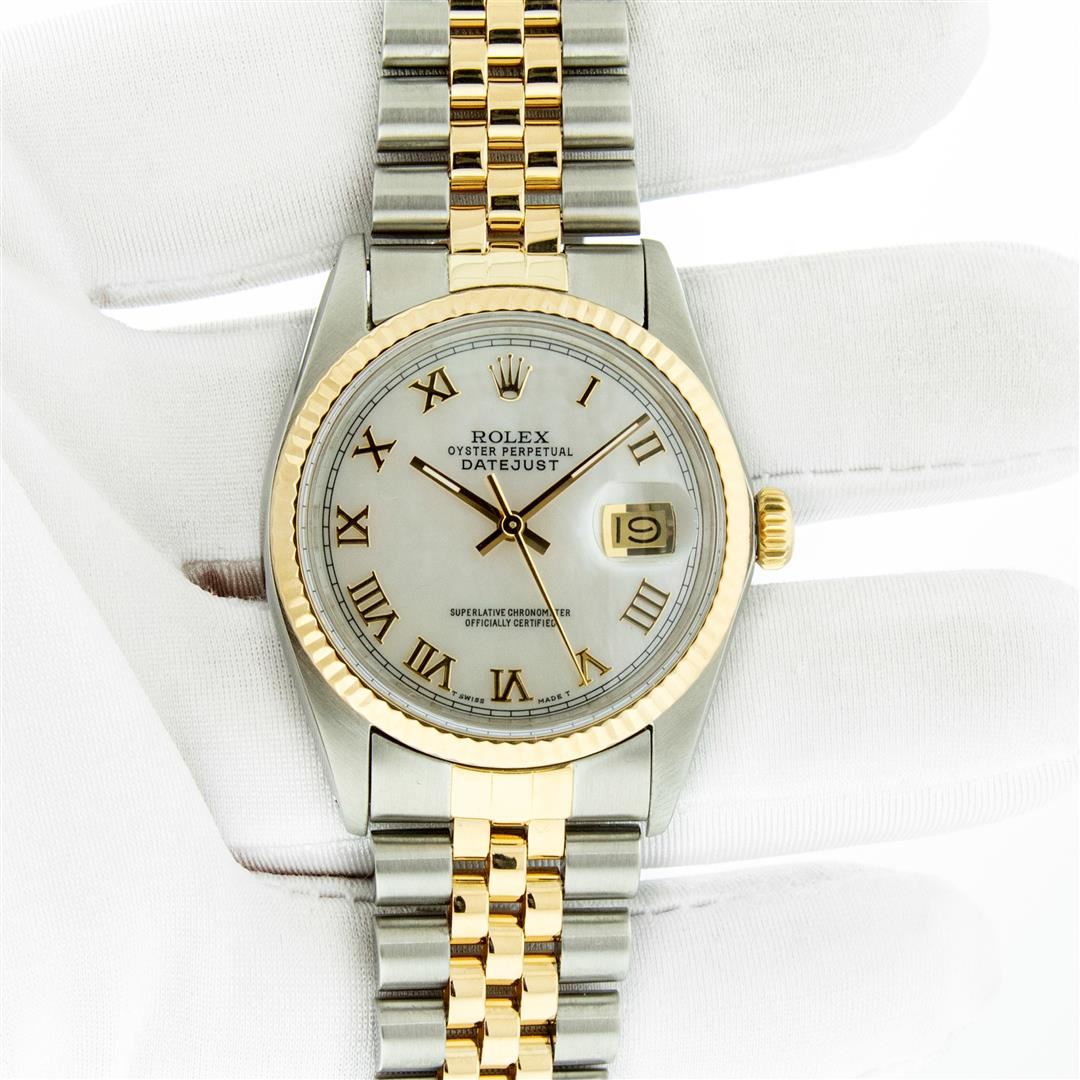 One Men's Pre Owned Yellow Gold Two Tone Rolex Datejust Polished, Serviced & Electronically Tested, Rolex Yellow Gold & Stainless Steel Case: 36mm, Rolex Yellow Gold Crown, Rolex Bezel: Yellow Gold Fluted Bezel. Custom Crystal: New Acrylic Cyclops Lens. Custom Hands: New Luminescent Hands. Rolex Movement: Automatic Winding Movement. Custom Dial: Refinished To Mother Of Pearl Roman With Square Track. Date Window: 3 O'Clock Position Date Display, Quickset, Model: Datejust. Condition: G-6 Extra Fine. Rolex Bracelet: Two Tone Yellow Gold & Stainless Steel Jubilee Band. Bright Polish. 7.0 Inch Length, Adjustable. Standard Clasp, With Rolex Logo. This Watch Has Been Serviced Time Tested And Is In Excellent Condition It Is Free Of All Scratches And Dents.