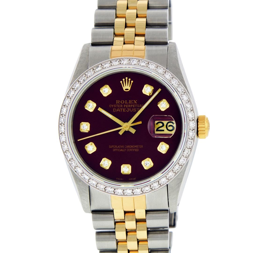 One Men's Yellow Gold Two Tone Rolex Datejust Polished, Serviced & Electronically Tested, 18K Yellow Gold & Stainless Steel Case: 36mm, 18K Yellow Gold Crown, Custom Bezel: New 18K White Gold Beadset Diamond Bezel, Diamond Count: 44 Diamonds, Total Weight 1.00 Carat, Clarity: SI-VS, Color: G to H. Crystal: New Synthetic Sapphire Cyclops Lens. Custom Hands: New Luminescent Hands. Movement: Automatic Winding Movement. Custom Dial: Maroon Diamond, Diamond Count: 10 Diamonds in Dial G To H In Color, Clarity: VS, Date Window: 3 O'Clock Position Date Display, Quickset, Model: Condition: G-6 Extra Fine. Bracelet: Two Tone Yellow Gold & Stainless Steel Jubilee. Bright Polish. 7.0 Inch Length, Adjustable. Standard Clasp, With Rolex Logo. This Watch Has Been Serviced Time Tested And Is In Excellent Condition It Is Free Of All Scratches And Dents.