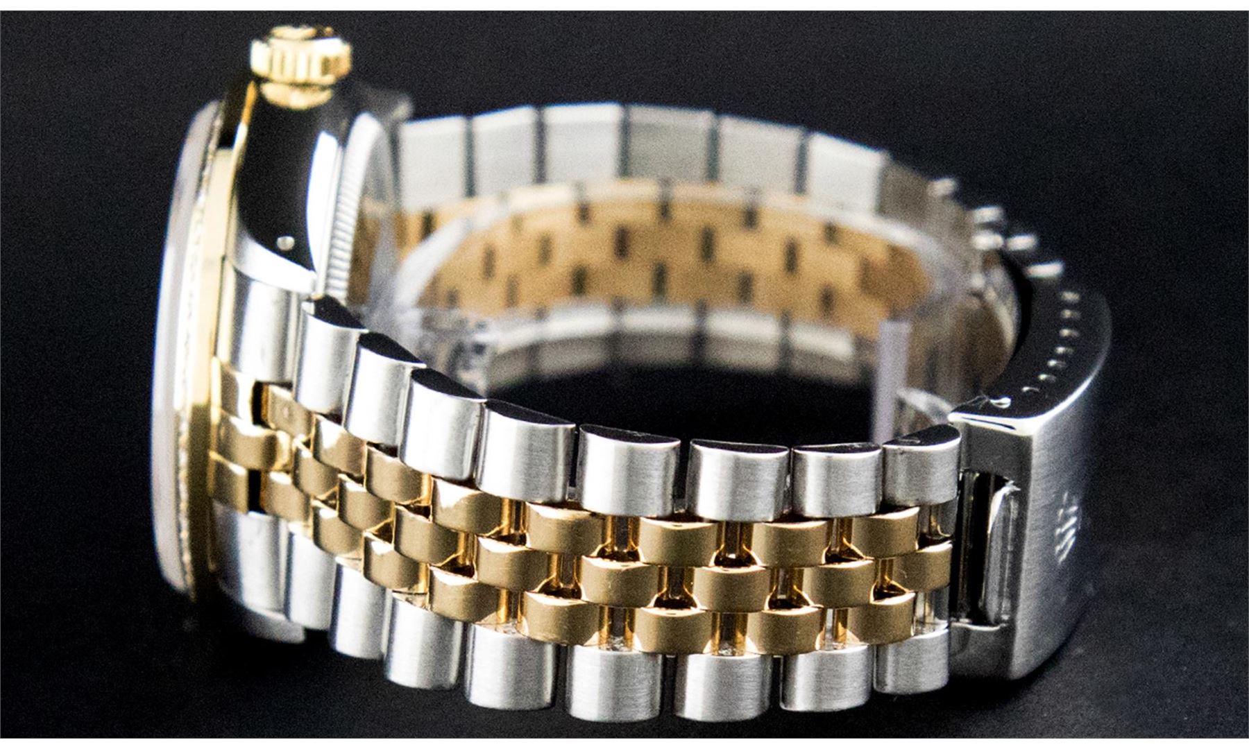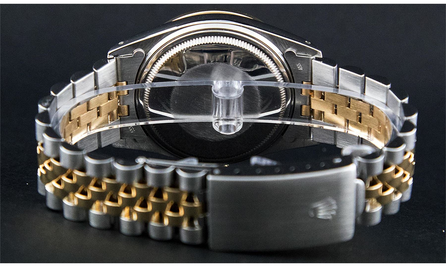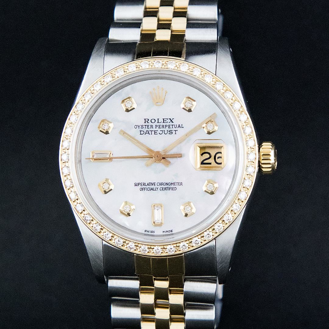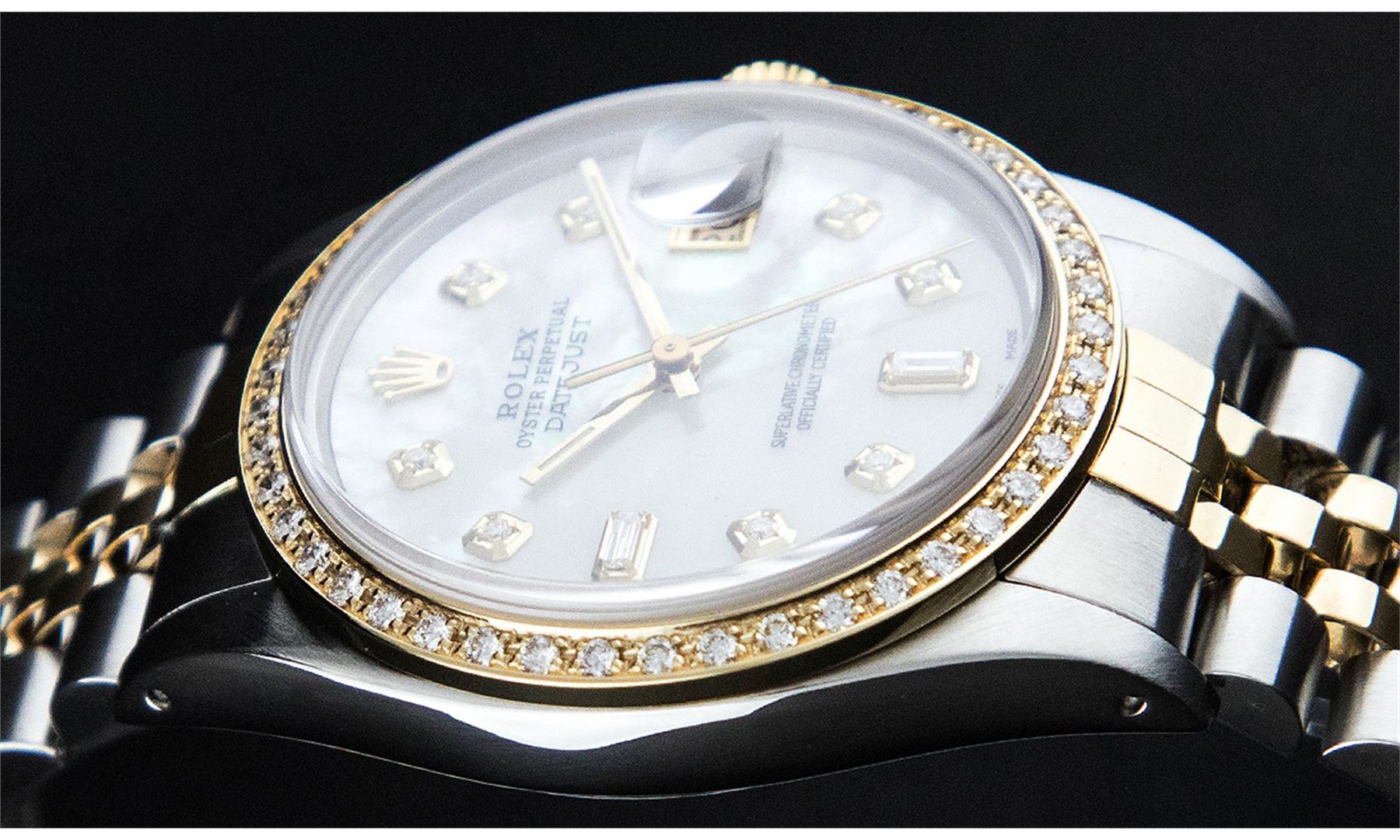 One Men's Yellow Gold Two Tone Rolex Datejust Polished, Serviced & Electronically Tested, Yellow Gold & Stainless Steel Case: 36mm, Yellow Gold Crown, Custom Bezel: New 18K Yellow Gold Beadset Diamond Bezel, Diamond Count: 44 Diamonds, Total Weight 1.00 Carat, Clarity: SI-VS, Color: G to H. Custom Crystal: New Synthetic Sapphire Cyclops Lens. Movement: Automatic Winding Movement. Custom Dial: Mother Of Pearl Diamond Dial with 2 Baguette Hour Markers, Diamond Count: 8 Diamonds + 2 Baguette Diamond Hour Markers, Color: G To H In Color, Clarity: SI-VS, Date Window: 3 O'Clock Position Date Display, Quickset, Model: Datejust. Condition: G-6 Extra Fine. Bracelet: Two Tone Yellow Gold & Stainless Steel Jubilee. Bright Polish. 7.0 Inch Length, Adjustable. Standard Clasp, With Rolex Logo. This Watch Has Been Serviced Time Tested And Is In Excellent Condition It Is Free Of All Scratches And Dents.