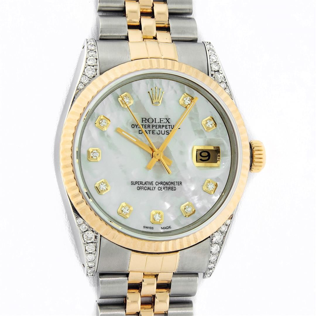 One Men's Pre Owned Yellow Gold Rolex Datejust Polished Bright with Satin Finish, Serviced & Electronically Tested, Stainless Steel Case: 36mm, Custom Diamond Lugs: 28 Diamonds On Lugs, Color: G to H, Clarity: SI-VS. Yellow Gold Crown, Rolex Bezel: Yellow Gold Fluted Bezel. Custom Crystal: New Scratch Resistant Acrylic Cyclops Lens. Custom Hands: New Luminescent Hands. Movement: Automatic Winding Movement. Custom Dial: Refinished To Mother Of Pearl With Added Diamonds, Stone Count: 10 Diamonds On Dial, Color: G to H, Clarity: VS2. Date Window: 3 O'Clock Position Date Display, Quickset, Model: Datejust. Condition: G-6 Extra Fine. Rolex Bracelet: Yellow Gold And Stainless Steel Jubilee Band. Bright Polish & Satin Finish. 7.0 Inch Length, Adjustable. Standard Clasp, With Rolex Logo. This Watch Has Been Serviced And Polished It Is Free Of All Scratches And Dents.