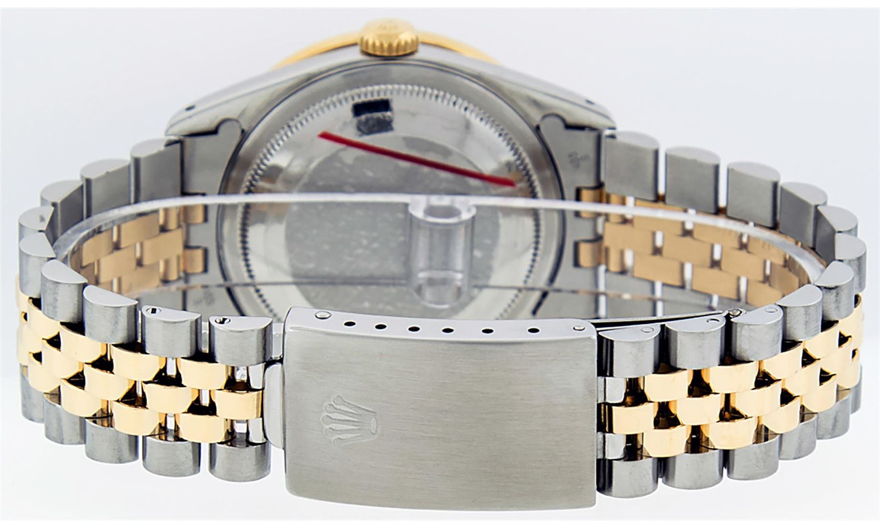 One Men's Pre Owned Yellow Gold Rolex Datejust Polished Bright with Satin Finish, Serviced & Electronically Tested, Rolex Stainless Steel Case: 36mm, Custom Diamond Lugs: 28 Diamonds On Lugs, Color: G to H, Clarity: SI-VS. Rolex Yellow Gold Crown, Rolex Bezel: Yellow Gold Fluted Bezel. Custom Crystal: New Scratch Resistant Acrylic Cyclops Lens. Custom Hands: New Luminescent Hands. Rolex Movement: Automatic Winding Movement. Custom Dial: Refinish To Mother Of Pearl With Added Diamonds, Stone Count: 8 Diamonds + 2 Baguette Diamonds On Dial, Color: G to H, Clarity: VS2. Date Window: 3 O'Clock Position Date Display, Quickset, Model: Datejust. Condition: G-6 Extra Fine. Rolex Bracelet: Yellow Gold And Stainless Steel Jubilee Band. Bright Polish & Satin Finish. 7.0 Inch Length, Adjustable. Standard Clasp, With Rolex Logo. This Watch Has Been Serviced And Polished It Is Free Of All Scratches And Dents.