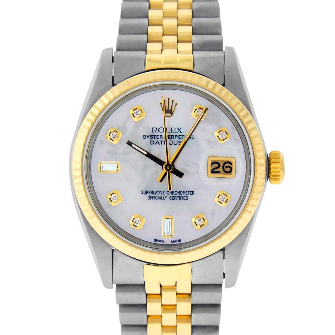 One Men's Pre Owned Yellow Gold Two Tone Rolex Datejust Polished, Serviced & Electronically Tested, Rolex Yellow Gold & Stainless Steel Case: 36mm, Rolex Yellow Gold Crown, Rolex Bezel: Yellow Gold Fluted Bezel. Custom Crystal: New Acrylic Cyclops Lens. Custom Hands: New Luminescent Hands. Rolex Movement: Automatic Winding Movement. Custom Dial: Mother Of Pearl Diamond Dial, Stone Count: 8 Diamonds + 2 Baguette Diamonds in Dial, G To H In Color, SI-VS Clarity. Date Window: 3 O'Clock Position Date Display, Quickset, Model: Datejust. Condition: G-6 Extra Fine. Rolex Bracelet: Two Tone Yellow Gold & Stainless Steel Jubilee Band. Bright Polish. 7.0 Inch Length, Adjustable. Standard Clasp, With Rolex Logo. This Watch Has Been Serviced And Polished It Is Free Of All Scratches And Dents.