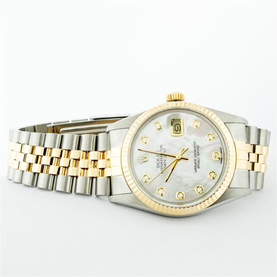 One Men's Yellow Gold Two Tone Rolex Datejust Polished, Serviced & Electronically Tested, Yellow Gold & Stainless Steel Case: 36mm, Yellow Gold Crown, Bezel: 18K Yellow Gold Fluted Bezel. Custom Crystal: New Acrylic Cyclops Lens. Custom Hands: New Hands. Movement: Automatic Winding Movement. Custom Dial: Mother Of Pearl Dial Set With Diamond Hour Markers, Diamond Count: 10 Diamonds in Dial G To H In Color, VS Clarity. Date Window: 3 O'clock Position Date Display, Quickset, Model: Condition: G-6 Extra Fine. Bracelet: Two Tone Yellow Gold & Stainless Steel Jubilee. Bright Polish. 7.0 Inch Length, Adjustable. Standard Clasp, With Rolex Logo. Watch Has Been Serviced And Polished It Is Free Of All Scratches And Dents. This Watch Has Been Serviced Time Tested And Is In Excellent Condition It Is Free Of All Scratches And Dents.