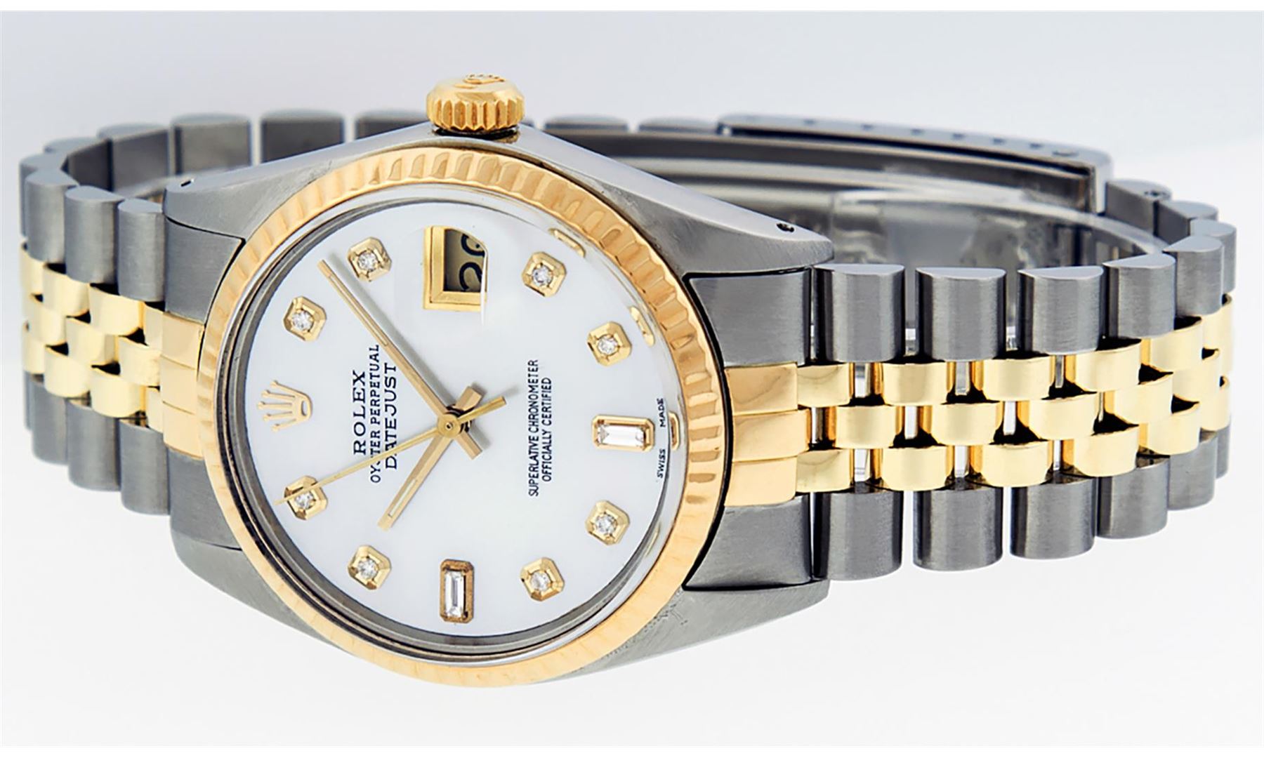 One Men's Pre Owned Yellow Gold Two Tone Rolex Datejust Polished, Serviced & Electronically Tested, Rolex Yellow Gold & Stainless Steel Case: 36mm, Rolex Yellow Gold Crown, Rolex Bezel: Yellow Gold Fluted Bezel. Custom Crystal: New Acrylic Cyclops Lens. Custom Hands: New Luminescent Hands. Rolex Movement: Automatic Winding Movement. Custom Dial: Refinished To Mother Of Pearl Diamond Dial, Stone Count: 8 Diamonds + 2 Diamond Baguettes in Dial, G To H In Color, SI-VS Clarity. Date Window: 3 O'Clock Position Date Display, Quickset, Model: Datejust. Condition: G-6 Extra Fine. Rolex Bracelet: Two Tone Yellow Gold & Stainless Steel Jubilee Band. Bright Polish. 7.0 Inch Length, Adjustable. Standard Clasp, With Rolex Logo. This Watch Has Been Serviced And Polished It Is Free Of All Scratches And Dents.