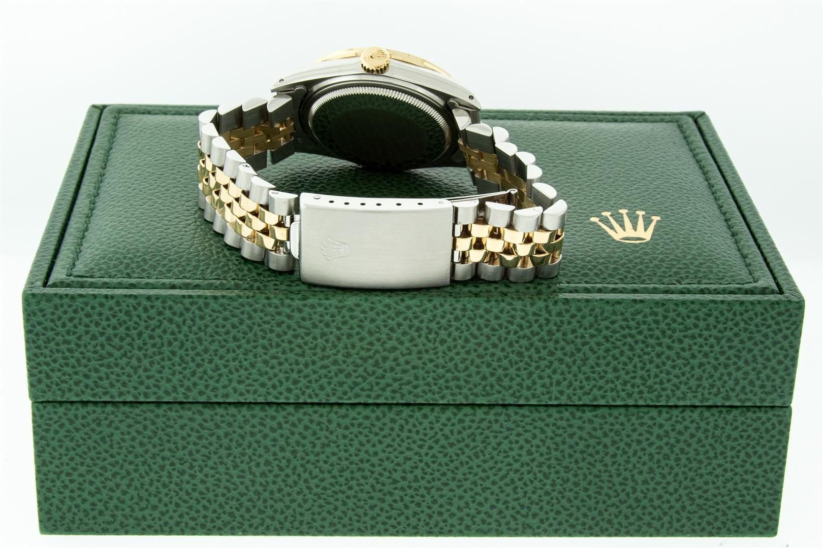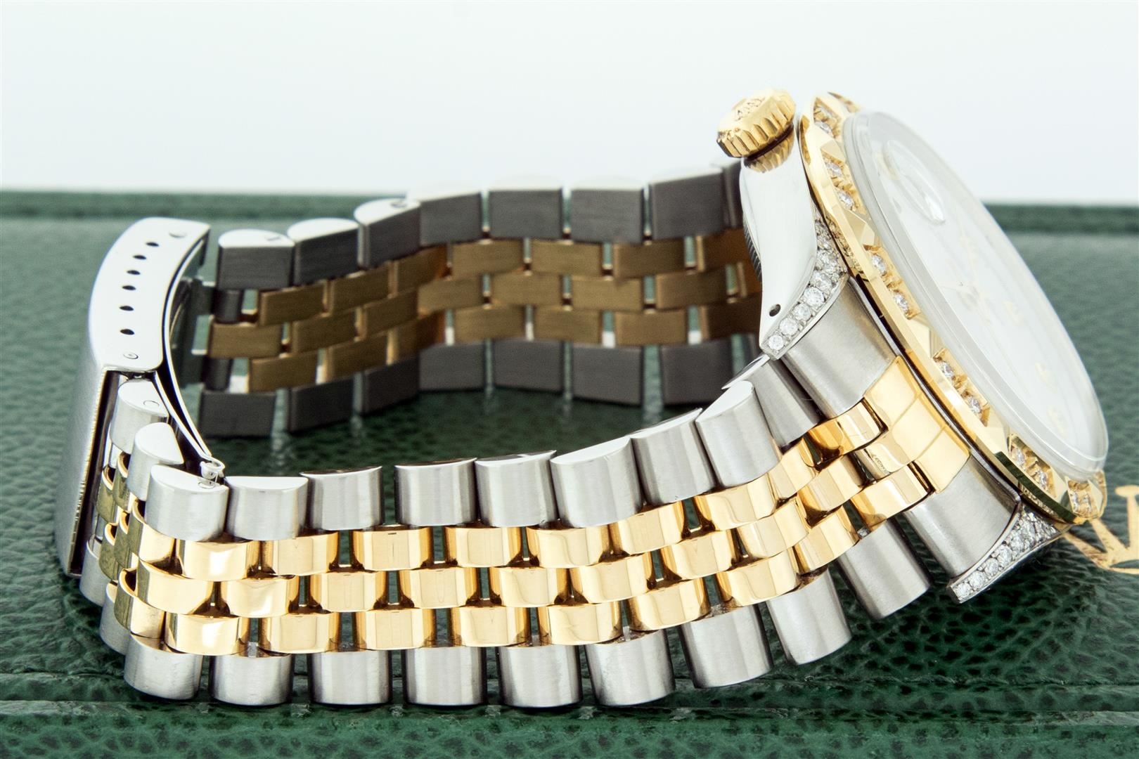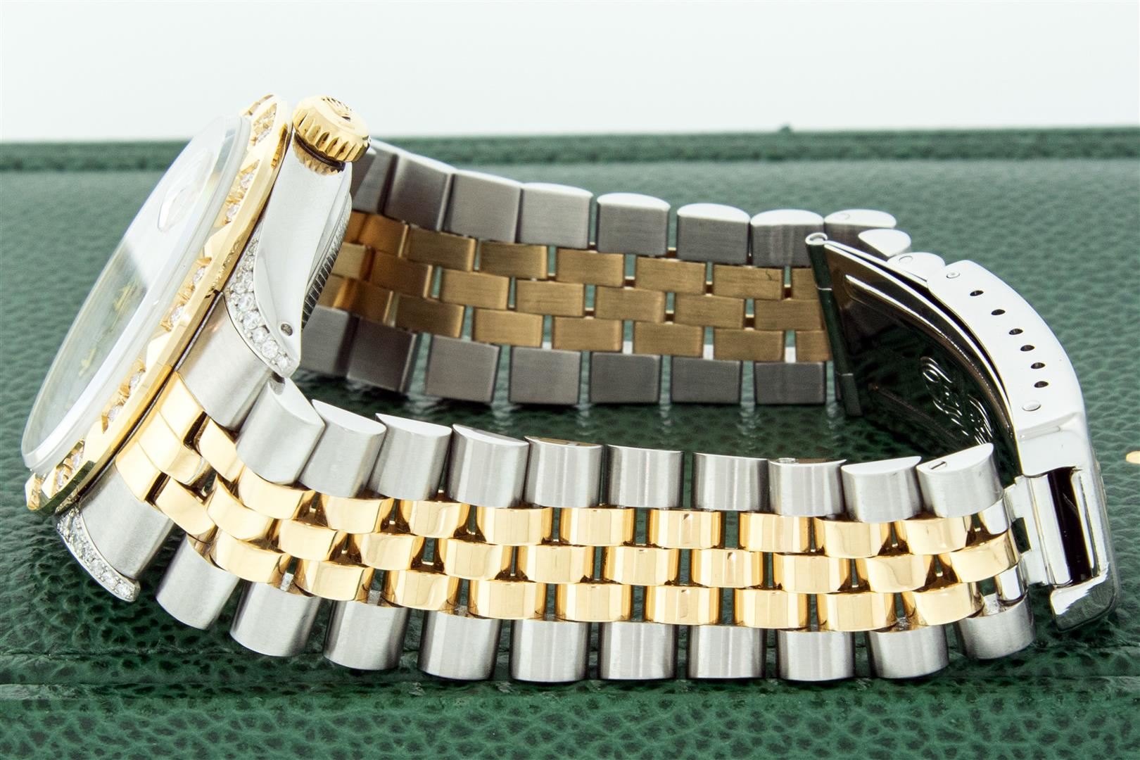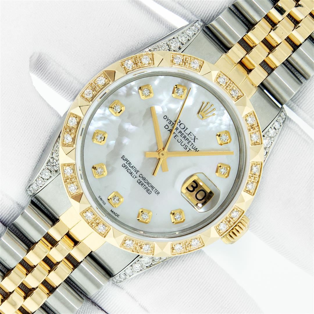 One Men's Yellow Gold Rolex Datejust Polished Bright with Satin Finish, Serviced & Electronically Tested, Stainless Steel Case: 36mm, Custom Diamond Lugs: 28 Diamonds In Lugs, Color: G to H, Clarity: SI-VS. Yellow Gold Crown, Custom Bezel: New 18K Yellow Gold Pyramid Diamond Bezel, Diamond Count: 24 Diamonds, Total Weight .75 Carat, Clarity: SI-VS, Color: G to H. Custom Crystal: New Sapphire With Magnified Date Window. Custom Hands: New Luminescent Hands. Rolex Movement: Automatic Winding Movement. Custom Dial: Mother Of Pearl Diamond, Stone Count: 10 Diamonds On Dial, Color: G to H, Clarity: VS. Date Window: 3 O'clock Position Date Display, Quickset, Model: Datejust. Condition: G-6 Extra Fine. Rolex Bracelet: Yellow Gold And Stainless Steel Jubilee Band. Bright Polish & Satin Finish. 7.0 Inch Length, Adjustable. Standard Clasp, With Rolex Logo. This Pre Owned Watch Has Been Serviced And Polished It Is Free Of All Scratches And Dents. This Watch Comes With A Rolex Box.