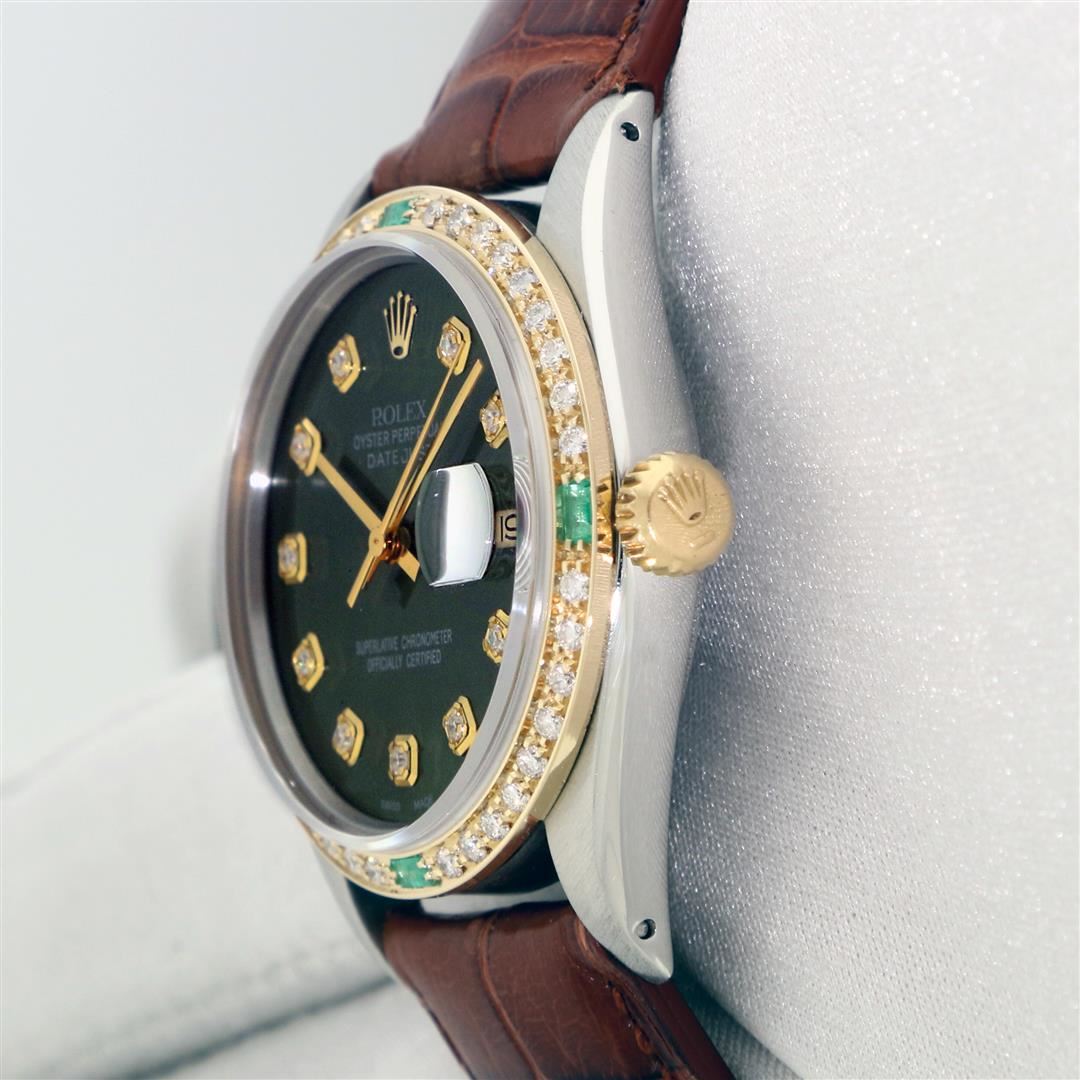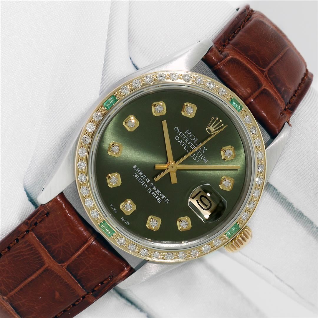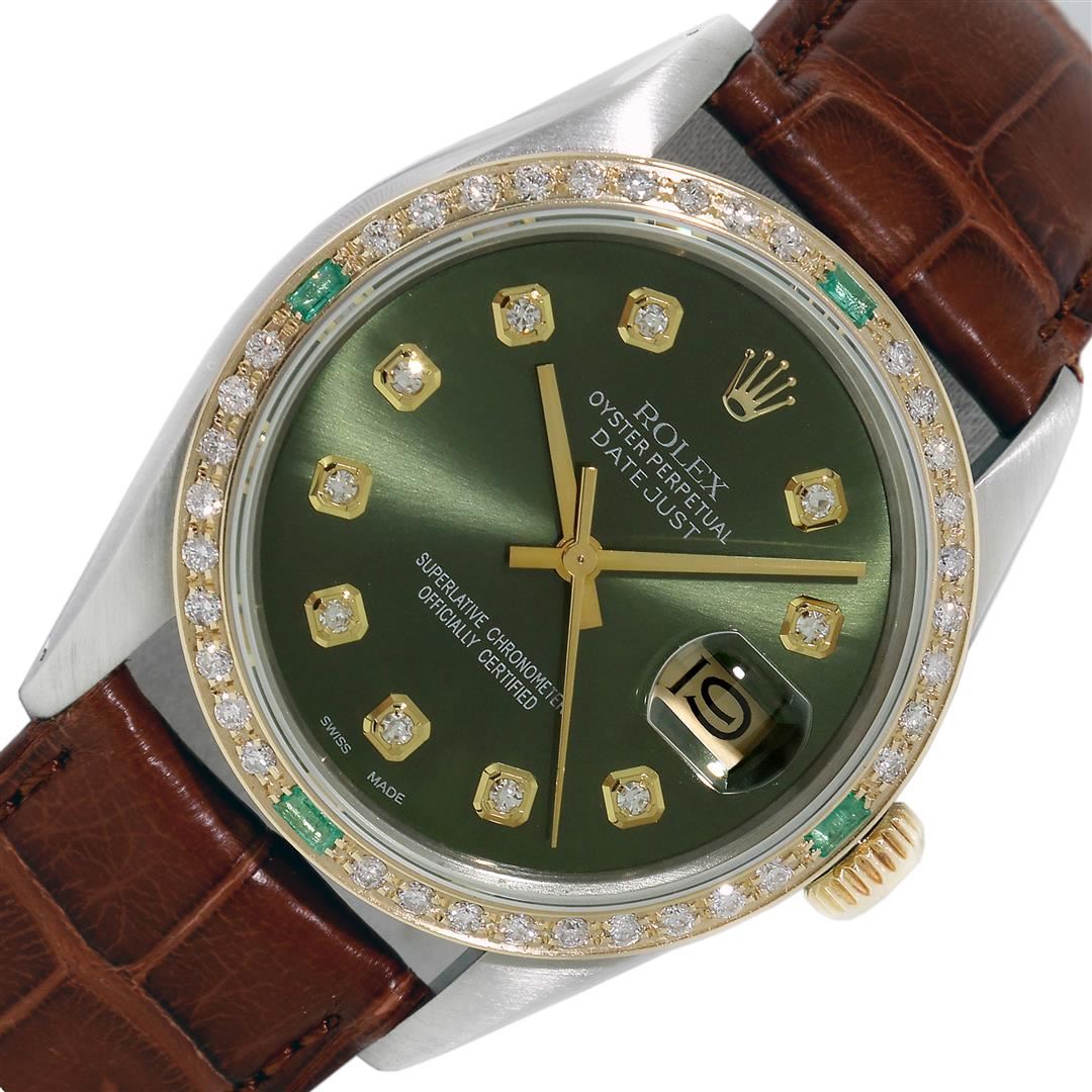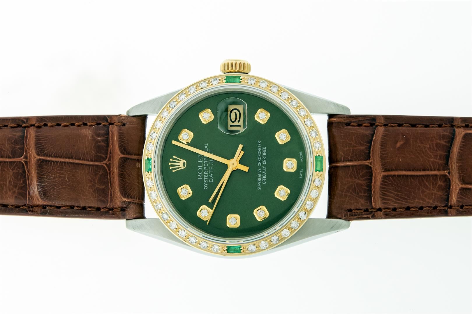 One Men's Yellow Gold Two Tone Rolex Datejust Polished, Serviced & Electronically Tested, Yellow Gold & Stainless Steel Case: 36mm, Rolex Yellow Gold Crown, Custom Bezel: New 18K Yellow Gold Emerald Beadset Diamond Bezel, Diamond Count: 36 Diamonds + 4 Emeralds In Bezel, Total Bezel Weight 1.00 Carat, Clarity: SI-VS, Color: G to H. Custom Crystal: New Sapphire With Magnified Date Window. Custom Hands: New Luminescent Hands. Rolex Movement: Automatic Winding Movement. Custom Dial: Refinished To Green With Added Diamond Hour Markers. Date Window: 3 O'clock Position Date Display, Quickset, Model: Datejust. Condition: G-6 Extra Fine. Custom Band: New Brown Leather Band 7.0 Inch Length. New Custom Pin Buckle Clasp. This Pre Owned Watch Has Been Serviced Time Tested And Is In Excellent Condition It Is Free Of All Scratches And Dents.