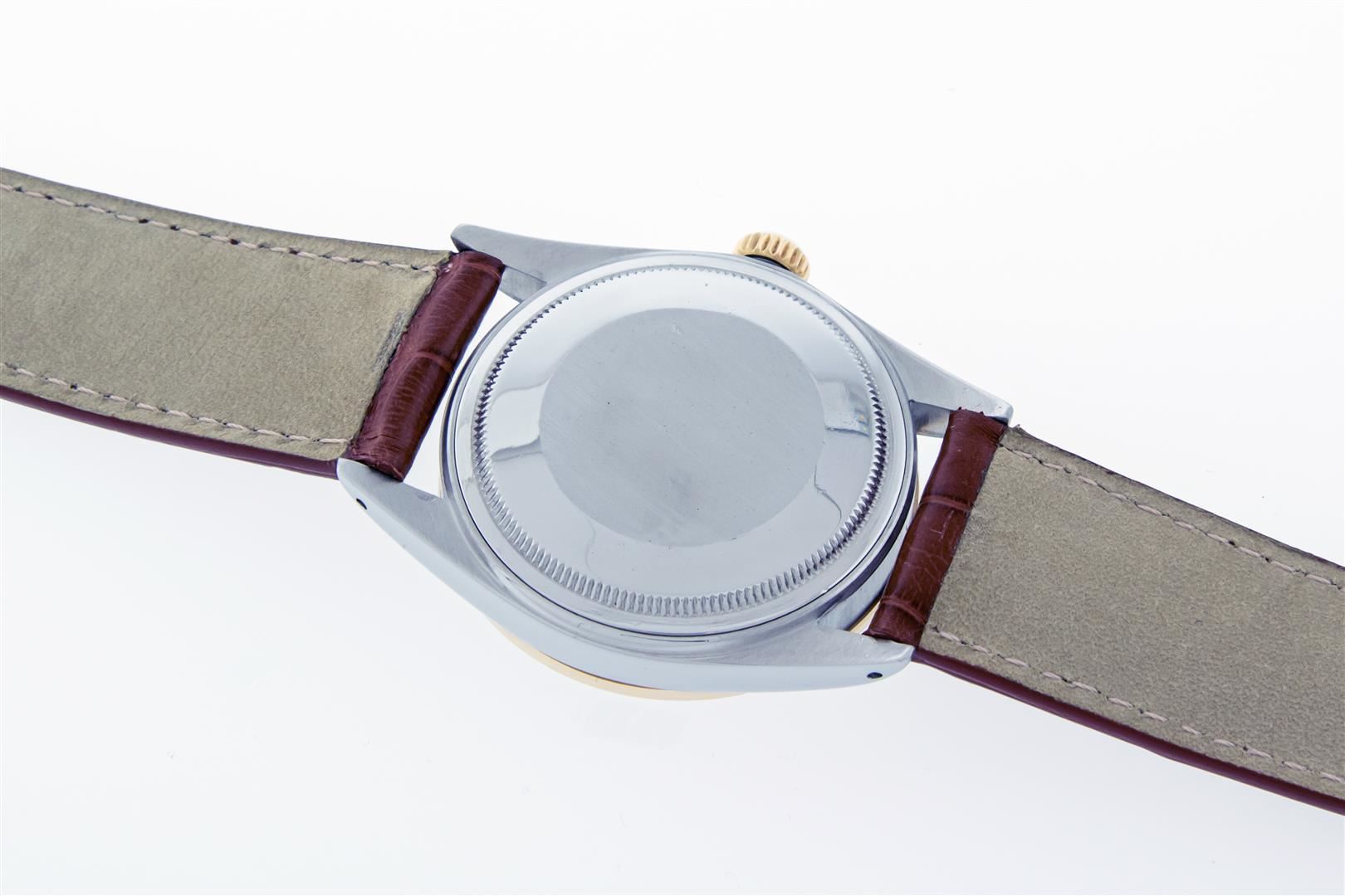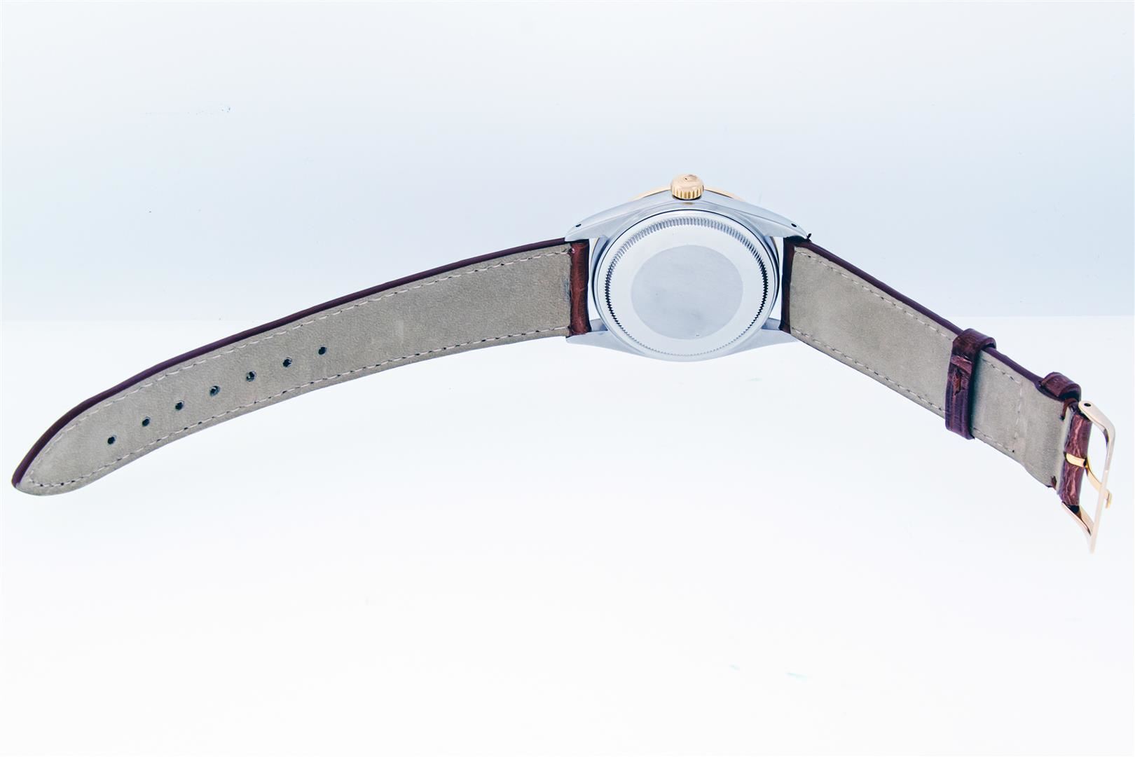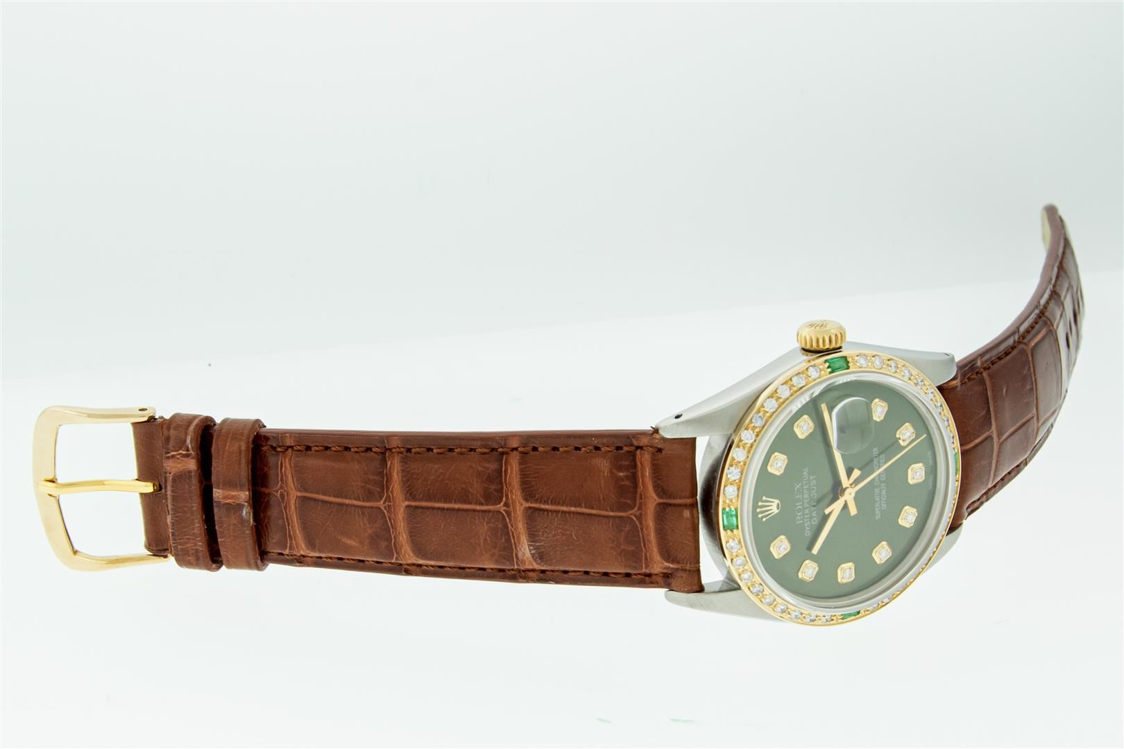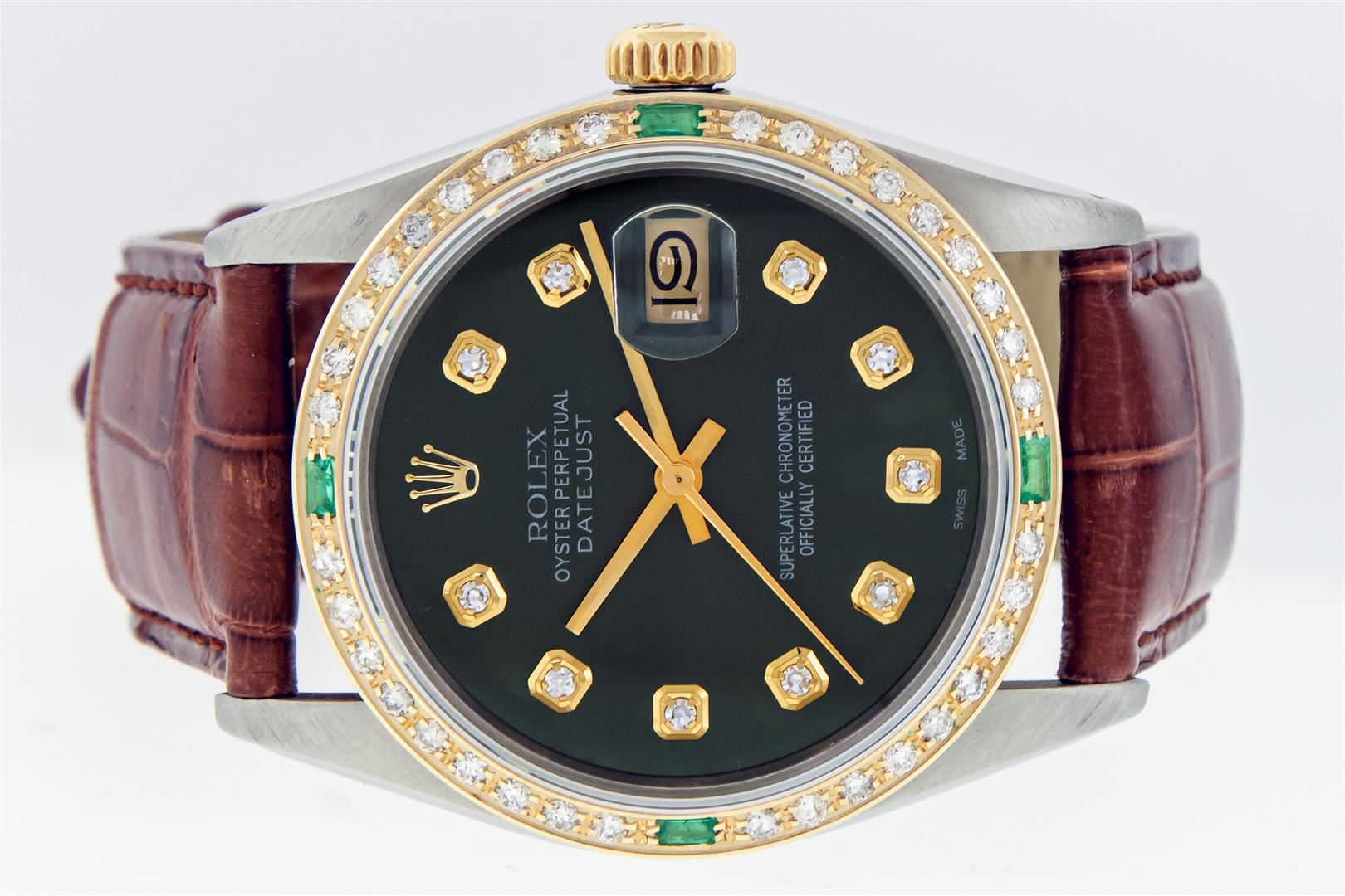 One Men's Yellow Gold Two Tone Rolex Datejust Polished, Serviced & Electronically Tested, Yellow Gold & Stainless Steel Case: 36mm, Rolex Yellow Gold Crown, Custom Bezel: New 18K Yellow Gold Emerald Beadset Diamond Bezel, Diamond Count: 36 Diamonds + 4 Emeralds In Bezel, Total Bezel Weight 1.00 Carat, Clarity: SI-VS, Color: G to H. Custom Crystal: New Sapphire With Magnified Date Window. Custom Hands: New Luminescent Hands. Rolex Movement: Automatic Winding Movement. Custom Dial: Refinished To Green With Added Diamond Hour Markers. Date Window: 3 O'clock Position Date Display, Quickset, Model: Datejust. Condition: G-6 Extra Fine. Custom Band: New Brown Leather Band 7.0 Inch Length. New Custom Pin Buckle Clasp. This Pre Owned Watch Has Been Serviced Time Tested And Is In Excellent Condition It Is Free Of All Scratches And Dents.