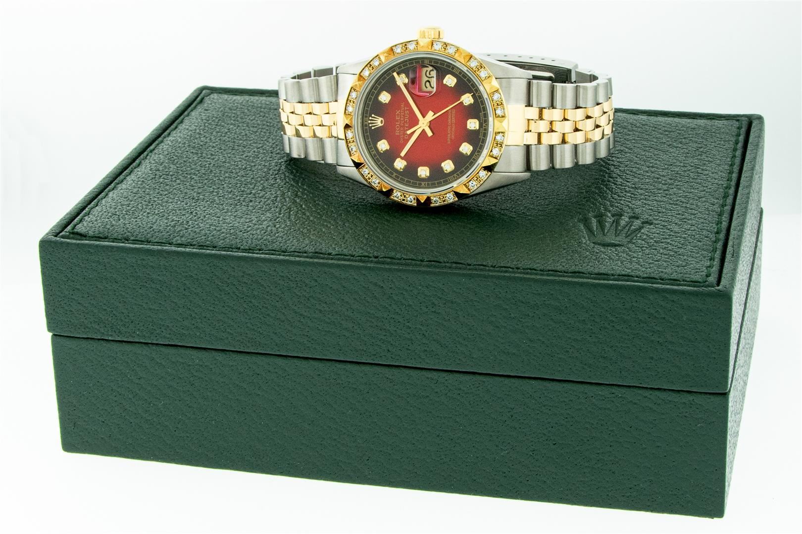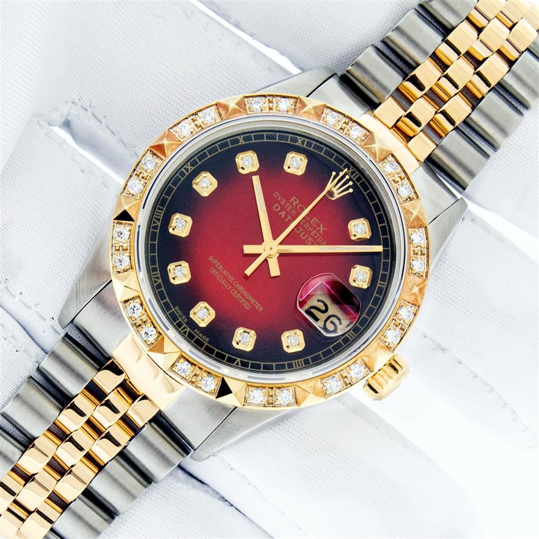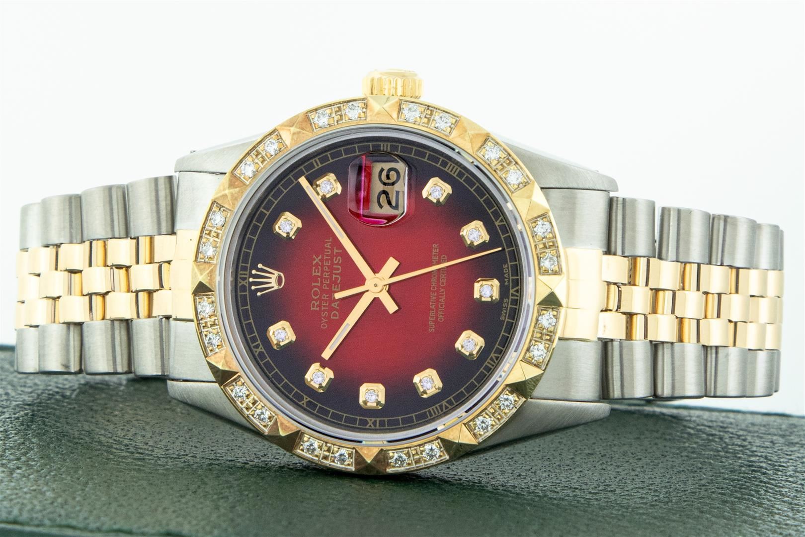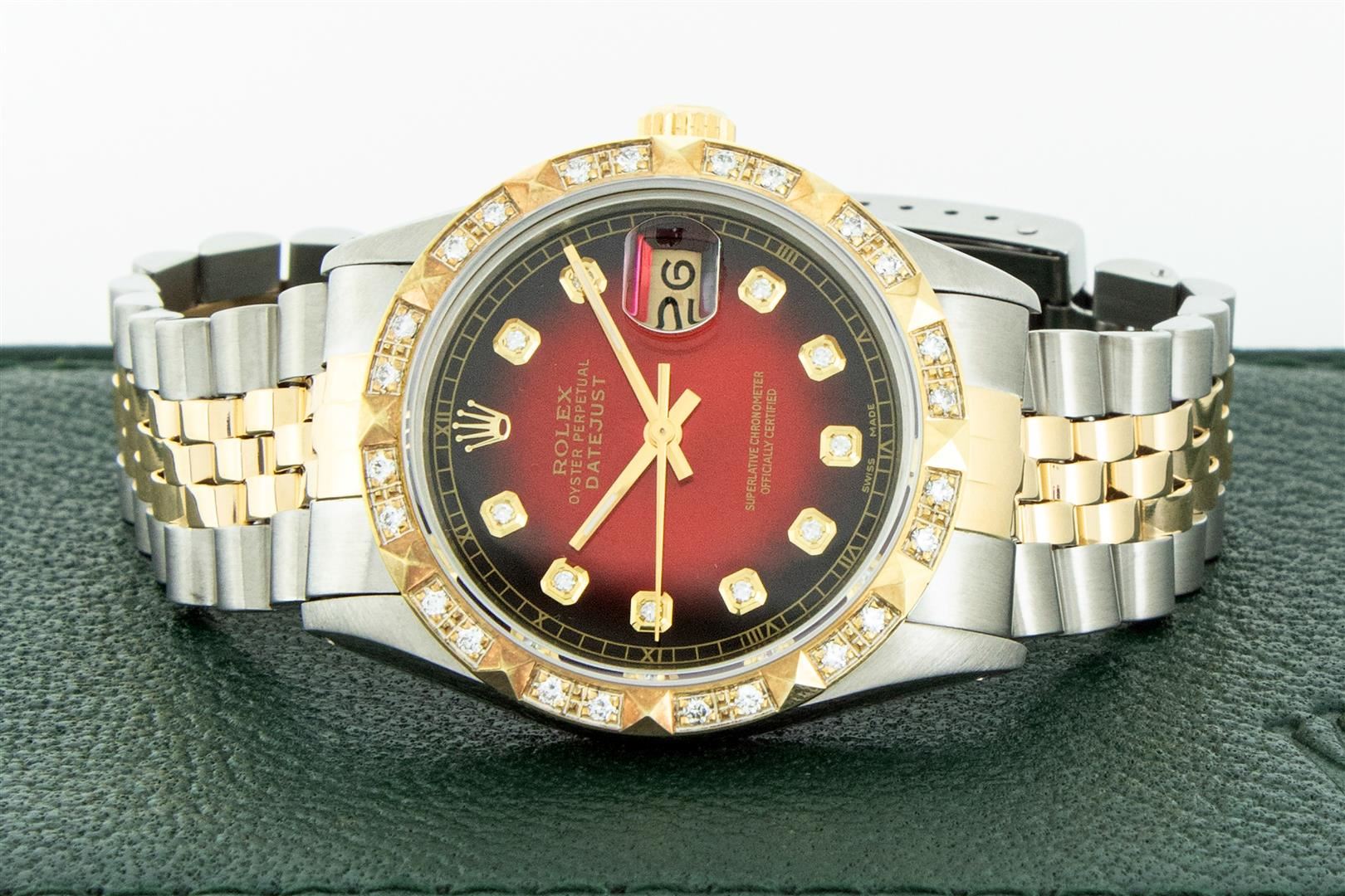 One Men's Yellow Gold Rolex Datejust Polished Bright with Satin Finish, Serviced & Electronically Tested, Stainless Steel Case: 36mm, Rolex Yellow Gold Crown, Custom Bezel: New 18K Yellow Gold Pyramid Diamond Bezel, Diamond Count: 24 Diamonds, Total Weight .75 Carat, Clarity: SI-VS, Color: G to H. Custom Crystal: New Sapphire With Magnified Date Window. Custom Hands: New Luminescent Hands. Rolex Movement: Automatic Winding Movement. Custom Dial: Refinished To Red Vignette With Added Diamond Hour Markers: 10 Diamonds In Dial, Color: G to H, Clarity: VS. Date Window: 3 O'clock Position Date Display, Quickset, Model: Datejust. Condition: G-6 Extra Fine. Rolex Bracelet: Yellow Gold And Stainless Steel Jubilee Band. Bright Polish & Satin Finish. 7.0 Inch Length, Adjustable. Standard Clasp, With Rolex Logo. This Pre Owned Watch Has Been Serviced And Polished It Is Free Of All Scratches And Dents. This Watch Comes With A Rolex Box.
