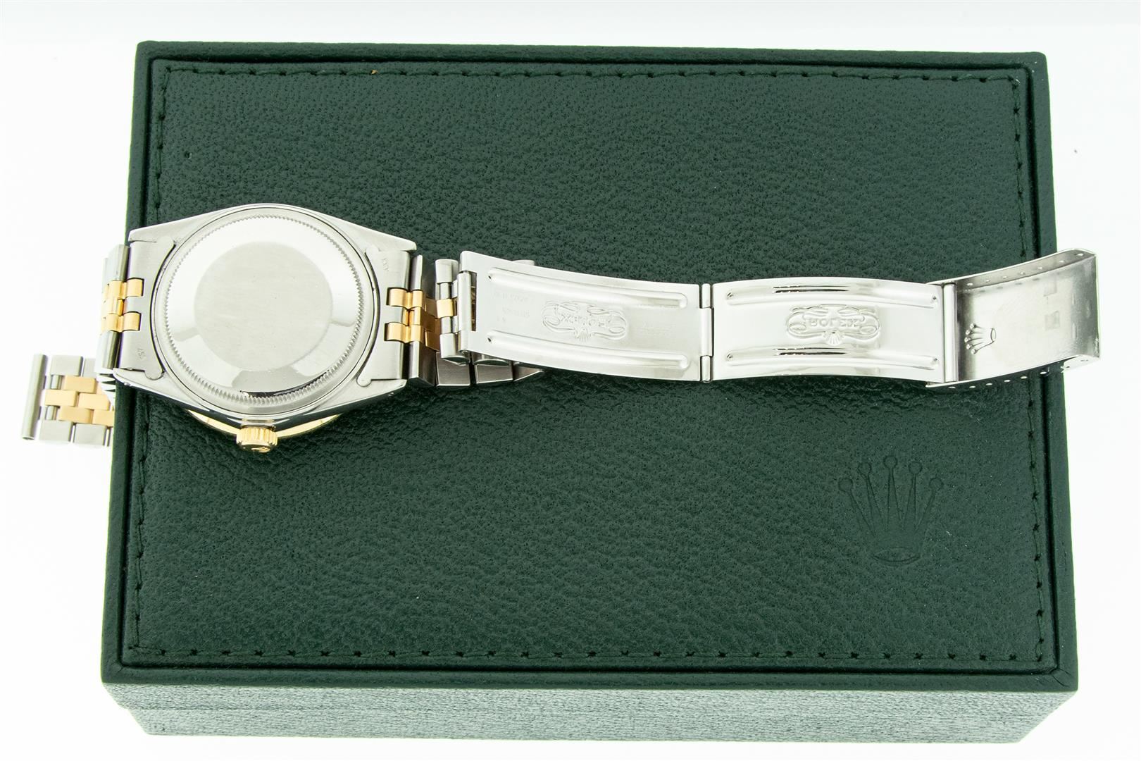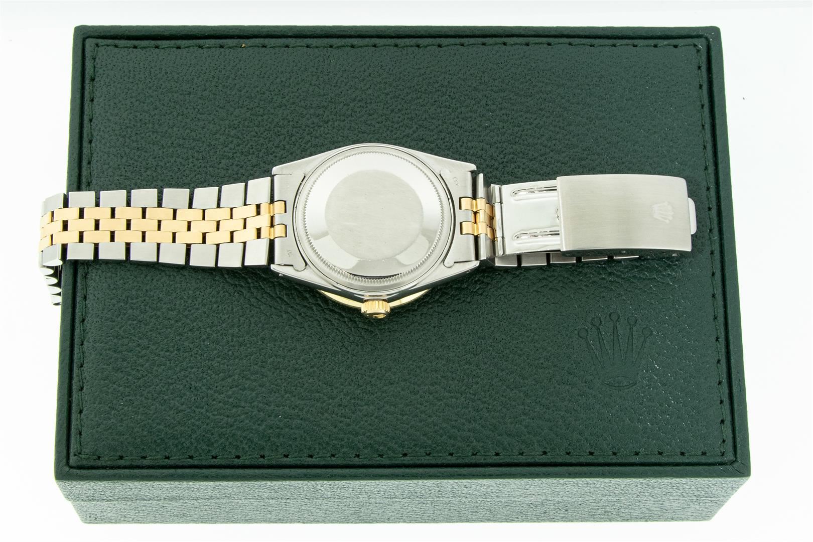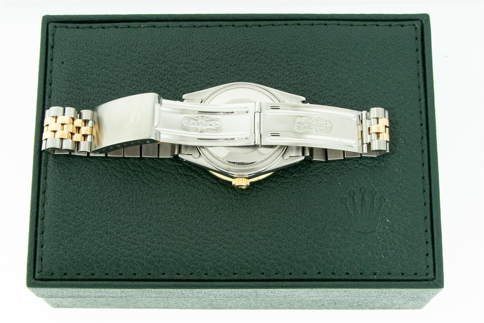 One Men's Yellow Gold Rolex Datejust Polished Bright with Satin Finish, Serviced & Electronically Tested, Stainless Steel Case: 36mm, Rolex Yellow Gold Crown, Custom Bezel: New 18K Yellow Gold Pyramid Diamond Bezel, Diamond Count: 24 Diamonds, Total Weight .75 Carat, Clarity: SI-VS, Color: G to H. Custom Crystal: New Sapphire With Magnified Date Window. Custom Hands: New Luminescent Hands. Rolex Movement: Automatic Winding Movement. Custom Dial: Refinished To Red Vignette With Added Diamond Hour Markers: 10 Diamonds In Dial, Color: G to H, Clarity: VS. Date Window: 3 O'clock Position Date Display, Quickset, Model: Datejust. Condition: G-6 Extra Fine. Rolex Bracelet: Yellow Gold And Stainless Steel Jubilee Band. Bright Polish & Satin Finish. 7.0 Inch Length, Adjustable. Standard Clasp, With Rolex Logo. This Pre Owned Watch Has Been Serviced And Polished It Is Free Of All Scratches And Dents. This Watch Comes With A Rolex Box.